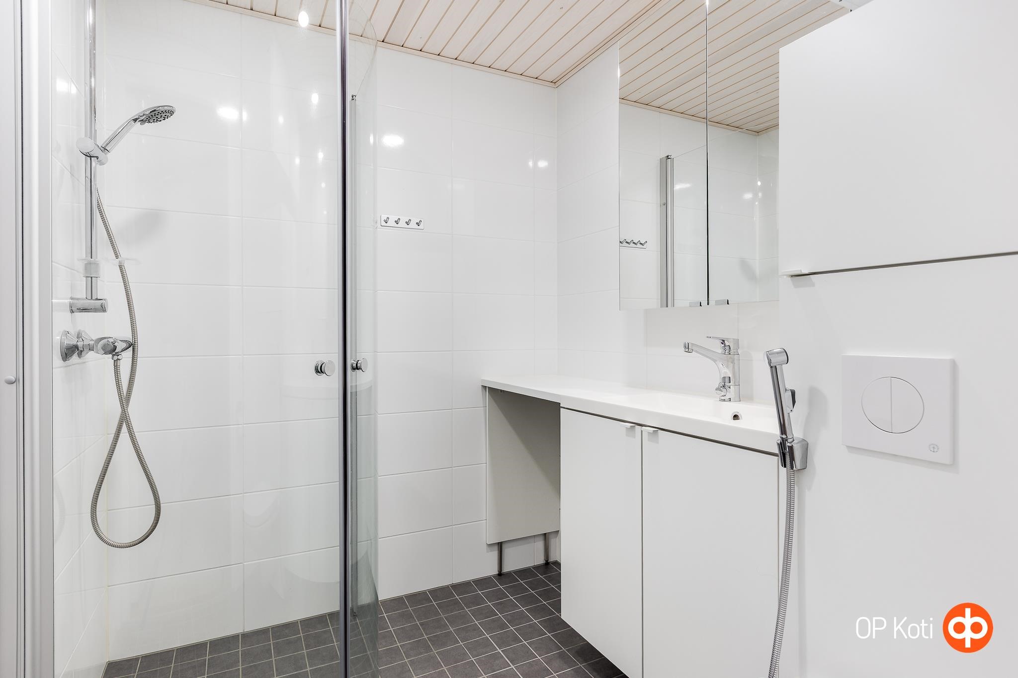 - Kylpyhuone, suihku, suihkuseinä, peilikaappi, kaapit, allaskaappi, pesukoneliitäntä, lattialämmitys, kiinteät valaisimet.