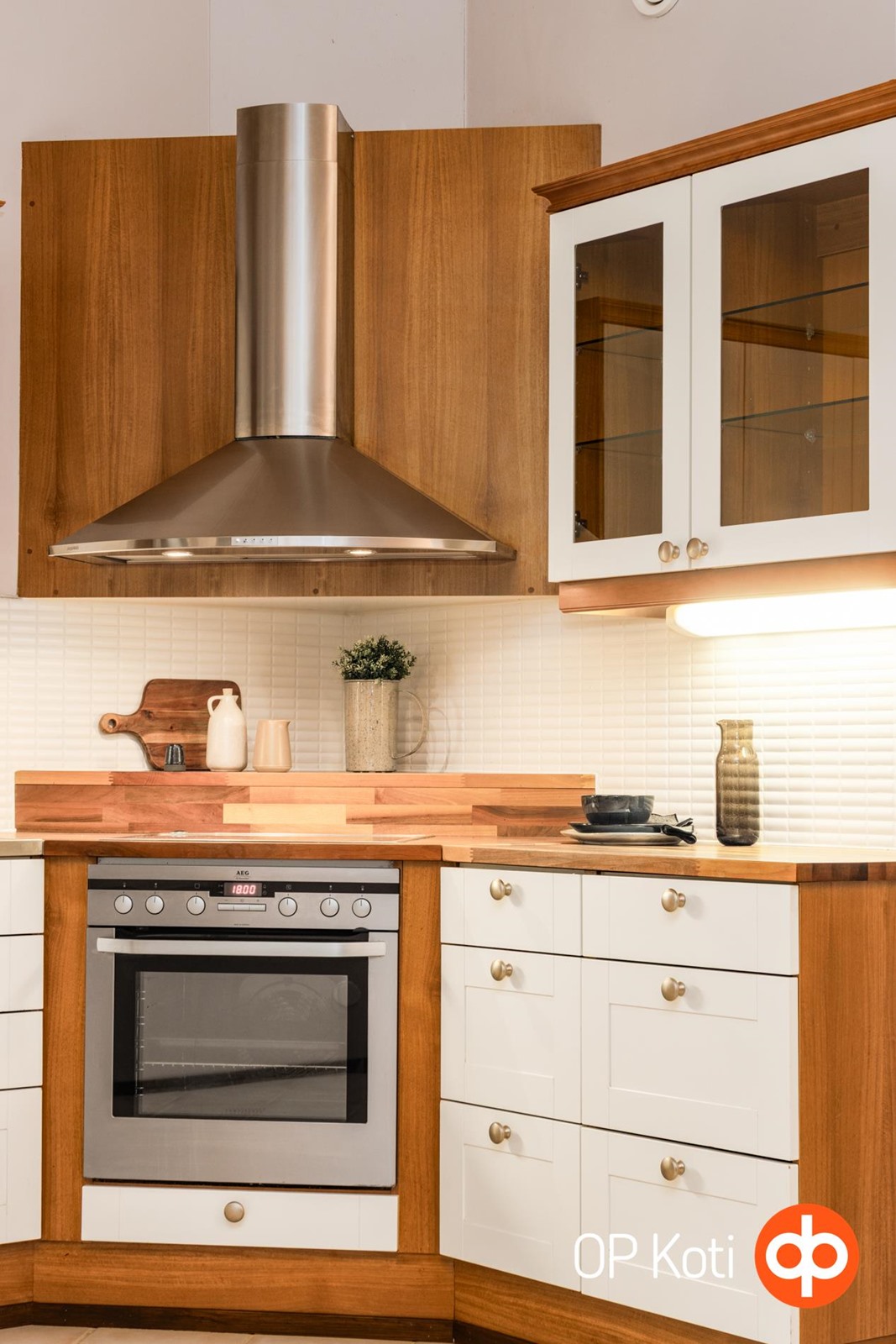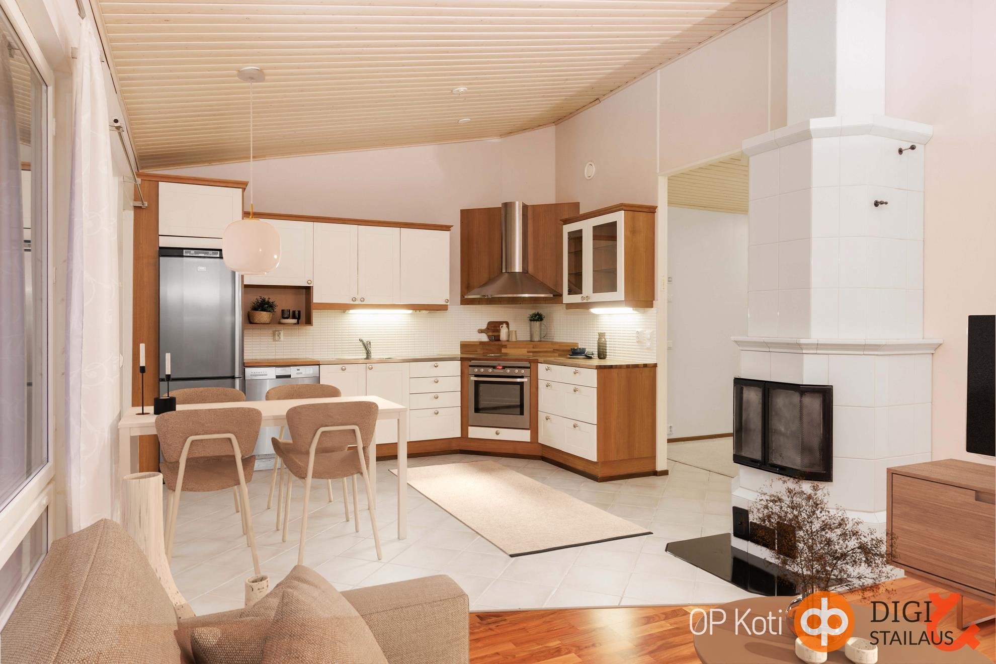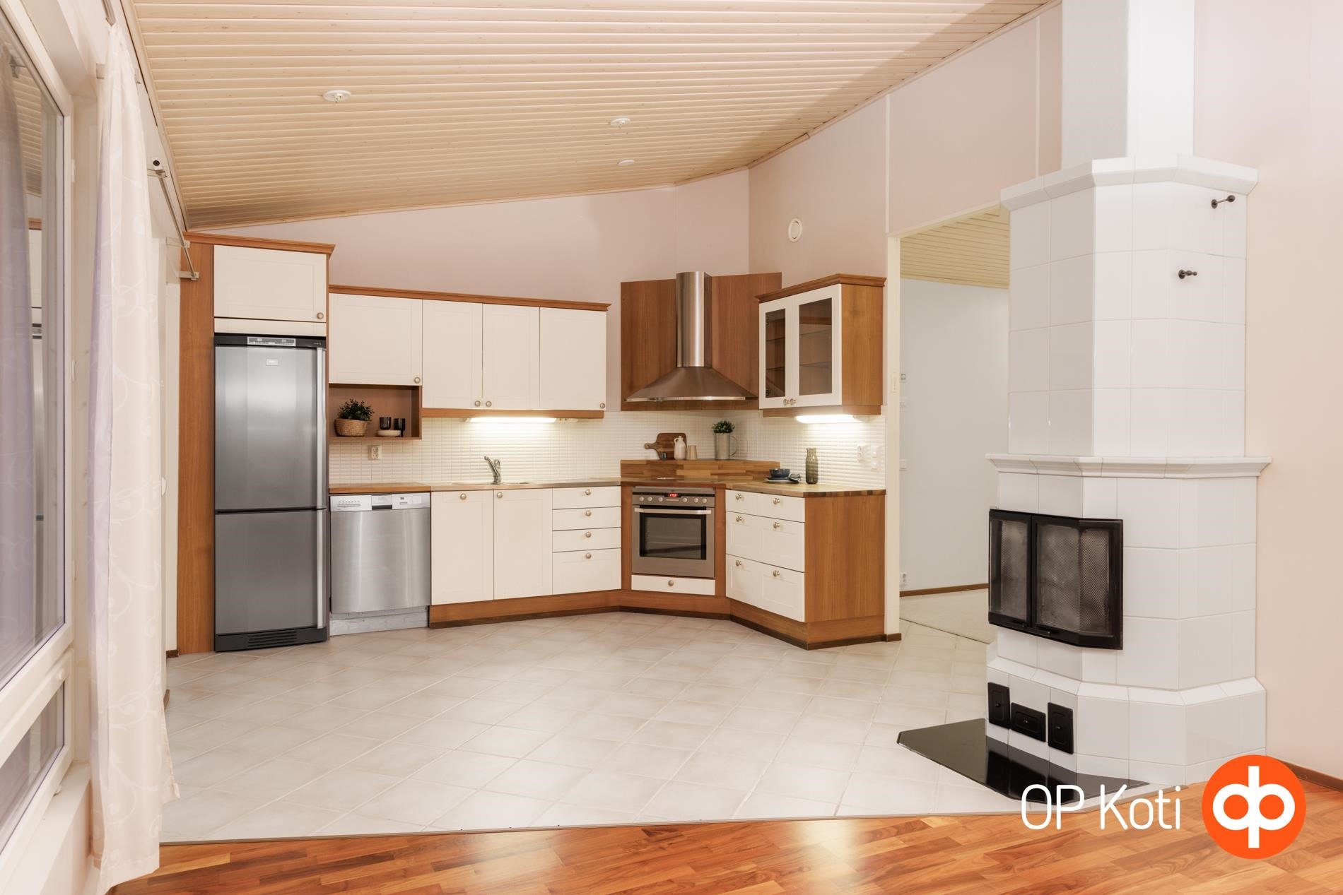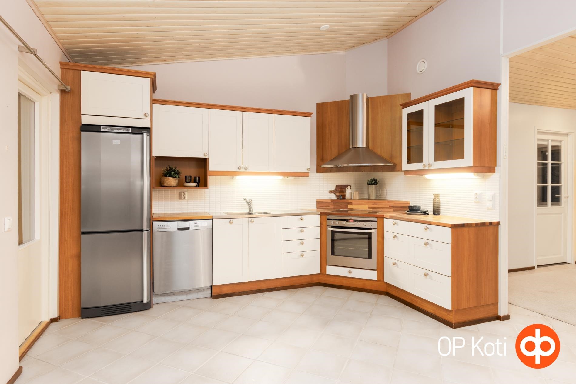 - Jääkaappipakastin, erillisuuni, liesitaso, liesituuletin, astianpesukone, kaapistot, kiinteät valaisimet.