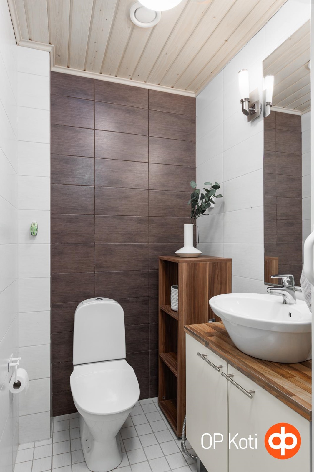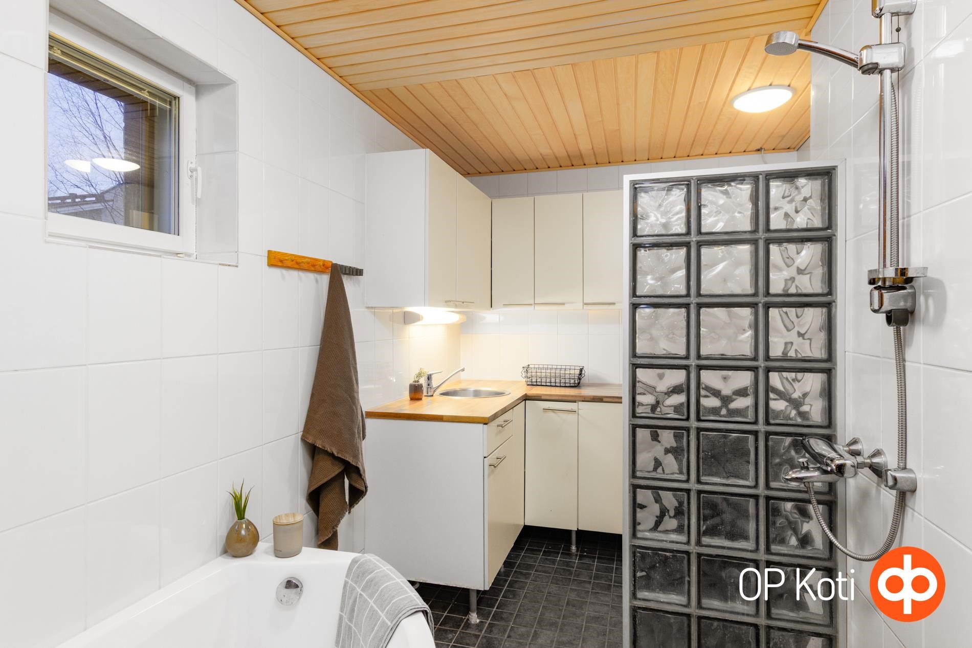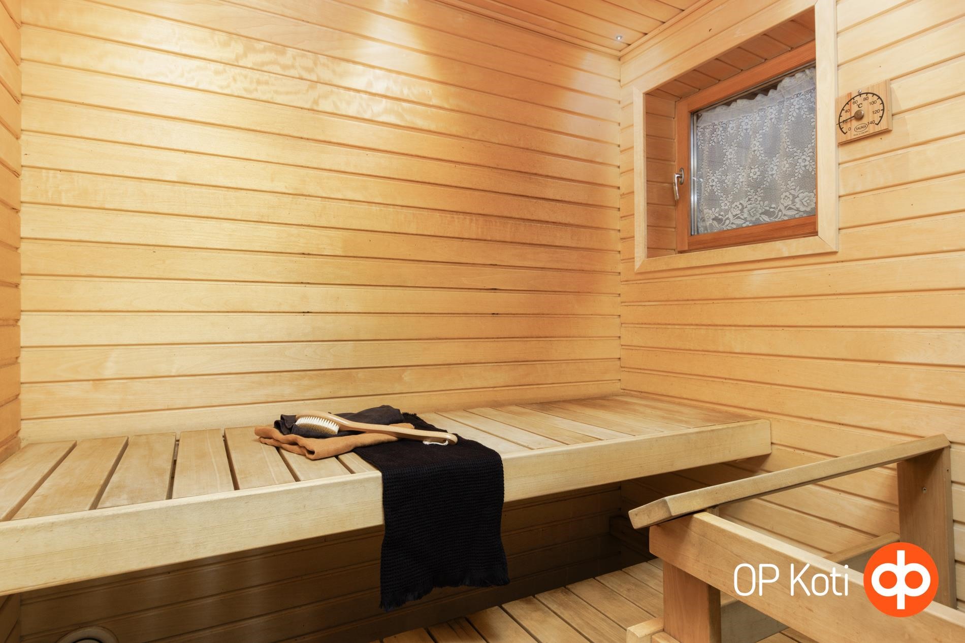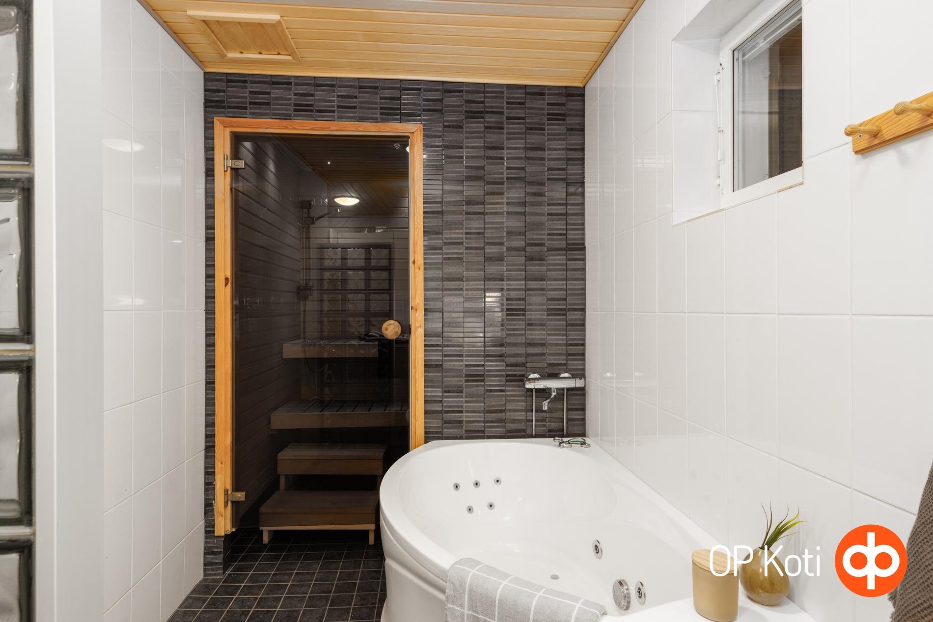- Sauna, sähkökiuas, kylpyhuone, erillinen wc, suihku, suihkuseinä, poreallas, peilit, allaskaappi, pesukoneliitäntä, lattialämmitys, kiinteät valaisimet.