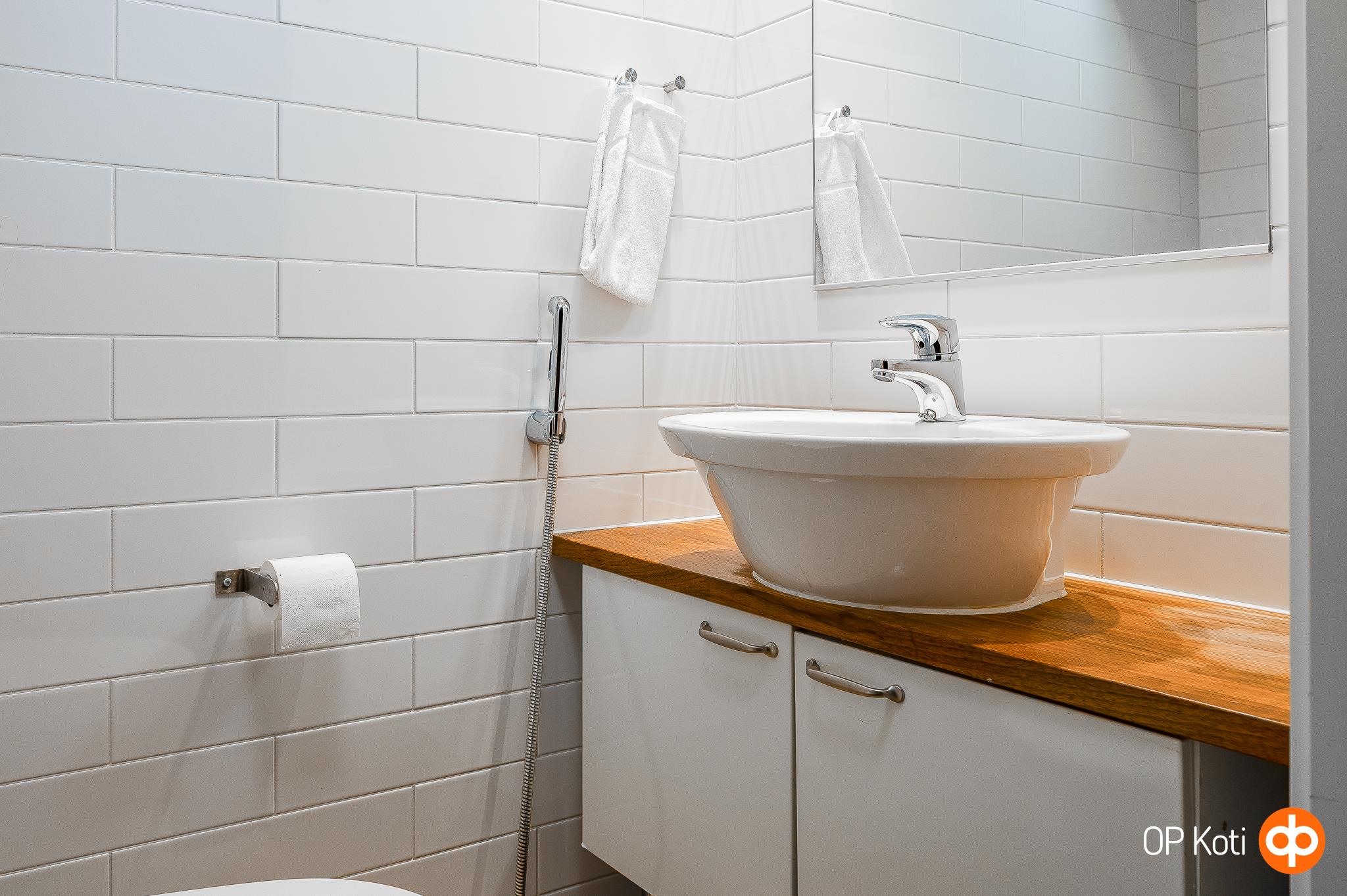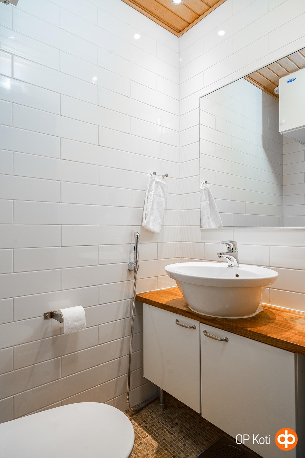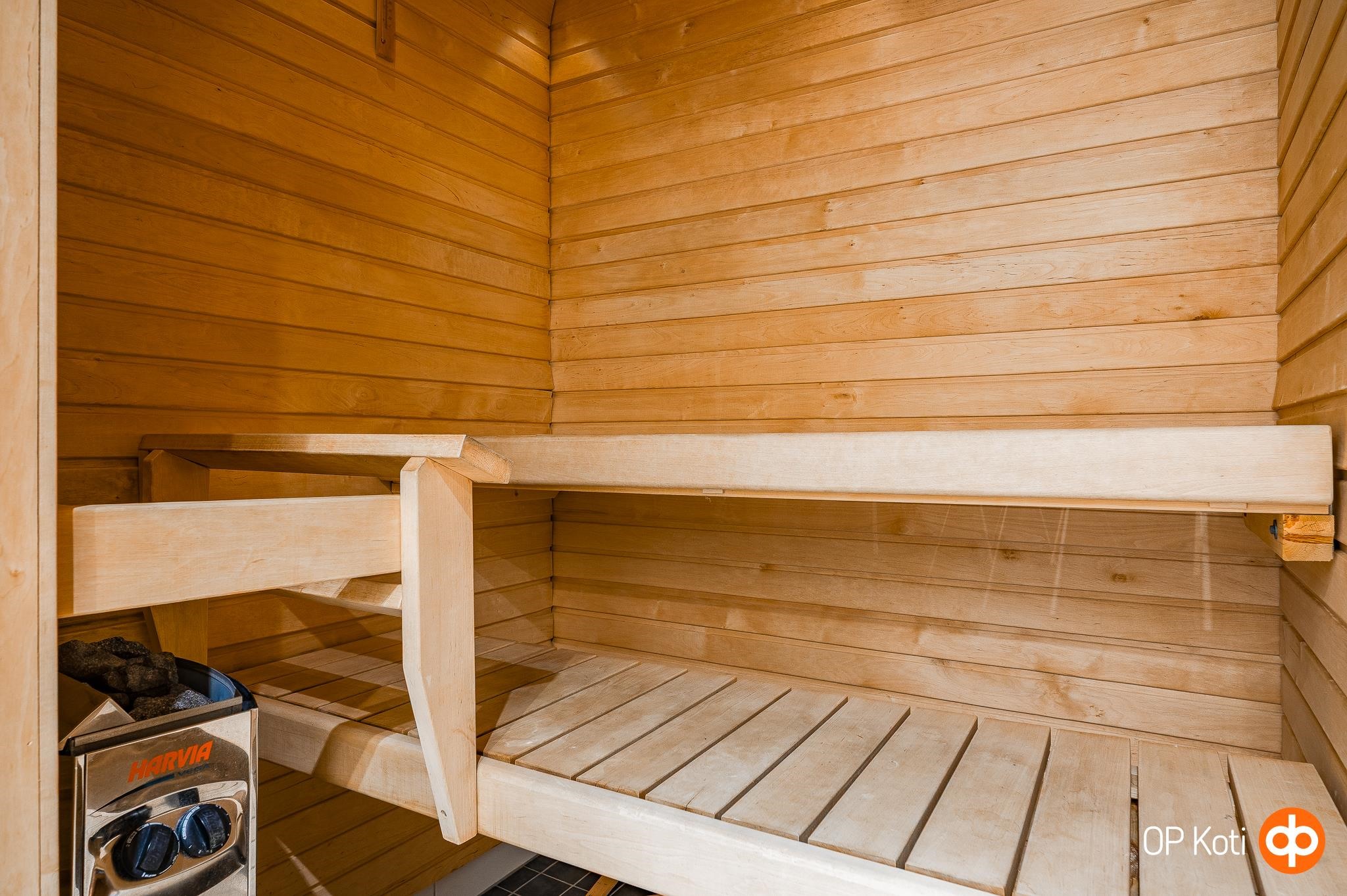 - Sauna, sähkökiuas, erillinen wc, suihku, peilikaappi, pesukoneliitäntä, lattialämmitys, kiinteät valaisimet.