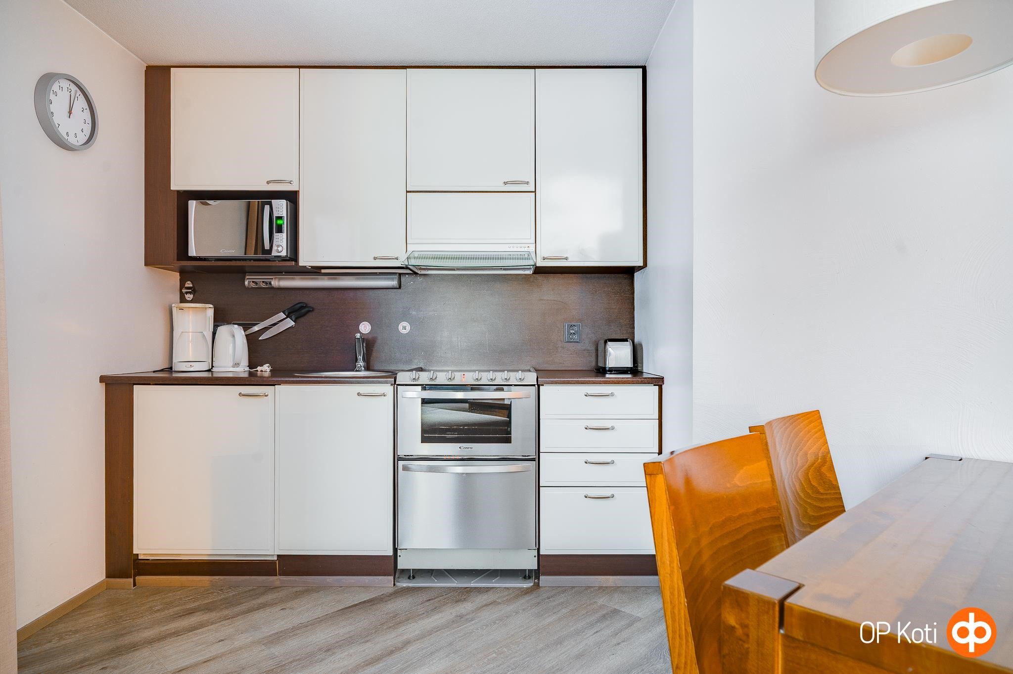 - Jääkaappi, erillisuuni, keraaminen liesi, liesikupu, mikroaaltouuni, astianpesukone, kaapistot, irralliset kaapistot, kiinteät valaisimet. Astiasto