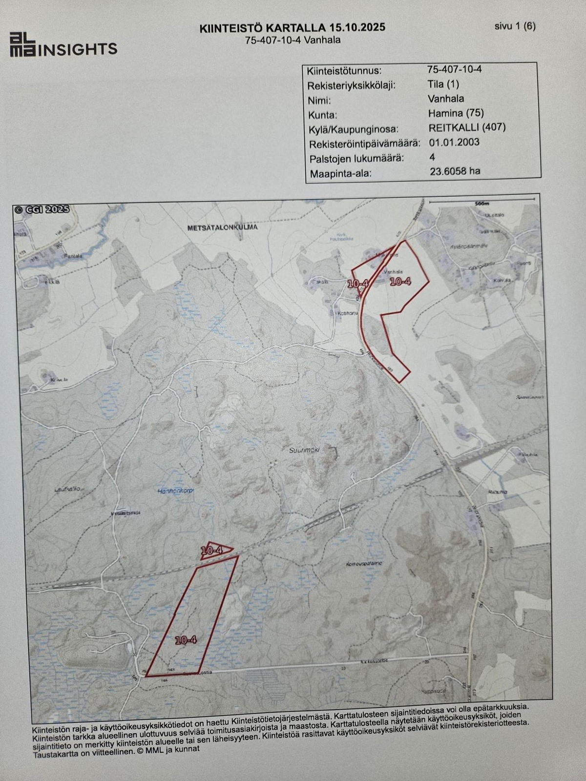 Unelmapaikka maalaismasemissa, suuri tila Haminan Reitkallissa Tule tutustumaan idylliseen hirsitaloon ja laajaan, yli 23 hehtaarin tilaan Haminan Reitkallissa! Tämä vanha maatila tarjoaa mahdollisuuden rauhalliseen maaseutuasumiseen tai vapaa ajan viettoon luonnon keskellä; vain noin 15 min. ajomatkan päässä Haminan keskustasta. Tilalla on peltoa (8,1 ha) ja metsää (13,8 ha), josta on tehty metsäarvio. Tie perille, sähköliittymä ja oma porakaivo. Päärakennus Vuonna 1898 valmistunut hirsirunkoinen päärakennus (n. 90 m²) huokuu vanhan ajan tunnelmaa ja lämpöä. Tuvassa on pönttöuunit ja sähköpatterilämmitys. Sähkön kulutus on ollut noin 15 000 kWh vuodessa.. Rakennuksessa on kolme makuuhuonetta, tupa, keittiö, wc ja eteinen. Pintoja on päivitetty vuosien varrella, ja useita tärkeitä remontteja on tehty: Katot uusittu (päärakennus, aitta ja entinen päärakennus) vuonna 2013 Ikkunat vaihdettu 2015 Piiput korjattu 2013 Sähköjohdot uusittu 2009 Ulko ovi vaihdettu Rakennus seisoo rossipohjalla, ja katemateriaalina on pelti. Ilmanvaihto on painovoimainen. Tilalla on useita piharakennuksia: Ulkosauna (puukiuas) Ulko WC Navettarakennus Entinen päärakennus (nykyisin varastona) Iso peltihalli. Tilavat pihapiirit tarjoavat erinomaiset mahdollisuudet esimerkiksi pienimuotoiseen maatalouteen, harrastustoimintaan, eläintenpitoon tai vaikka mökkimajoitukseen. Reitkalli sijaitsee rauhallisella maaseutualueella Haminan länsipuolella. Lähin palvelukeskittymä on Haminan keskusta, jonne ajaa noin 25 30 minuuttia. Alue on tunnettu vehreästä luonnosta, peltomaisemista ja hyväkuntoisista tieyhteyksistä. Voit ostaa myös tämän lisäksi kaksi erillistä metsäpalstaa.