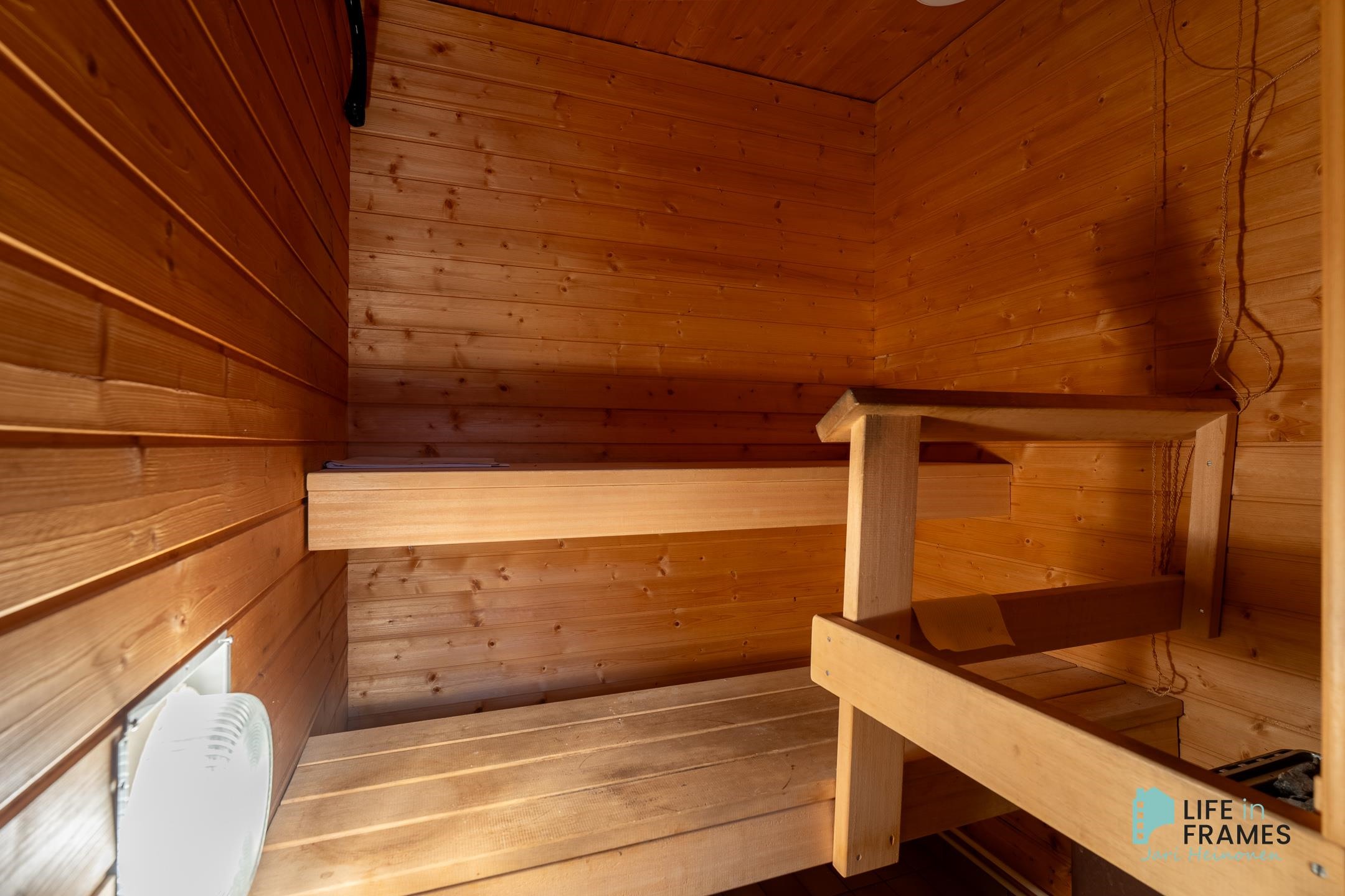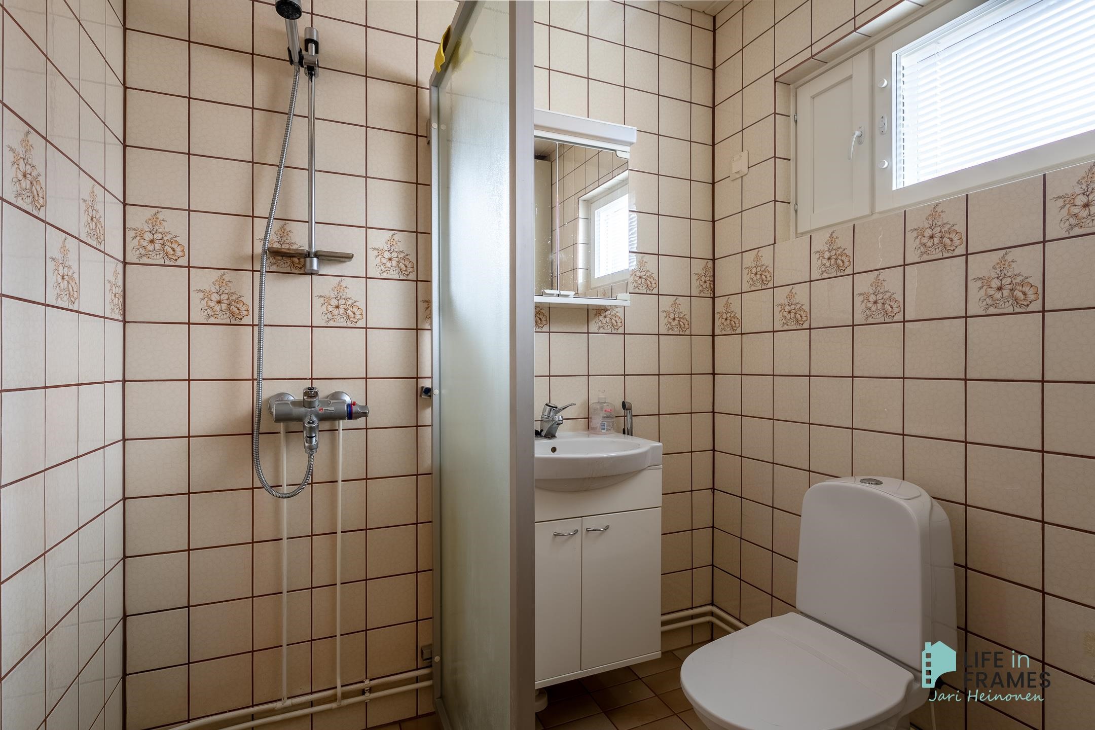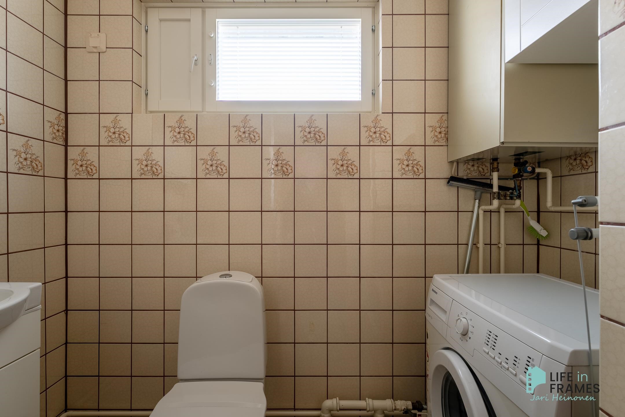 - Sauna, sähkökiuas, kylpyhuone, suihku, peilikaappi, allaskaappi, pesukoneliitäntä, lattialämmitys, kiinteät valaisimet.