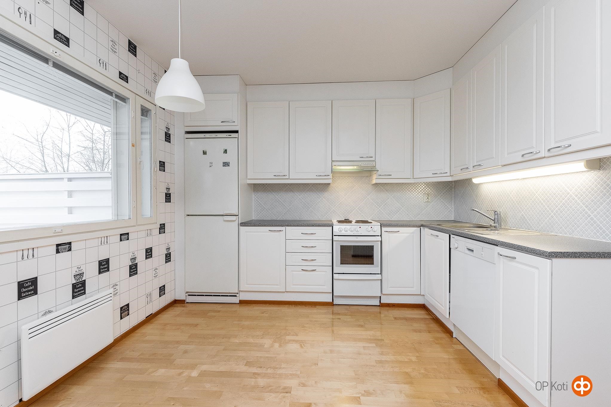 - Jääkaappipakastin, sähköliesi, liesituuletin, astianpesukone, kiinteät valaisimet.