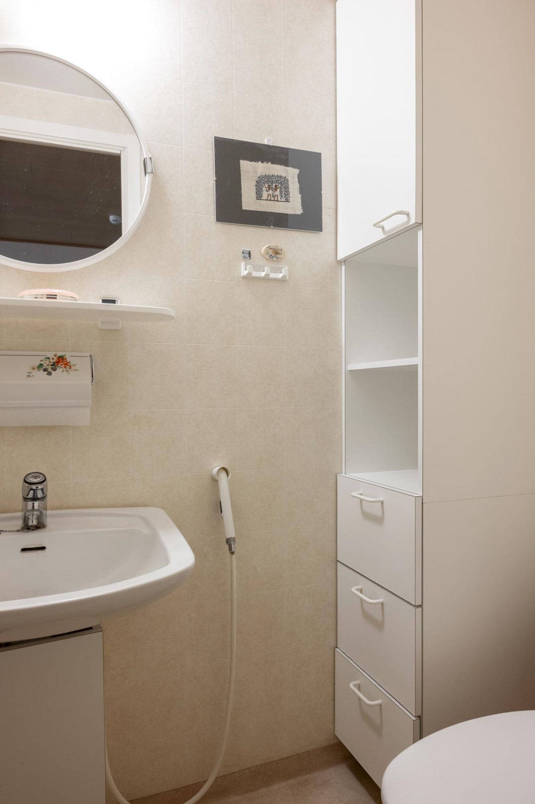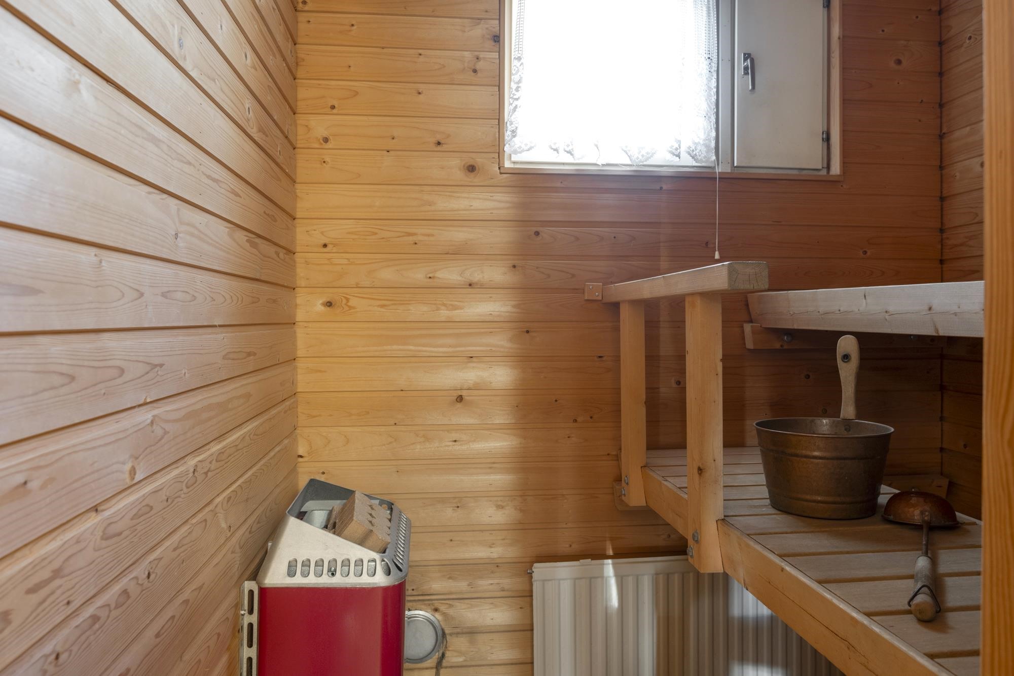 - Sauna, sähkökiuas, kylpyhuone laattaa, erillinen wc muovimatto ja seinät, peilit, kaapit, allaskaappi, pesukoneliitäntä. Alkuperäisessä kunnossa