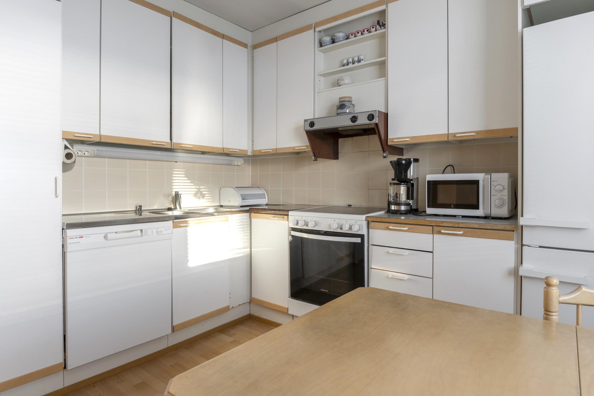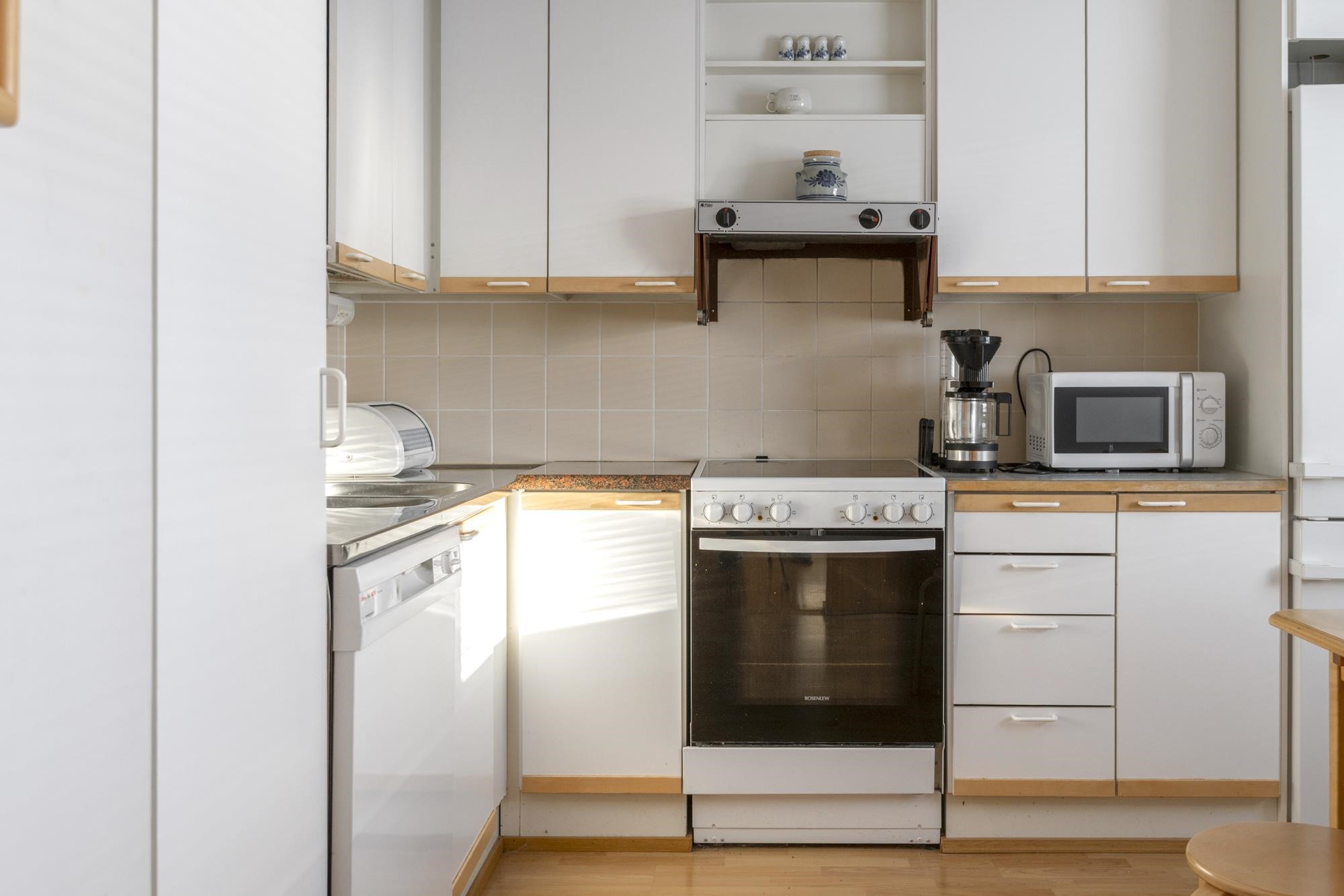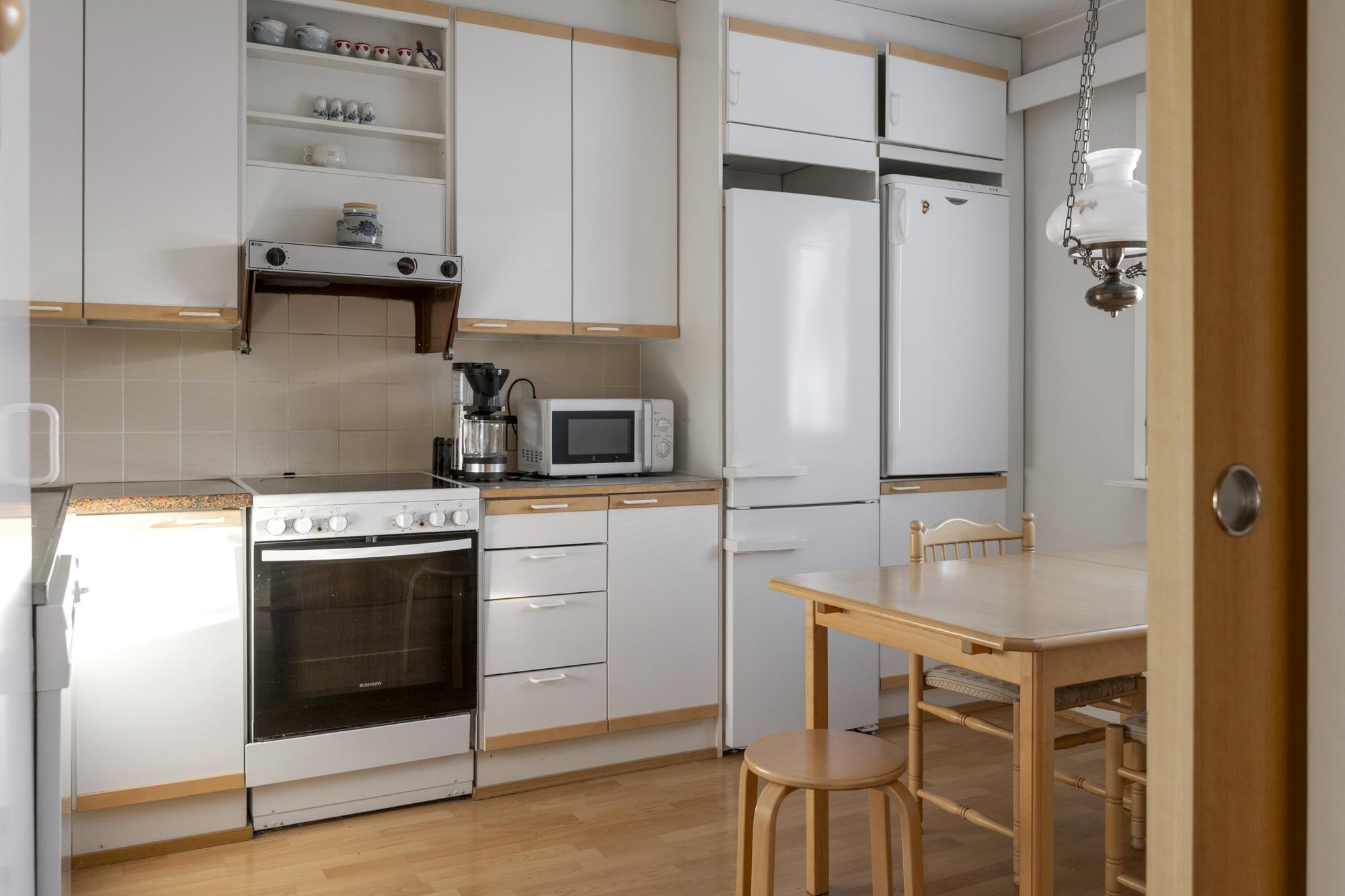 - Jääkaappipakastin, pakastekaappi, lattialiesi, keraaminen liesi, liesituuletin, astianpesukone, kaapistot.