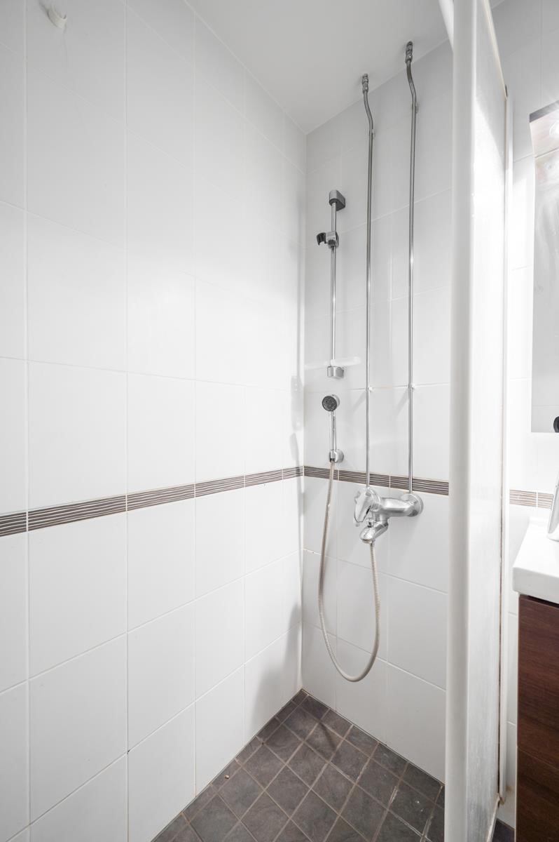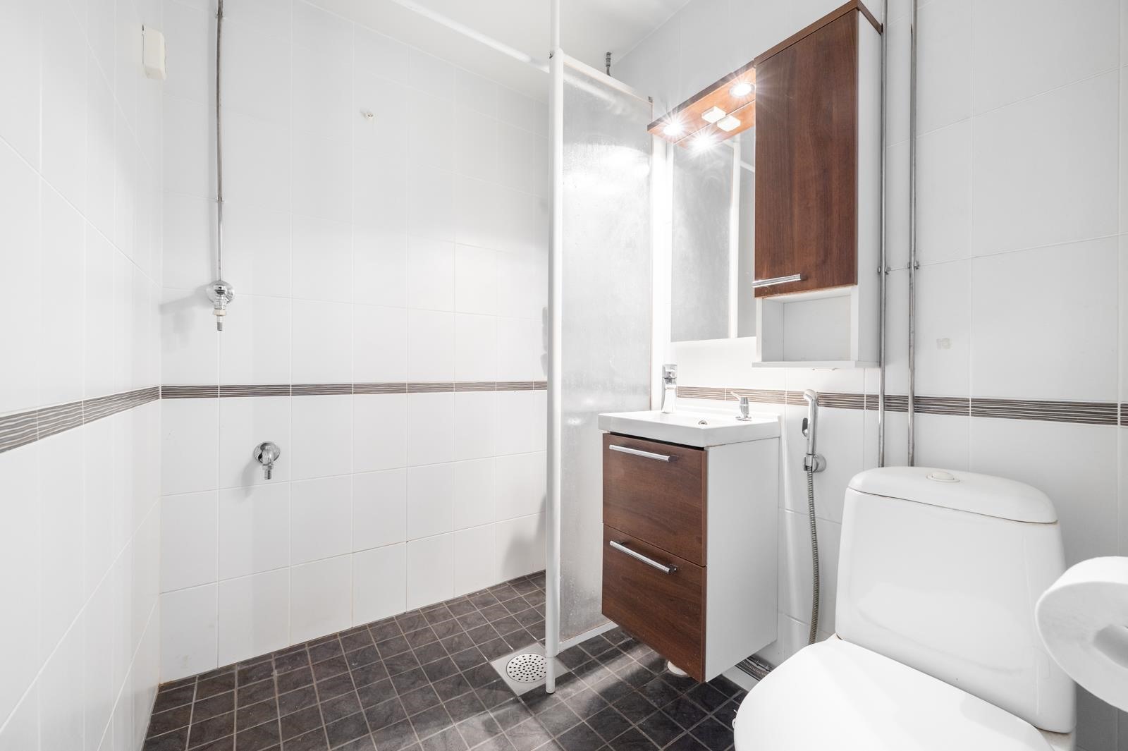- Kylpyhuone, suihku, suihkuseinä, peilit, kaapit, allaskaappi, pesukoneliitäntä, lattialämmitys, kiinteät valaisimet.