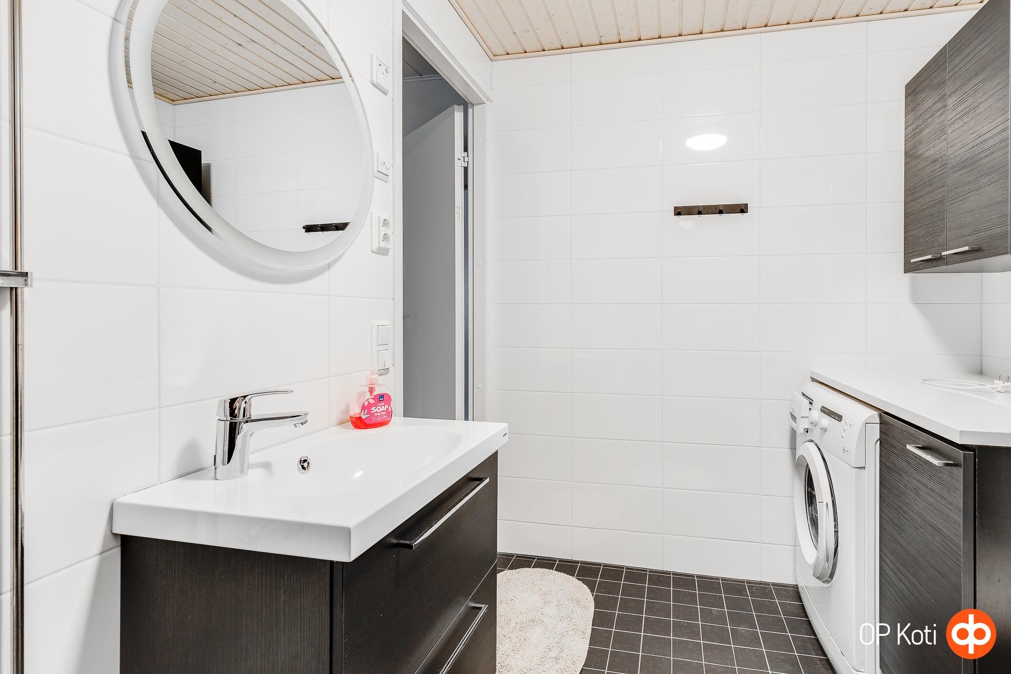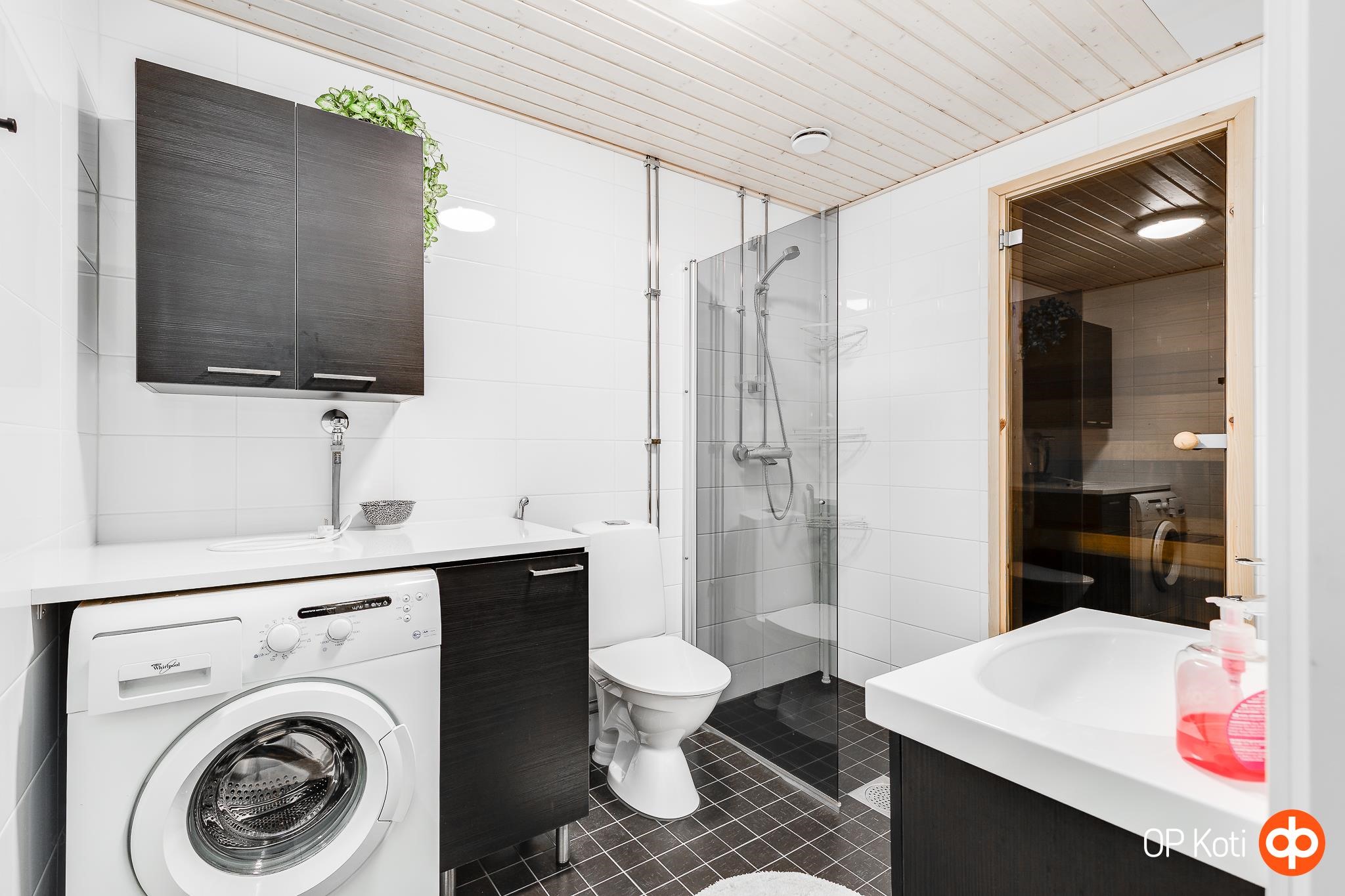 - Sauna, sähkökiuas, suihku, suihkuseinä, peilit, allaskaappi, pesukoneliitäntä, kiinteät valaisimet. Kylpyhuoneen kaapisto . Remontoitu putkiremontin yhteydessä 2020 sauna ja pesuhuone.