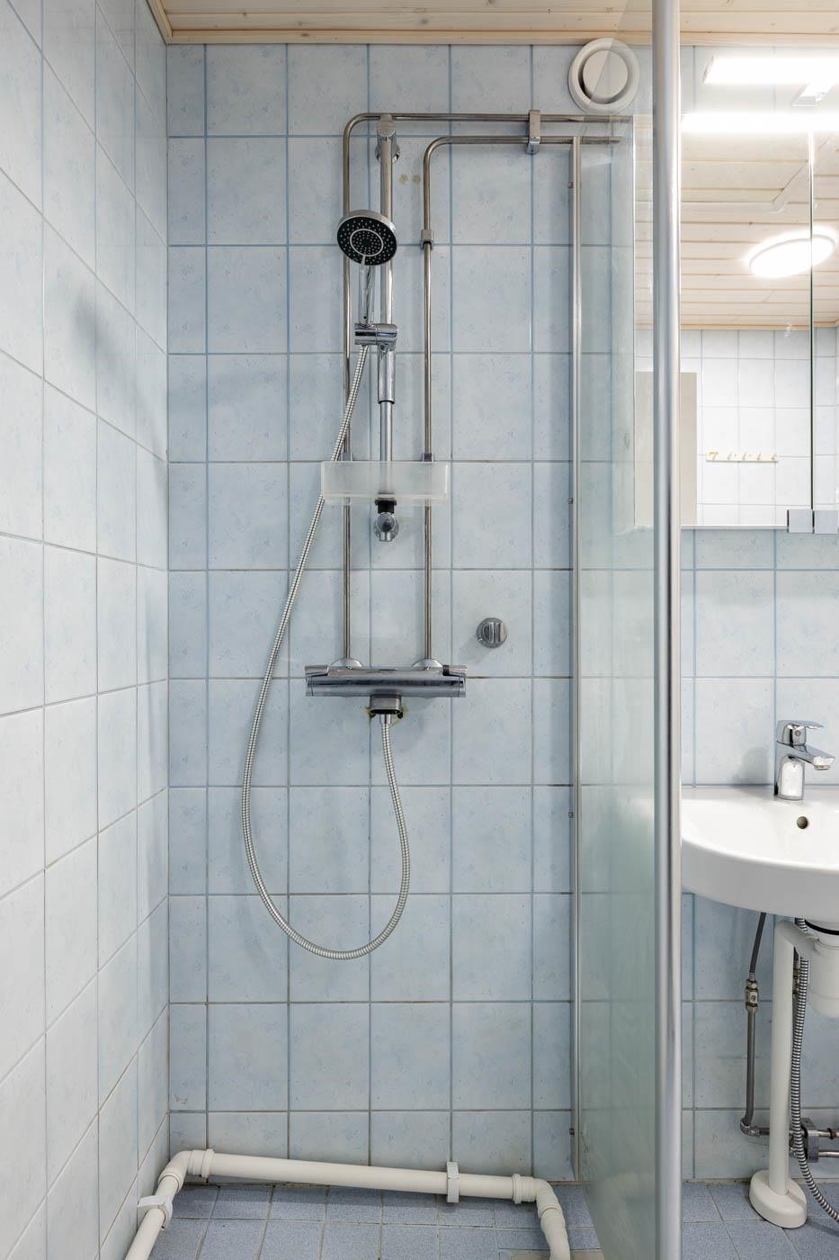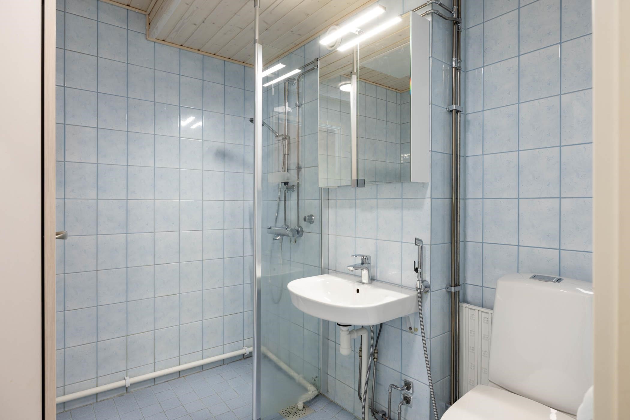 - Kylpyhuone, suihku, suihkuseinä, peilikaappi, kaapit (korkea kaappi), pesukoneliitäntä, kiinteät valaisimet. Kylpyhuonetta ei ole remontoitu LVIS saneerauksen yhteydessä.