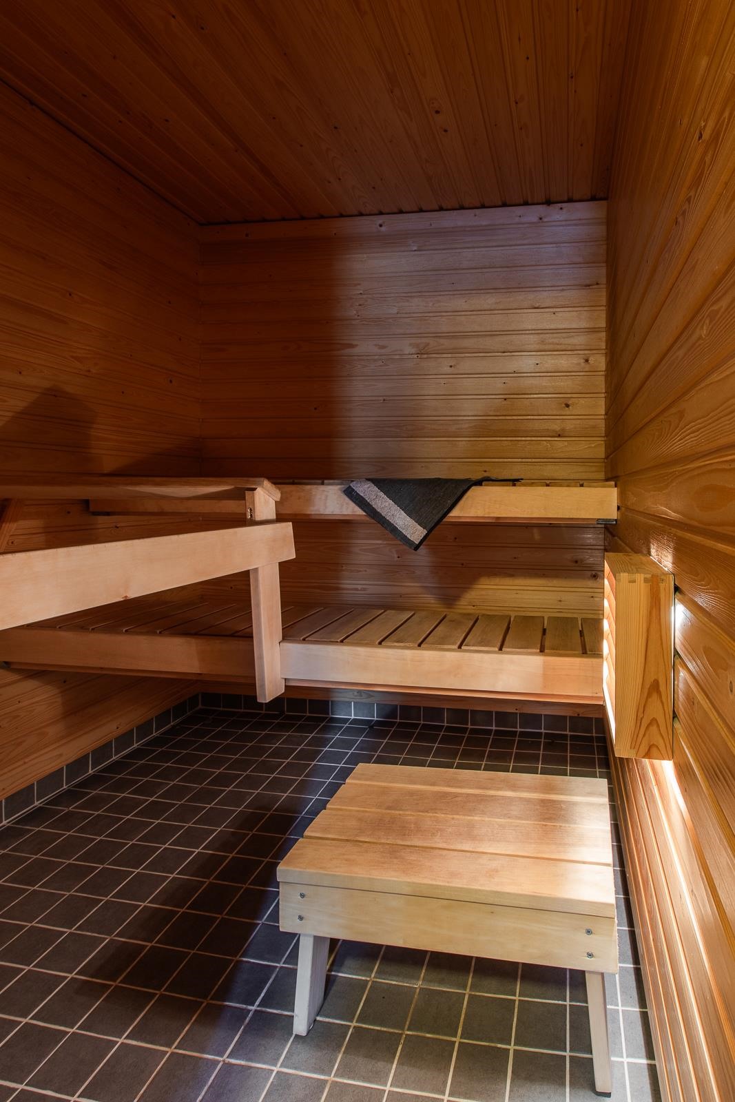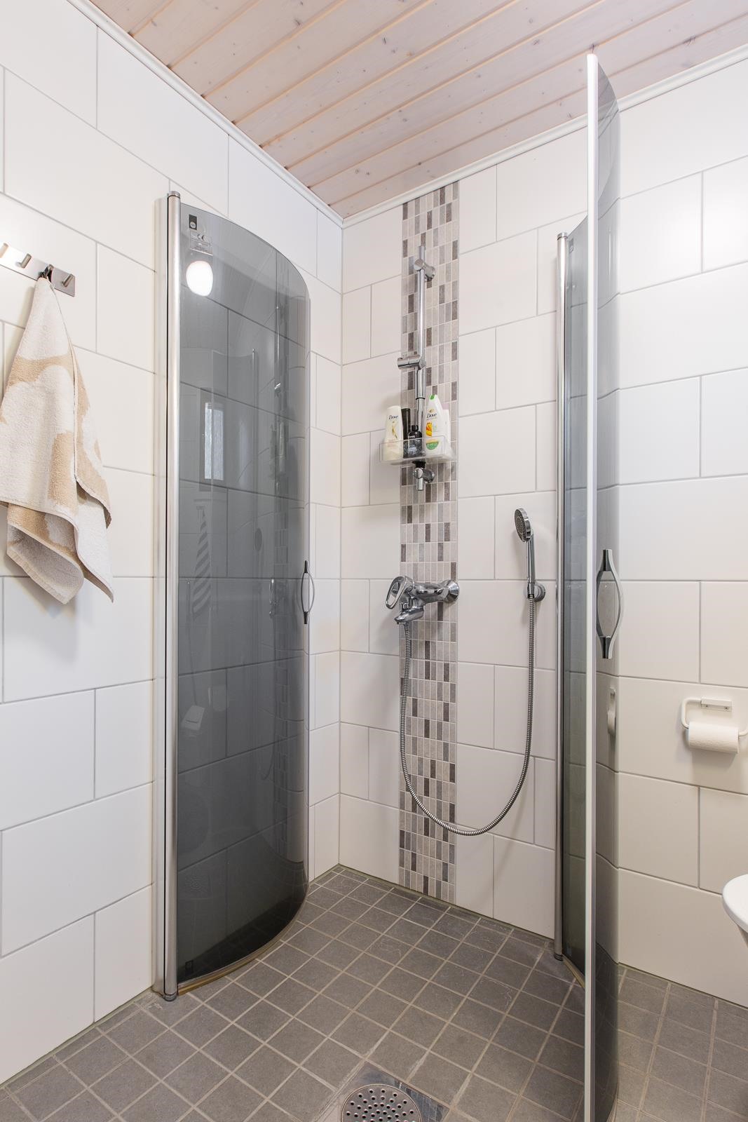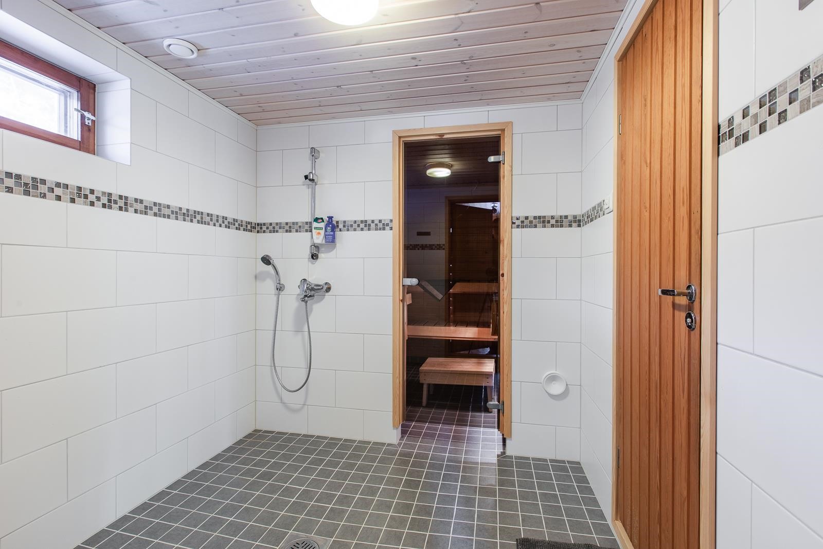 - Saunaosasto on remontoitu kokonaan 2017. Kylpyhuoneessa on suihku. Saunassa on sähköllä lämpiävä kiuas. Kylpyhuoneen vieressä on erillinen wc. Yläkerrassa on 2015 remontoitu wc, jossa on myös suihku. Alakerran ja yläkerran kylpyhuoneissa on lattialämmitys sähköllä. Alakerran tilava ala-aula on piirustusten mukaan kodinhoitohuone. Ko tilassa on puuhella/leivinuuni ja liukuoven takana tilava paikka pyykinpesukoneelle ja muulle kodin vaatehuollolle. Kylpyhuoneessa on laatoitus sekä seinissä että lattiassa. Saunassa on laatoitus lattiassa ja seinissä paneeli. Myös yläkerran kylpyhuoneessa on laatoitus sekä seinissä että lattiassa.