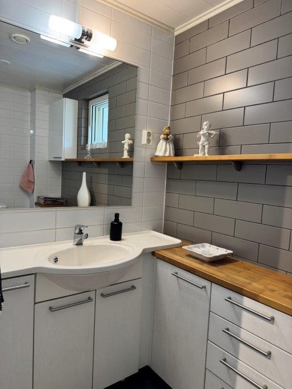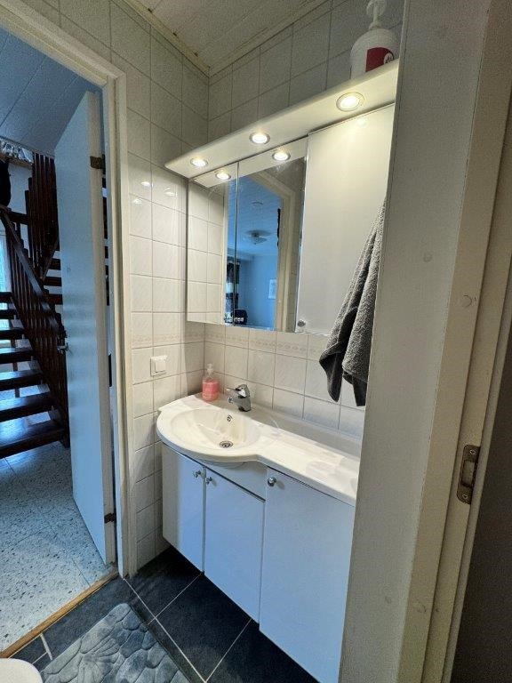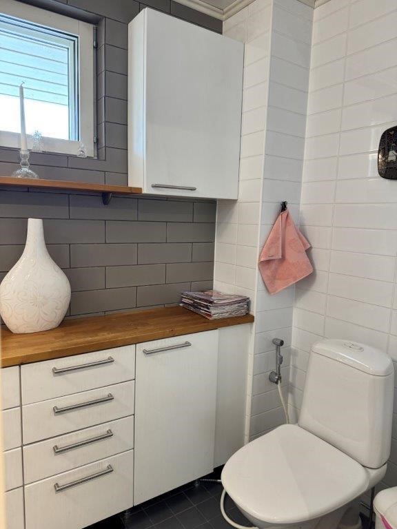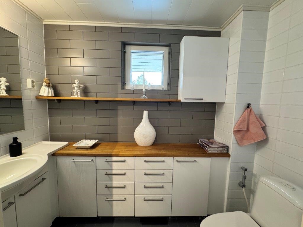 - Sauna, sähkökiuas, kylpyhuone, erillinen wc, suihku, peilit, peilikaappi, kaapit, allaskaappi, pesukoneliitäntä Kodinhoitohuoneessa, lattialämmitys khh, wc, ph, s, kiinteät valaisimet.