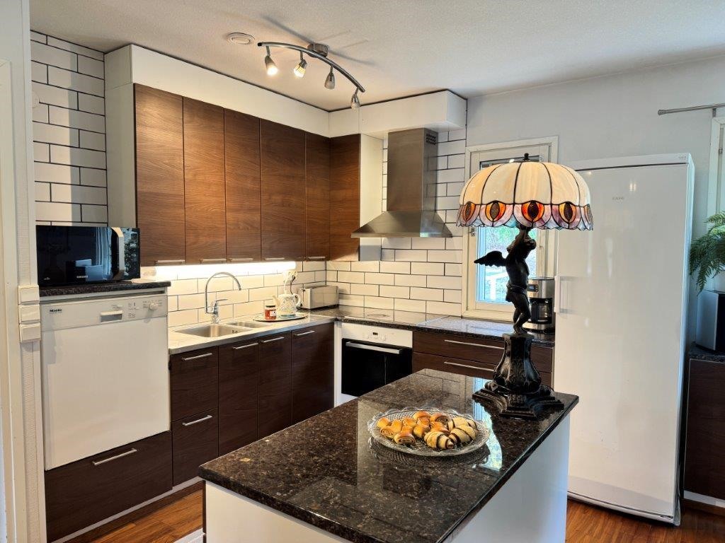 - Jääkaappi, pakastekaappi, erillisuuni, induktioliesi, liesituuletin, leivinuuni, astianpesukone, kaapistot, kiinteät valaisimet, pöytätasojen materiaali.