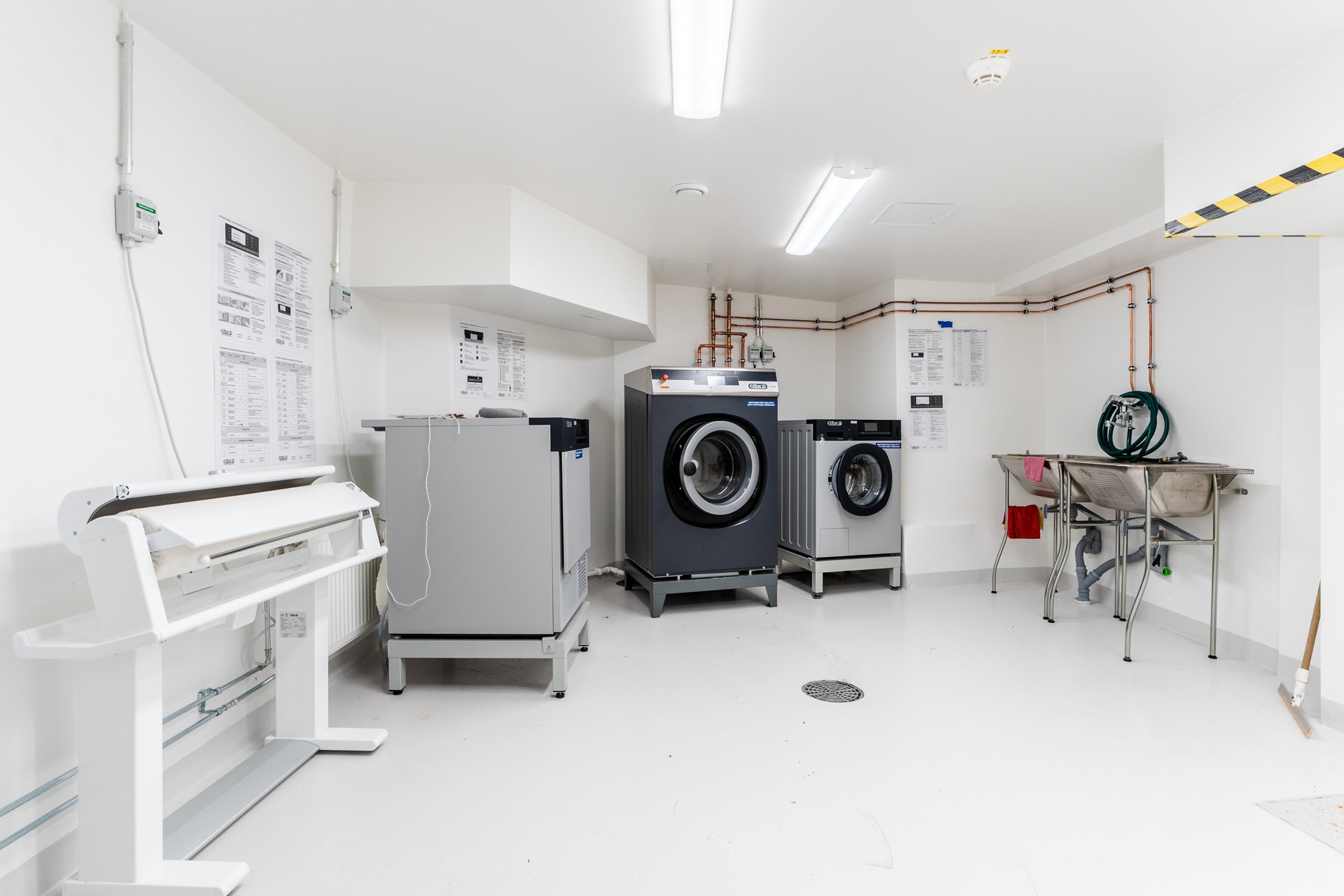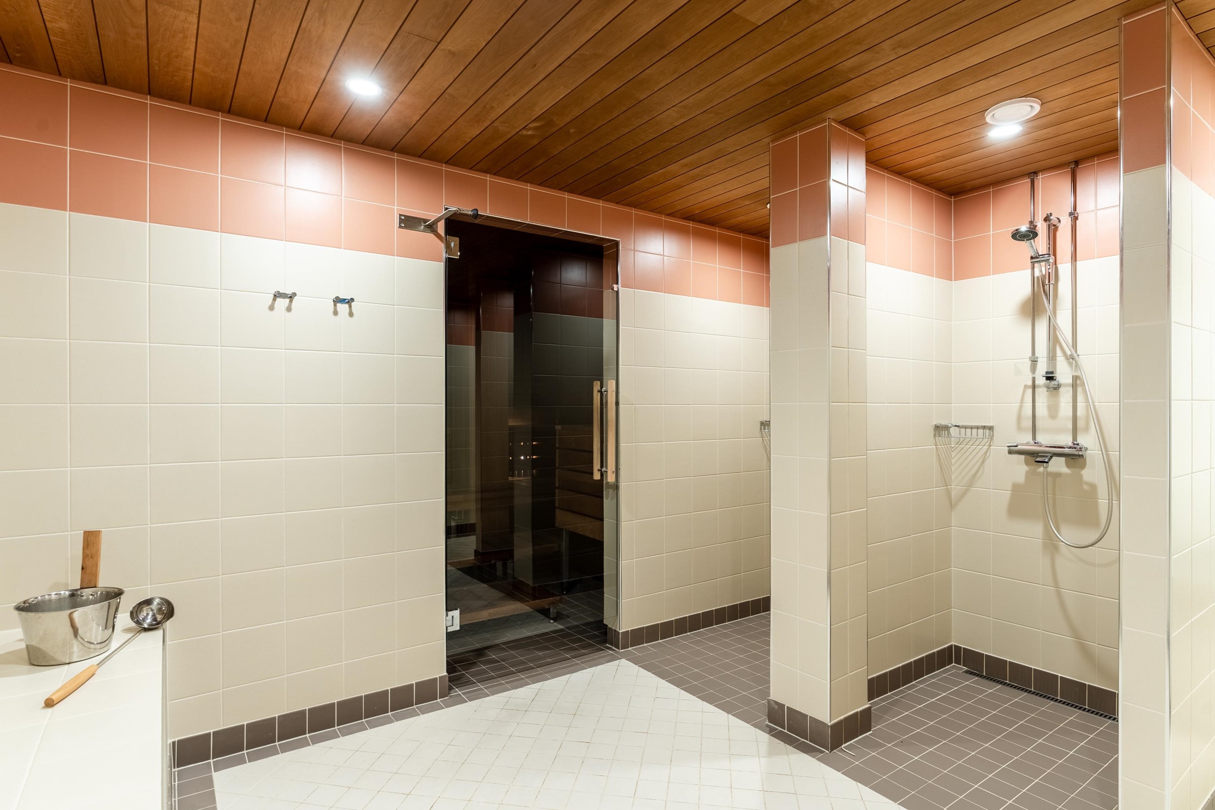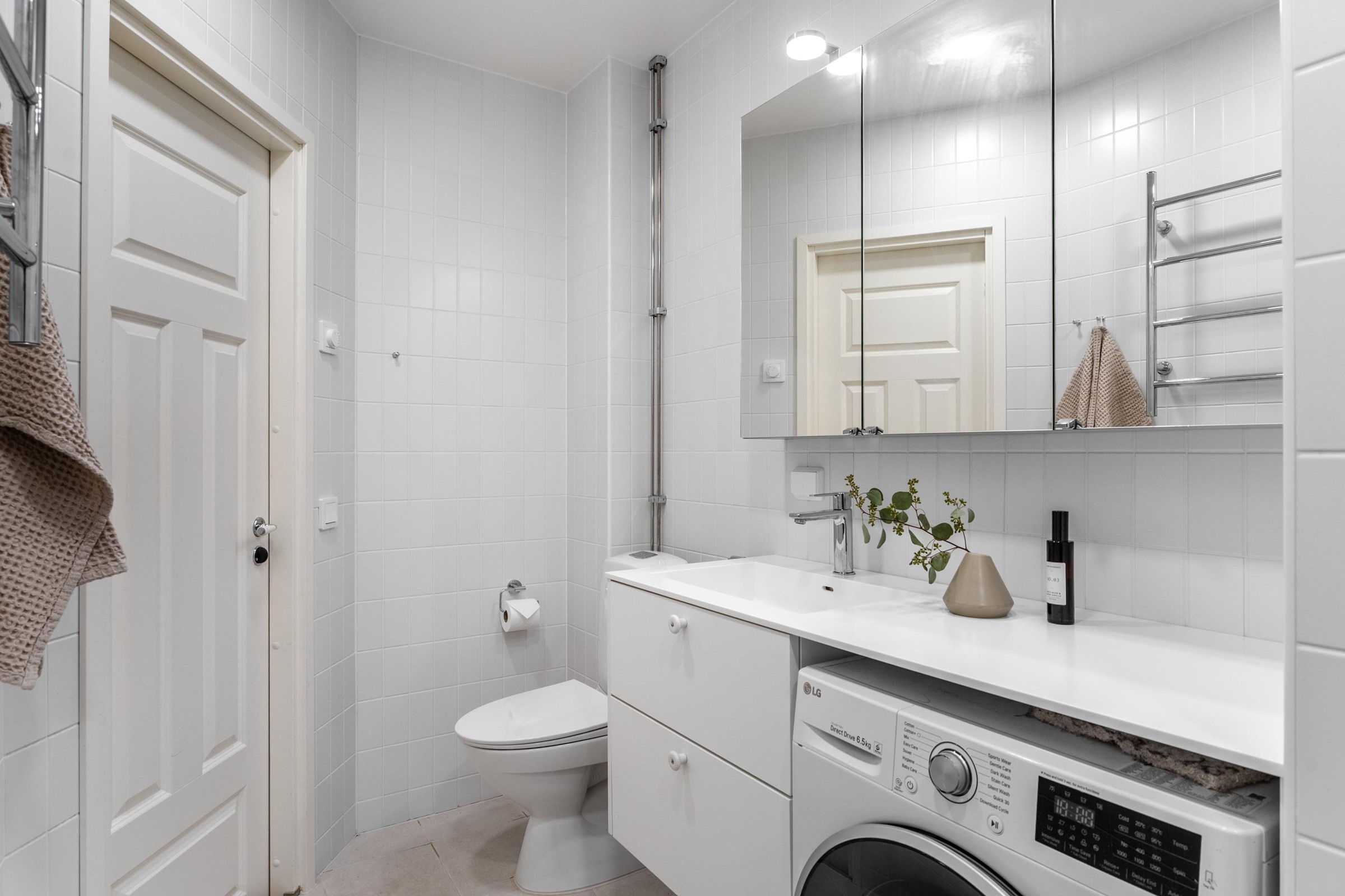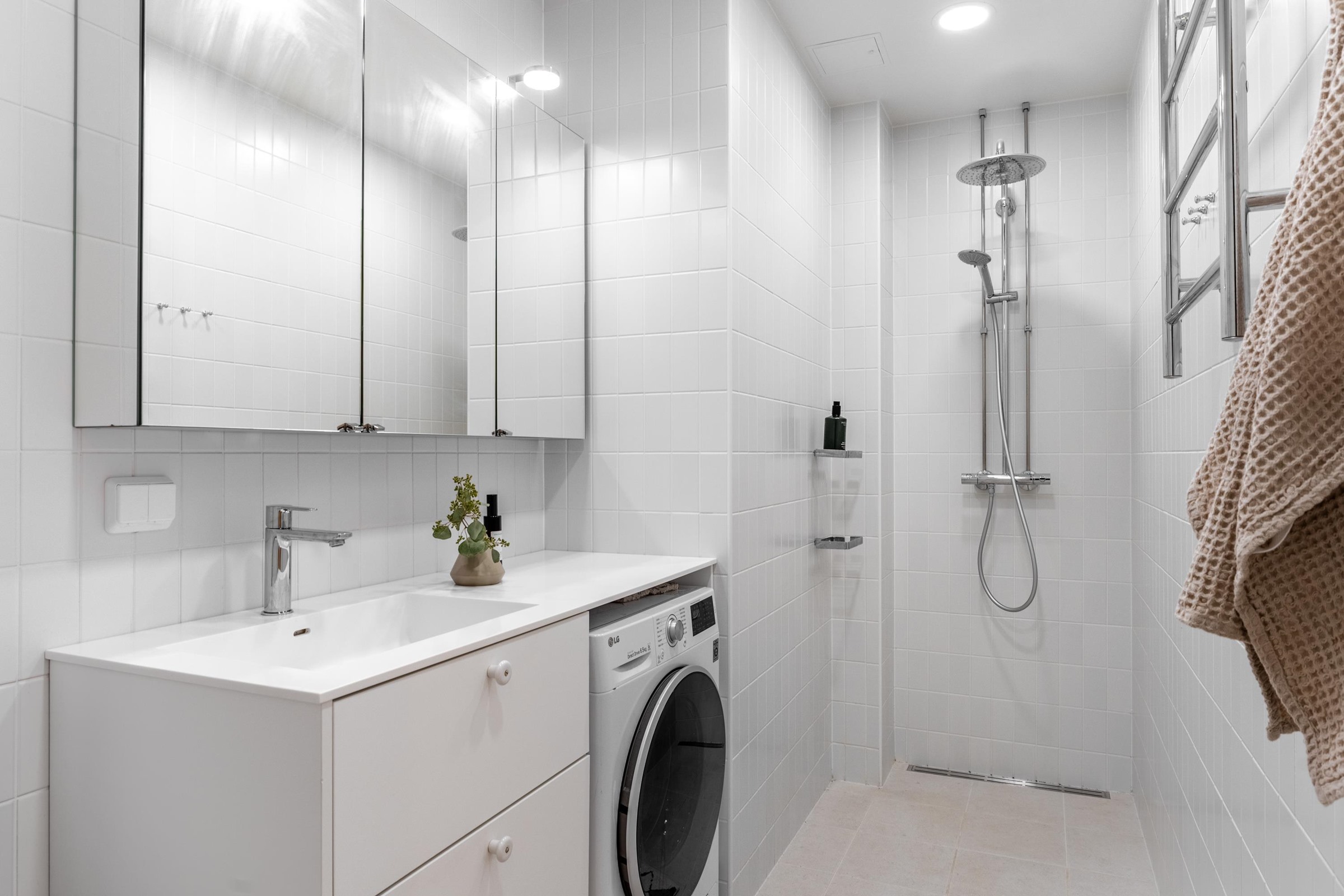 Kylpyhuone on täysin uudistettu linjasaneerauksen yhteydessä ja huokuu modernia laatua. Vaalea ja harmoninen materiaali-ilme tekee tilasta miellyttävän ja modernin, ja pyykkihuollolle on mietitty toimiva paikka.
