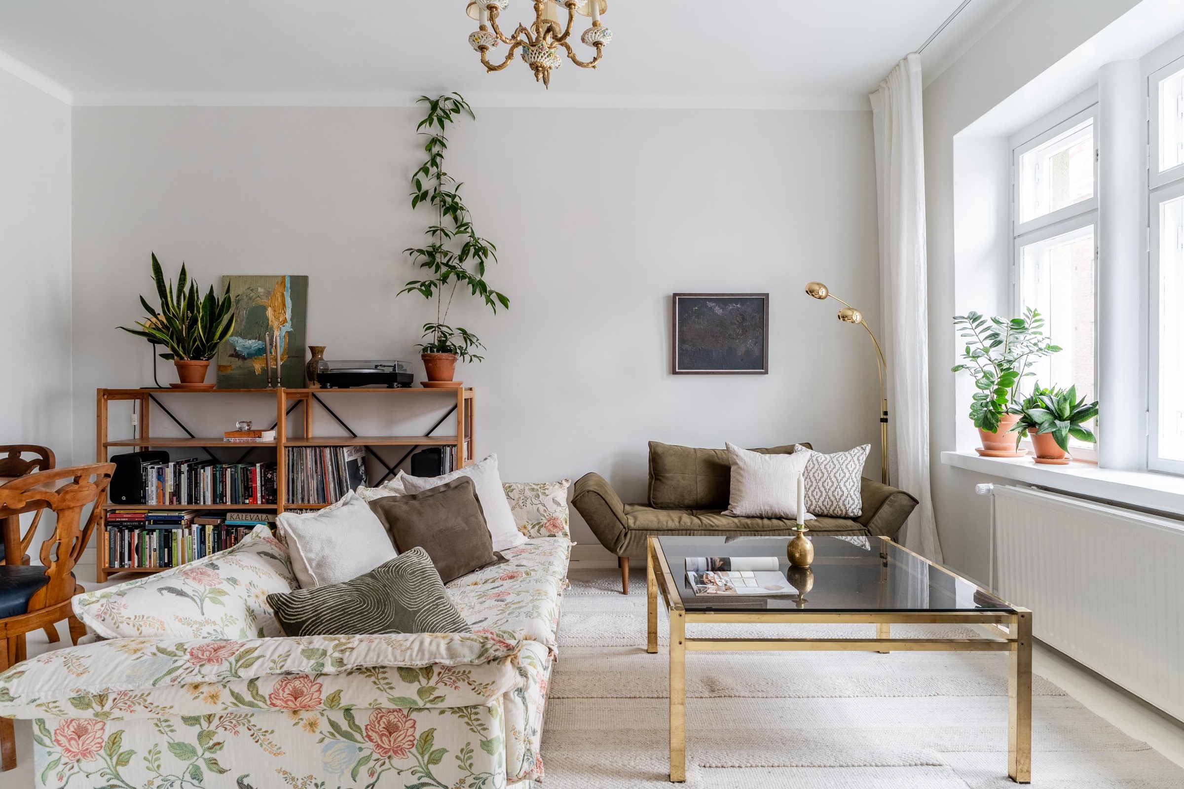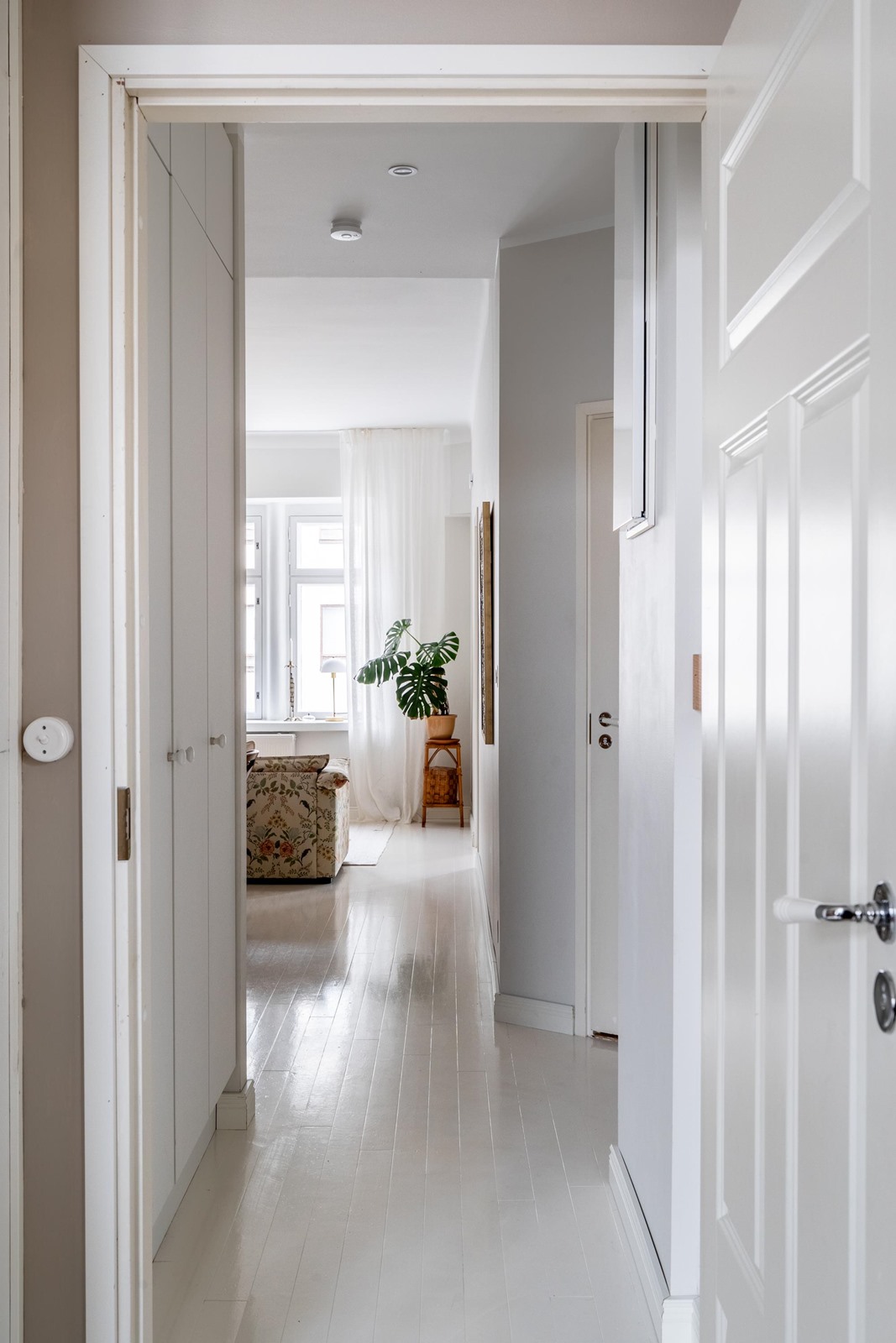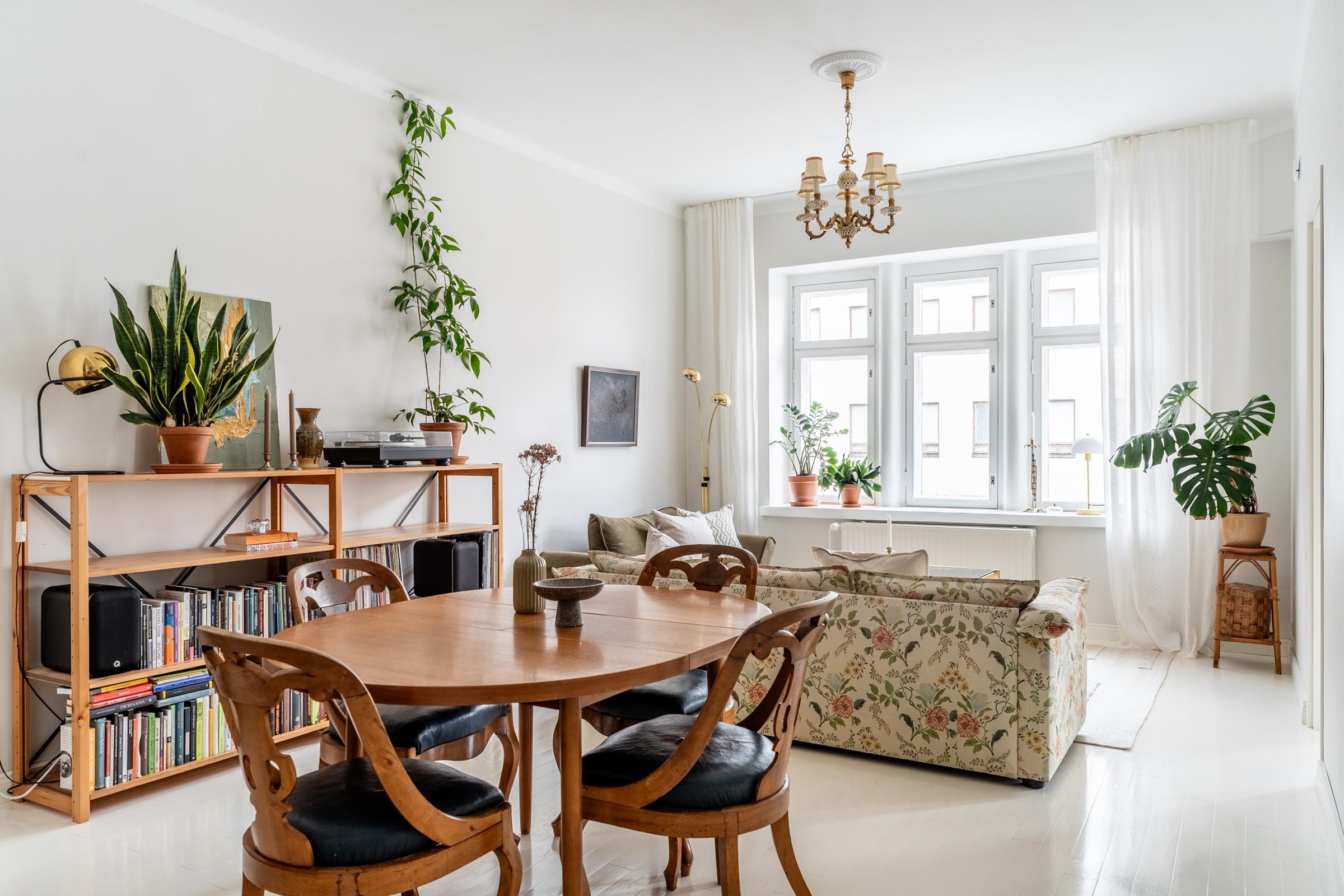 Jo eteisestä avautuva näkymä kertoo paljon siitä, millainen koti on vastassa. Valoa kohti johdattavan eteisen päässä odottaa olohuone, jonka suuret ikkunat täyttävät tilan pehmeällä luonnonvalolla. Huoneessa on levollinen ja lämmin tunnelma, jota korostavat puhtaan valkoiset pinnat, korkea huonekorkeus ja kauniit alkuperäiset yksityiskohdat. Olohuone ja ruokailutila liukuvat toisiinsa luontevasti muodostaen avaran ja kutsuvan kokonaisuuden arkeen ja juhlaan.