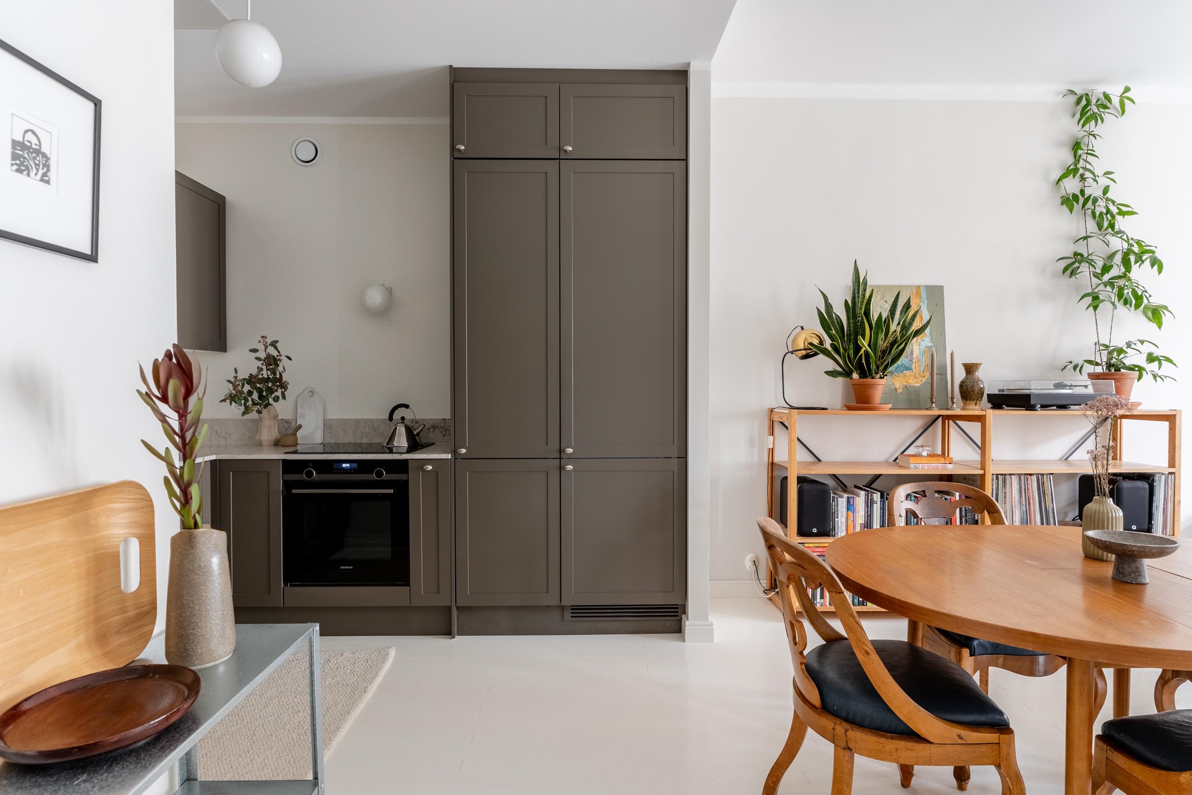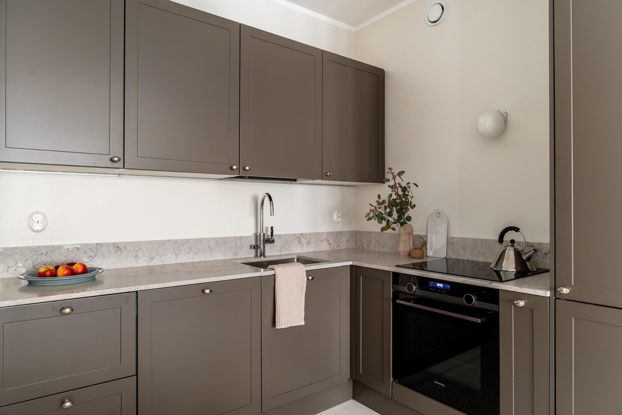 Keittiö on toteutettu aikaa kestävillä valinnoilla. Mattapintaiset kaapistot, kivitasot ja pelkistetty värimaailma luovat rauhallisen ja tyylikkään ilmeen, jossa arjen kokkaus muuttuu nautinnoksi. Kaikki on harkittua ja toimivaa, mutta samalla kodikasta.
