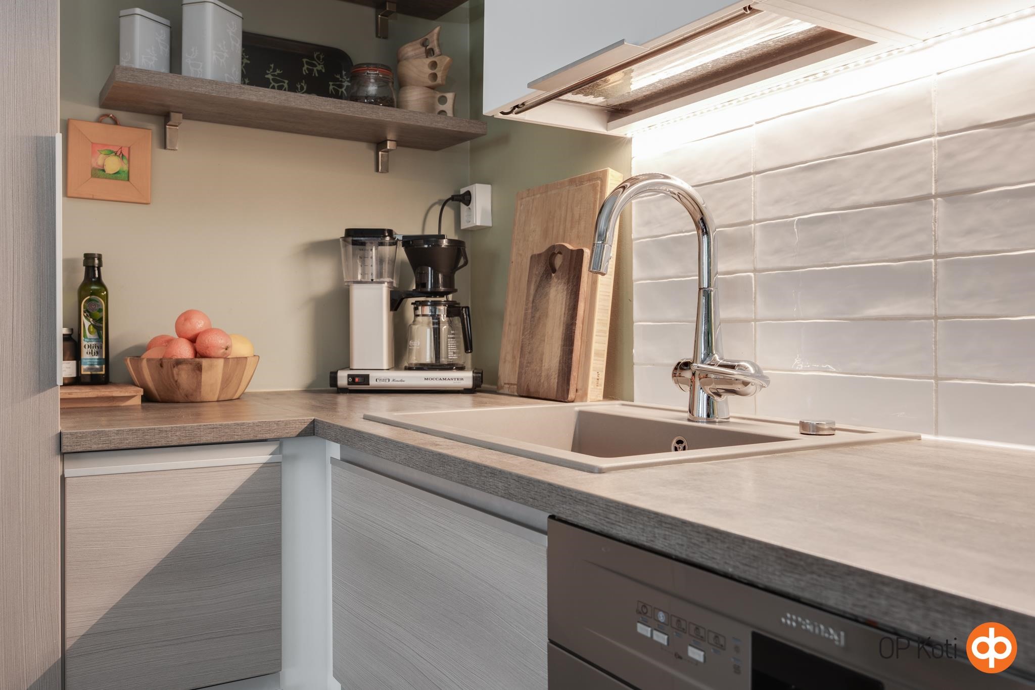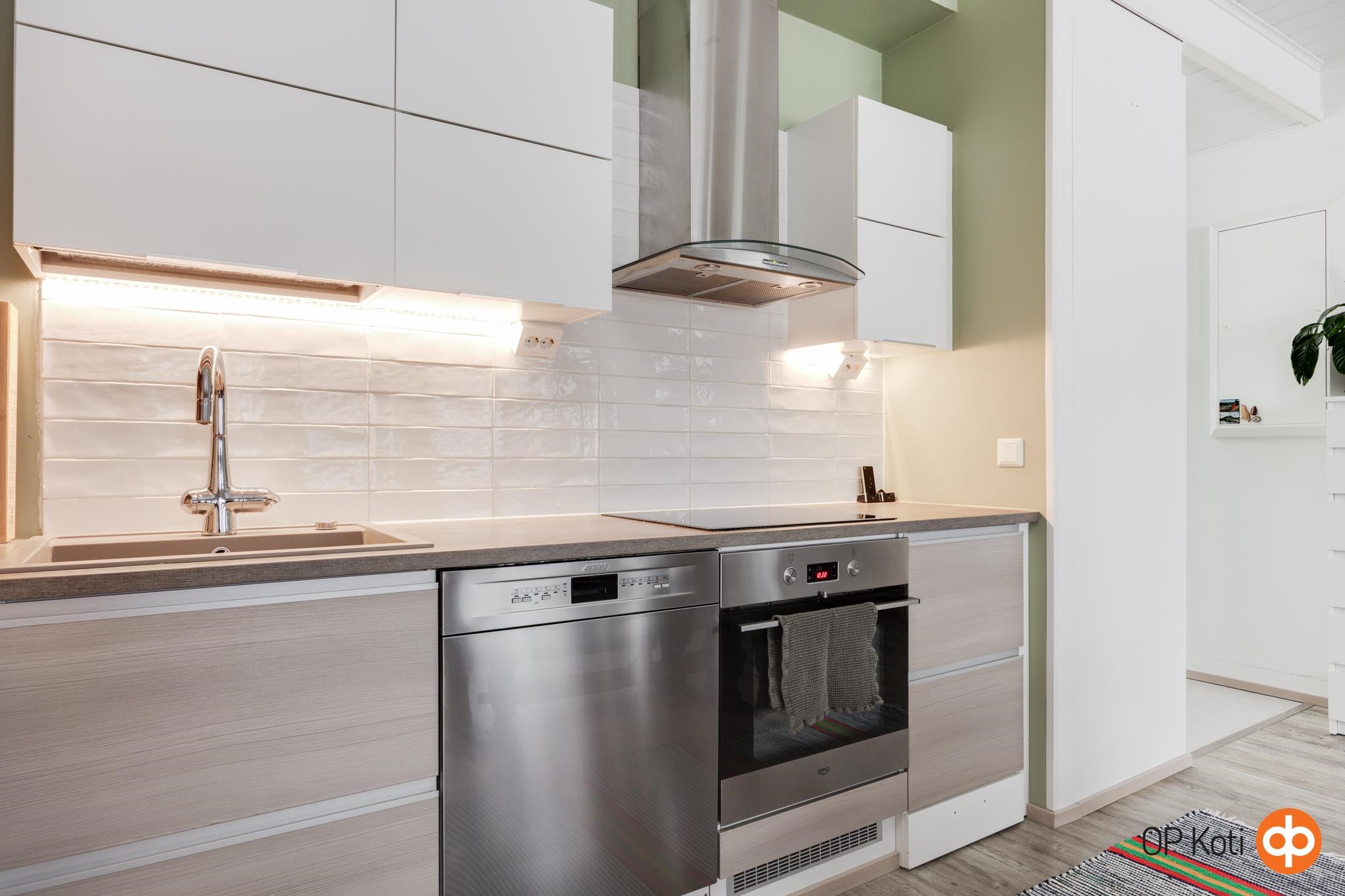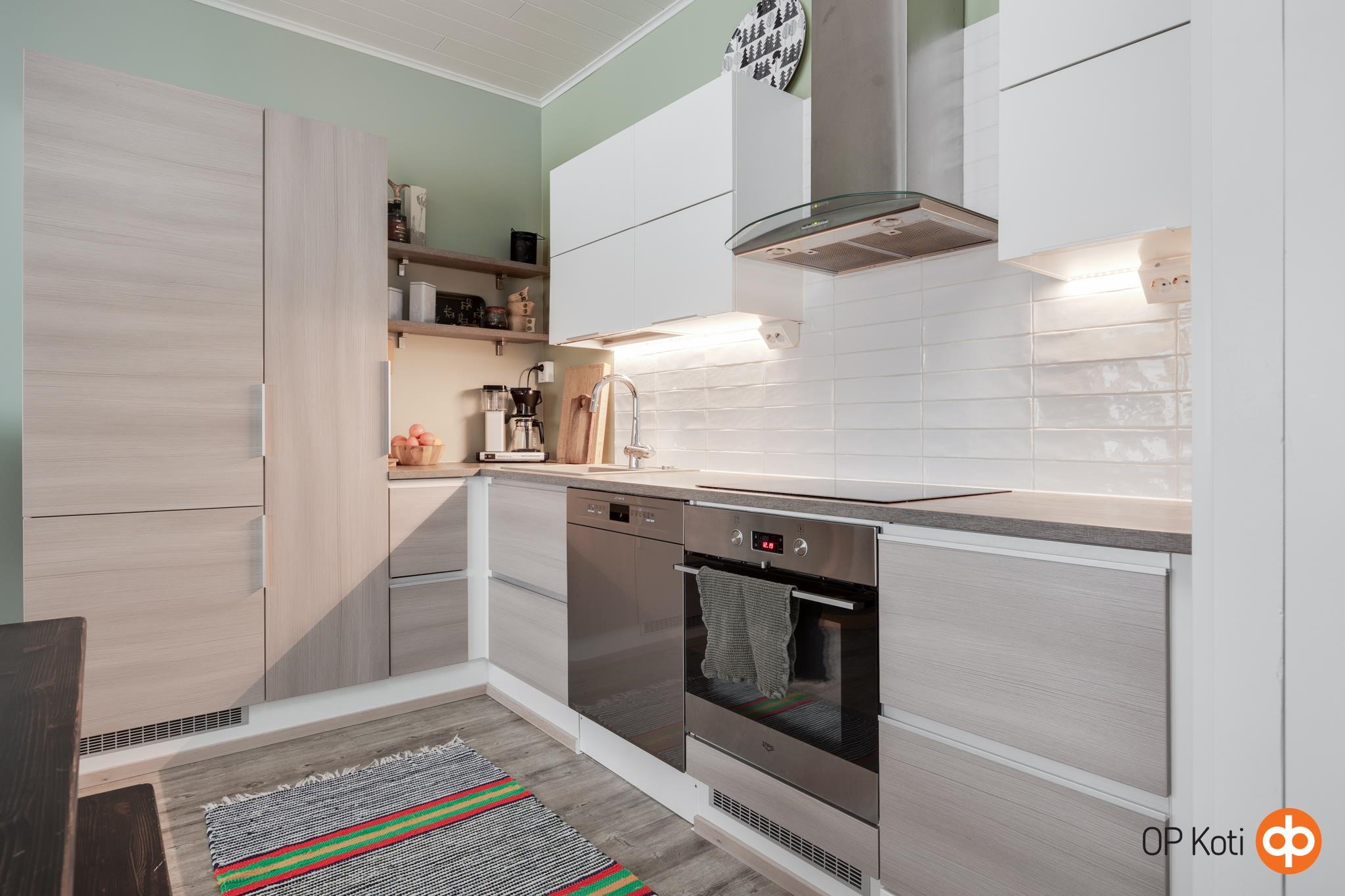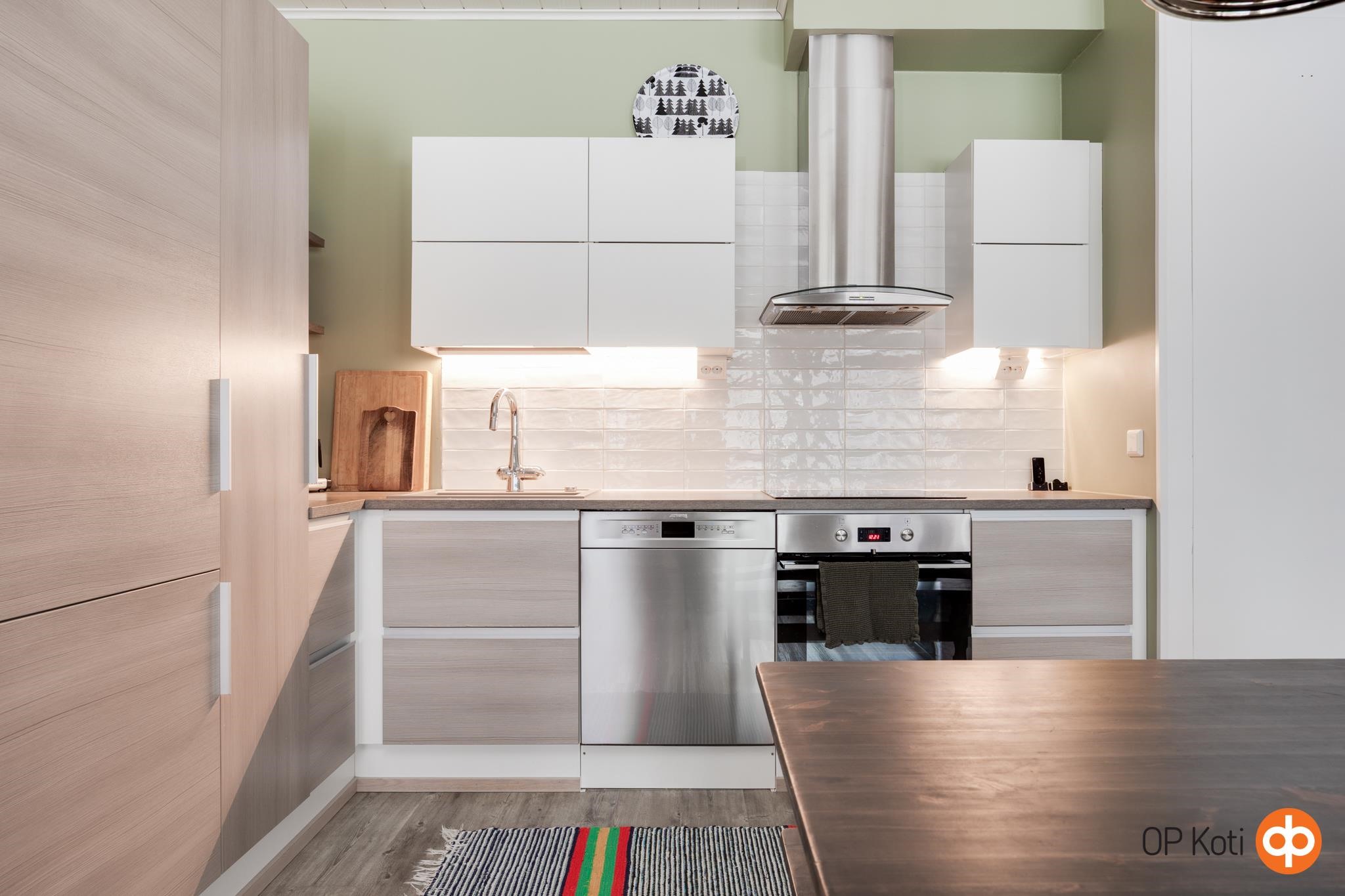 - Jääkaappipakastin, erillisuuni, induktioliesi, liesituuletin, astianpesukone, kaapistot, kiinteät valaisimet.