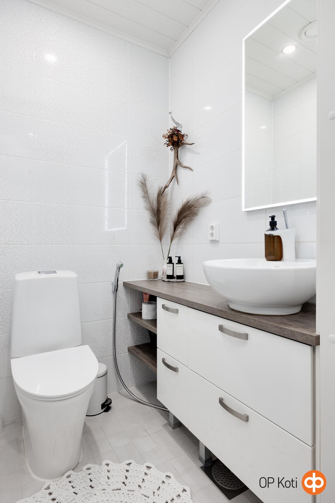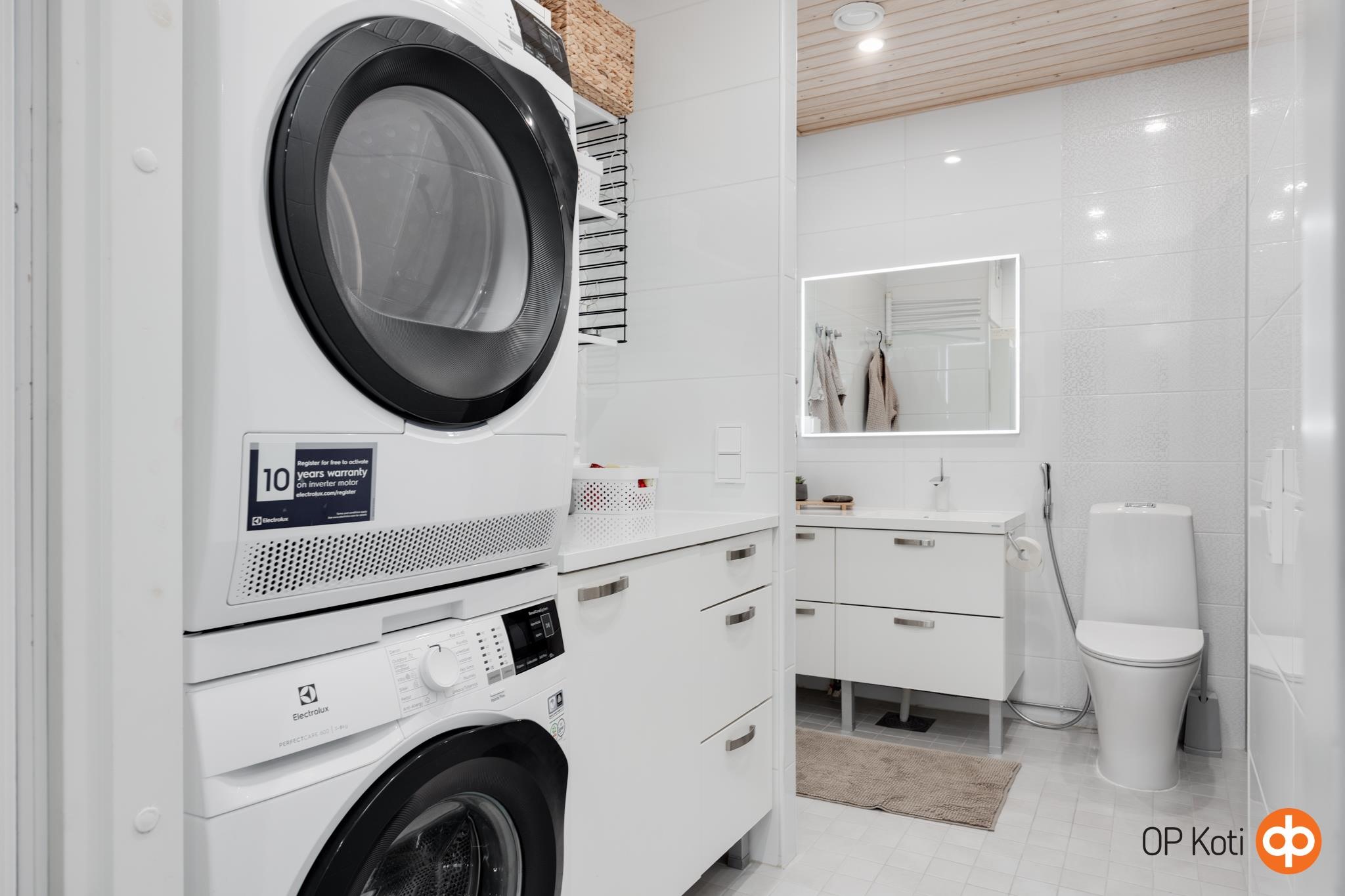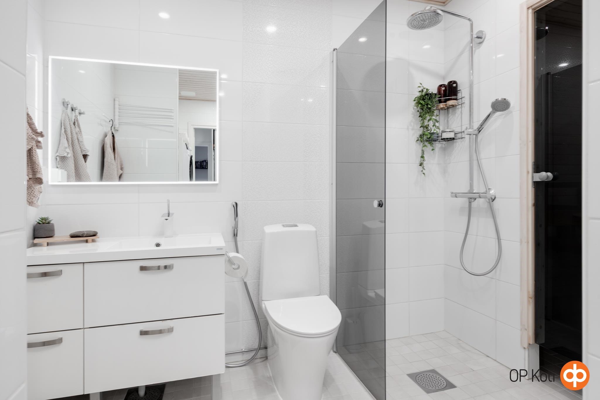 - Sauna, sähkökiuas, kylpyhuone, erillinen wc, suihku, suihkuseinä, allaskaappi, pesukoneliitäntä, lattialämmitys, kiinteät valaisimet.