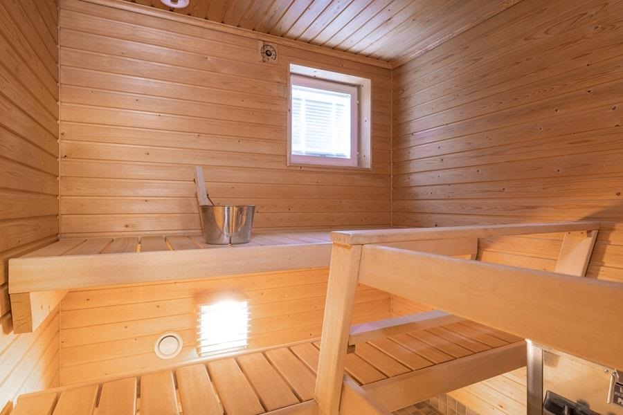 - Saunaosasto on alakerrassa. Tilavassa kylpyhuoneessa on kaksi suihkua. Saunassa on aina valmis sähkökiuas. Kylpyhuoneessa on laatoitus sekä seinissä että lattiassa, jossa myös vesikiertoinen lattialämmitys, kuten koko talossa. Saunassa on seinissä paneeli ja lattiassa laatoitus. Molemmissa kerroksissa on erillinen wc. Kodinhoitotila toimii myös pukuhuoneena ja siellä on laatoitettu lattia. Kodinhoitohuoneessa on hyvät tilat pyykinpesukoneelle ja -kuivurille, syvä lavuaari, runsaasti kaapistoja ja työtasoa kodin vaatehuollolle.