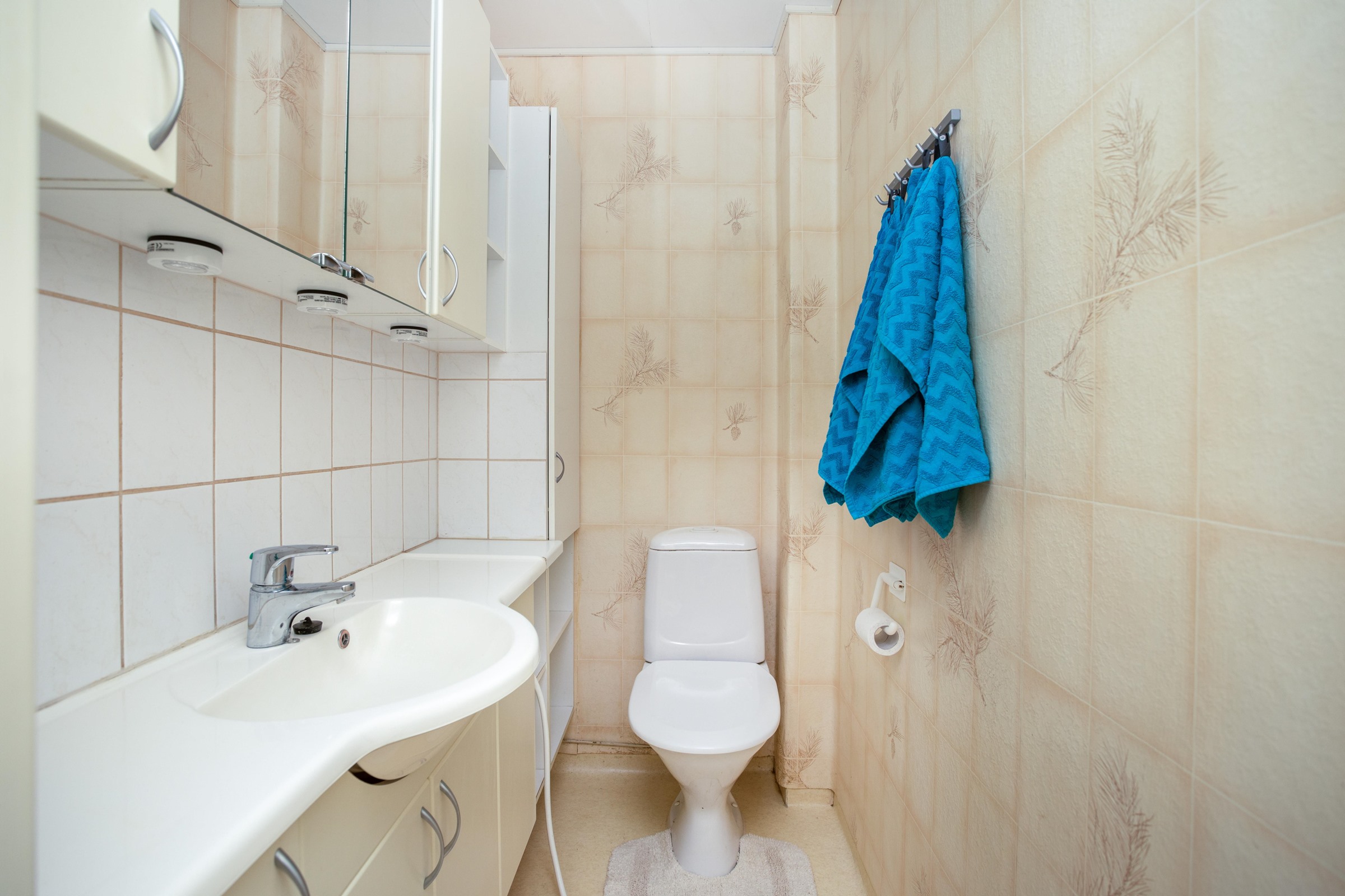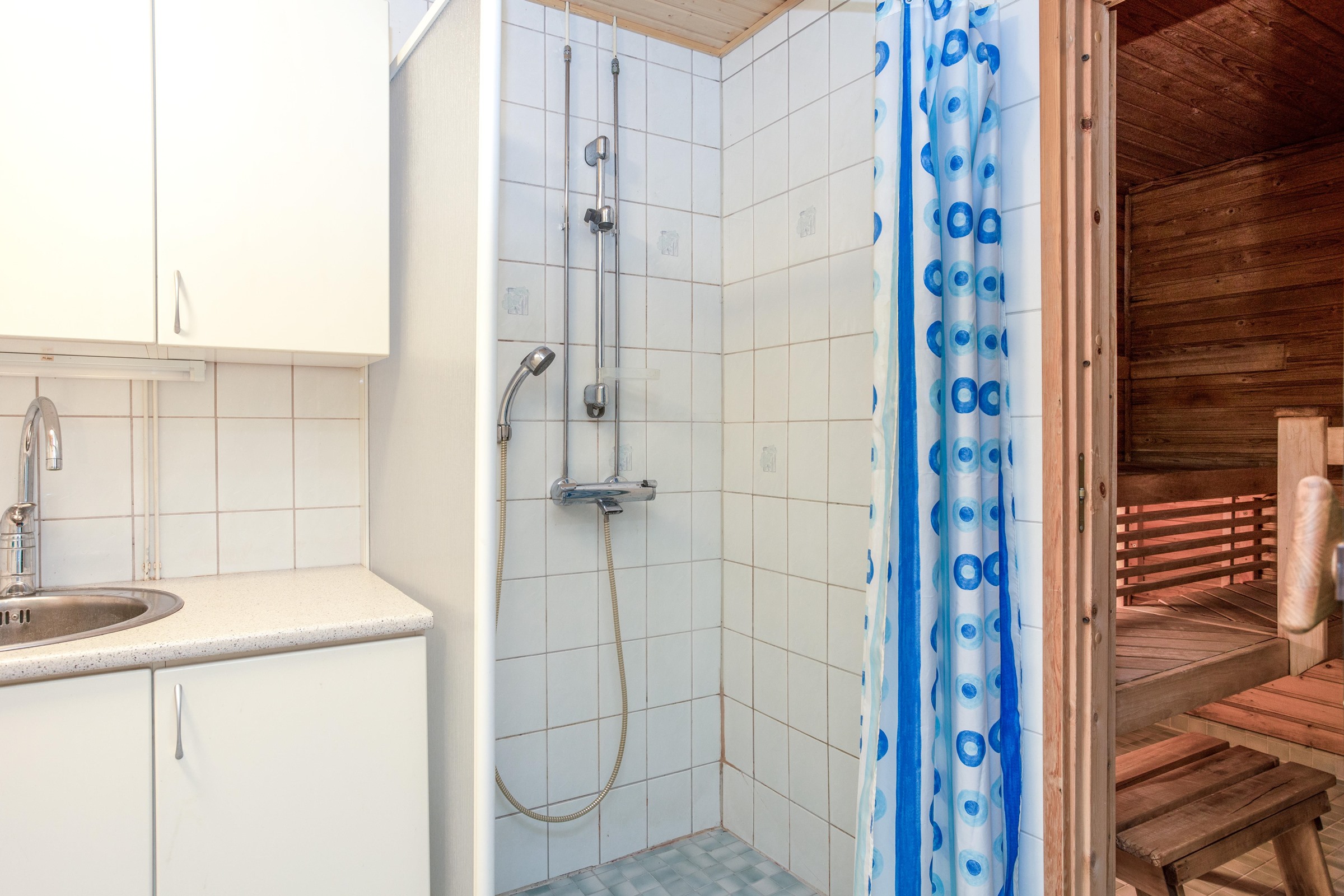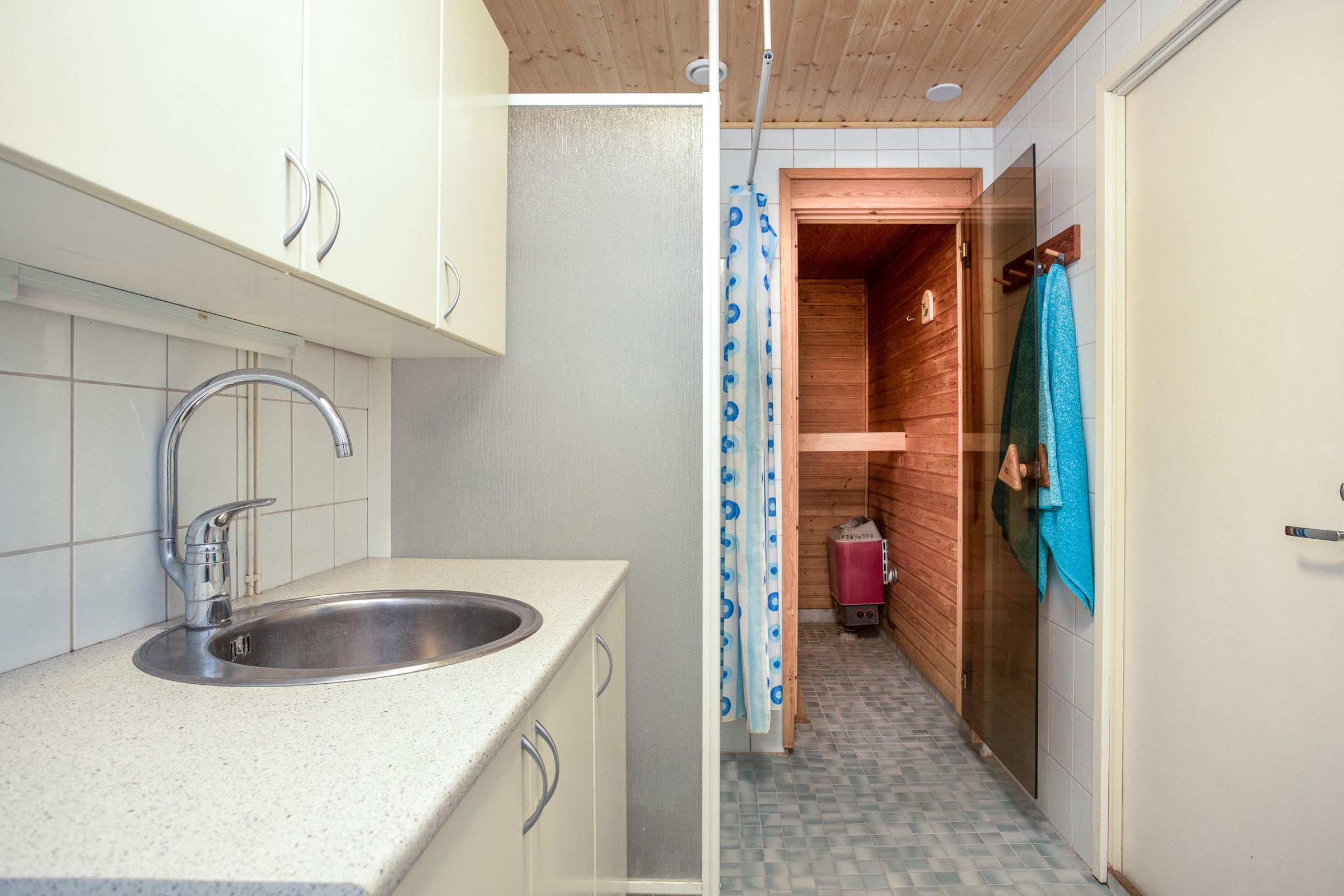 - Sauna, sähkökiuas, kylpyhuone, erillinen wc, suihkuseinä, peilikaappi, allaskaappi, pesukoneliitäntä khh.