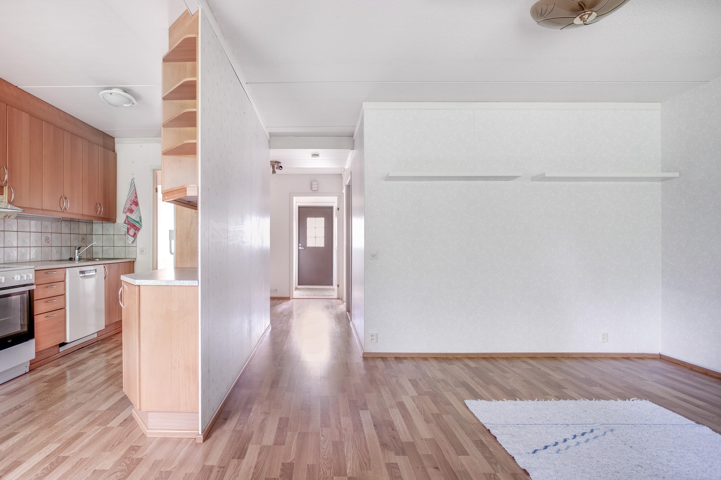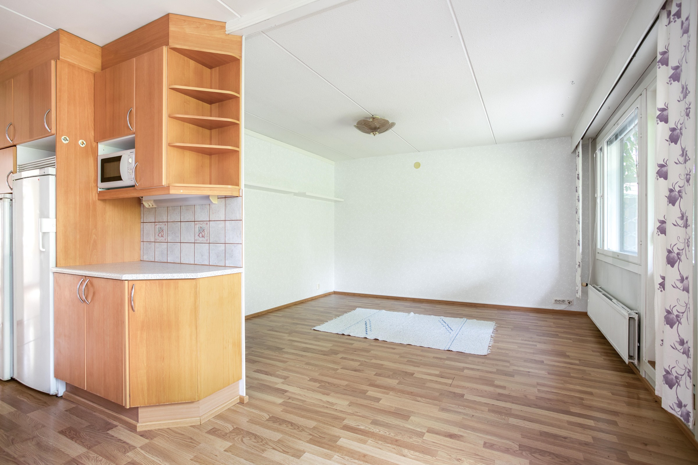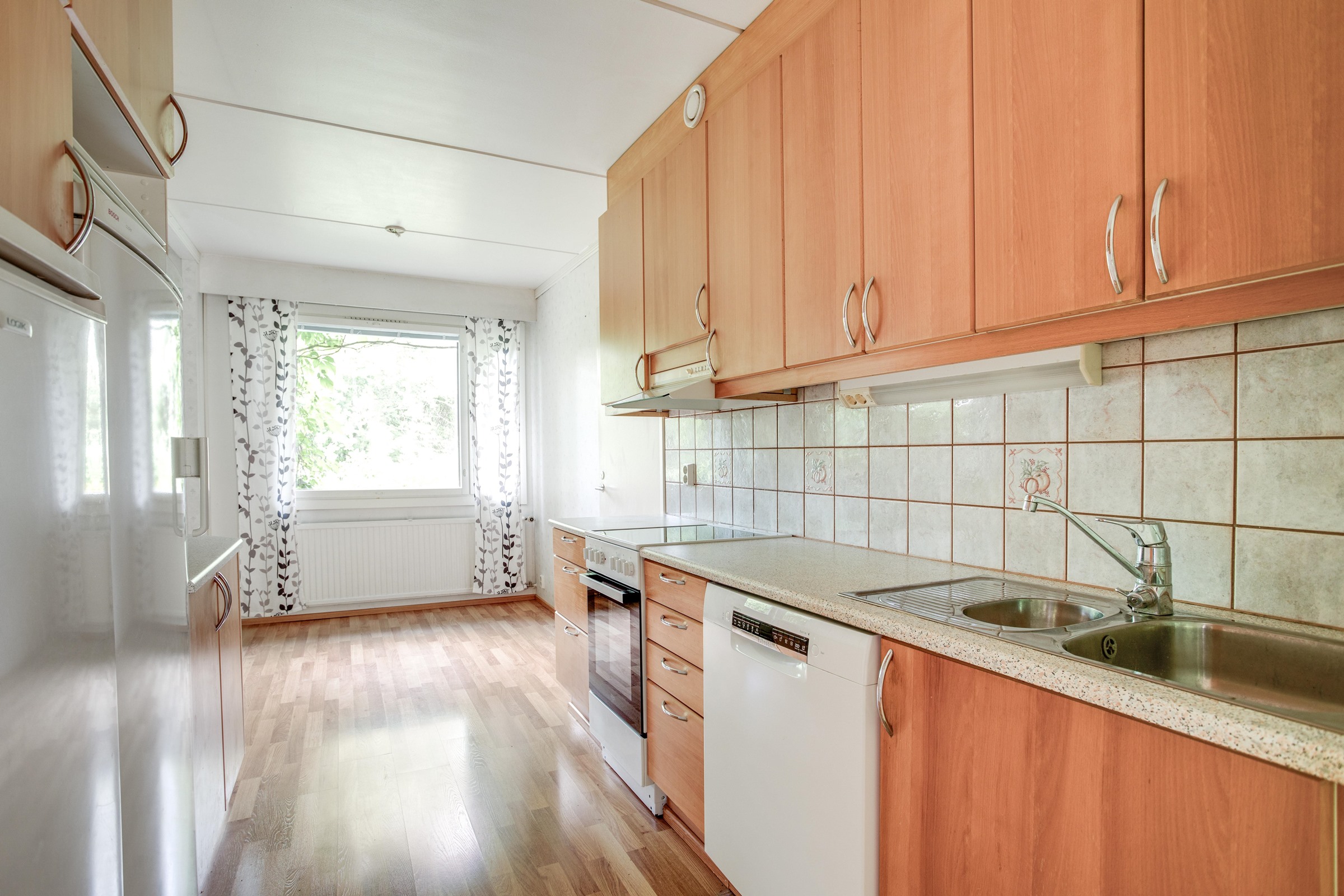 - Jääkaappi, pakastekaappi, lattialiesi, keraaminen liesi, liesituuletin, mikroaaltouuni, astianpesukone, kaapistot, kiinteät valaisimet.