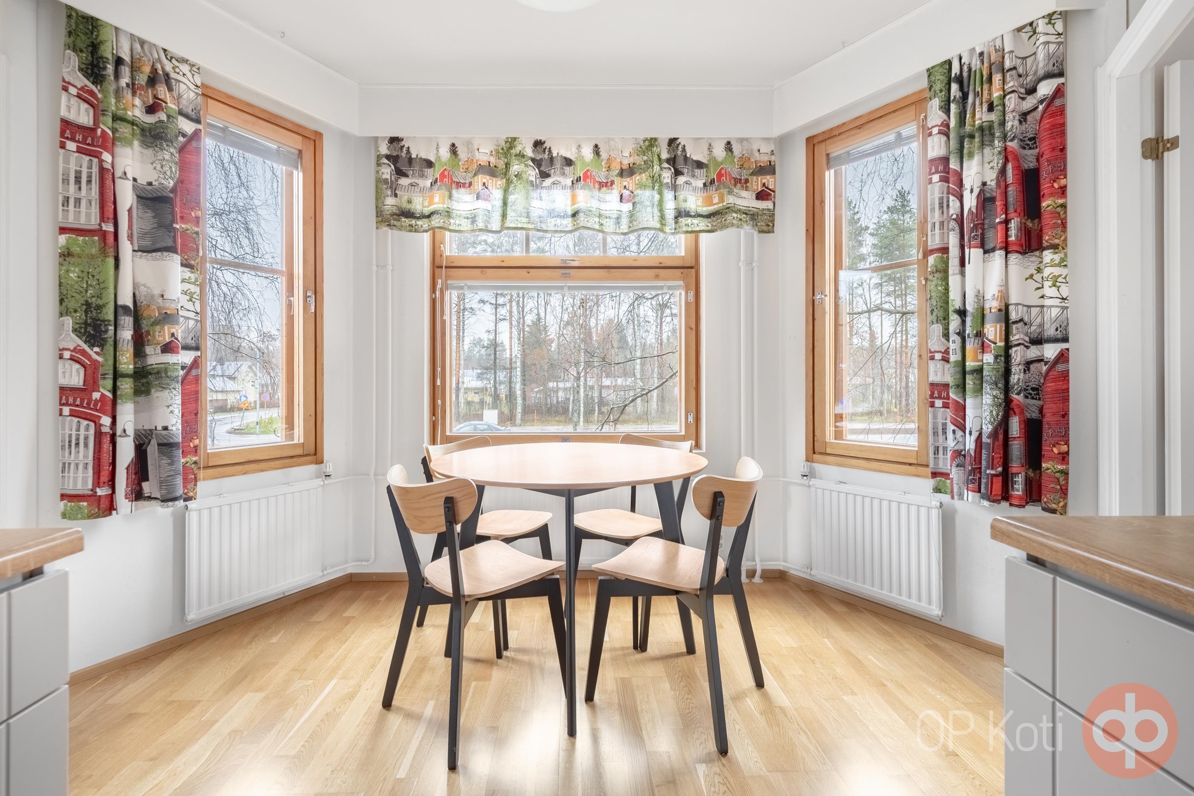 Keittiö on sijoitettu keskeiselle paikalle, mikä tekee siitä kodin sydämen, jossa on helppo nauttia yhteisistä hetkistä perheen ja ystävien kanssa. Olohuone avautuu luontevasti keittiön yhteyteen, tarjoten tilaa rentoutumiselle ja yhdessäololle.