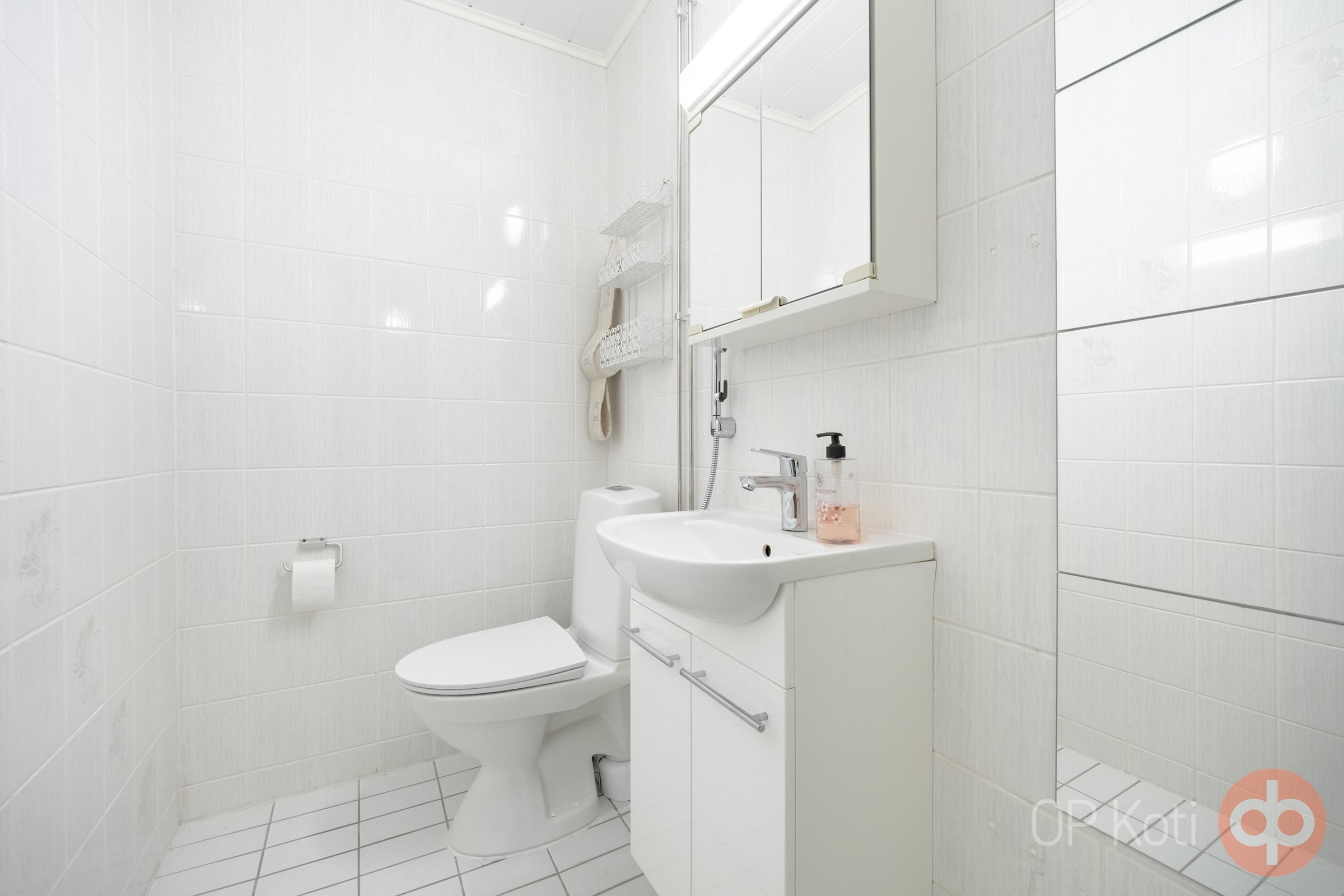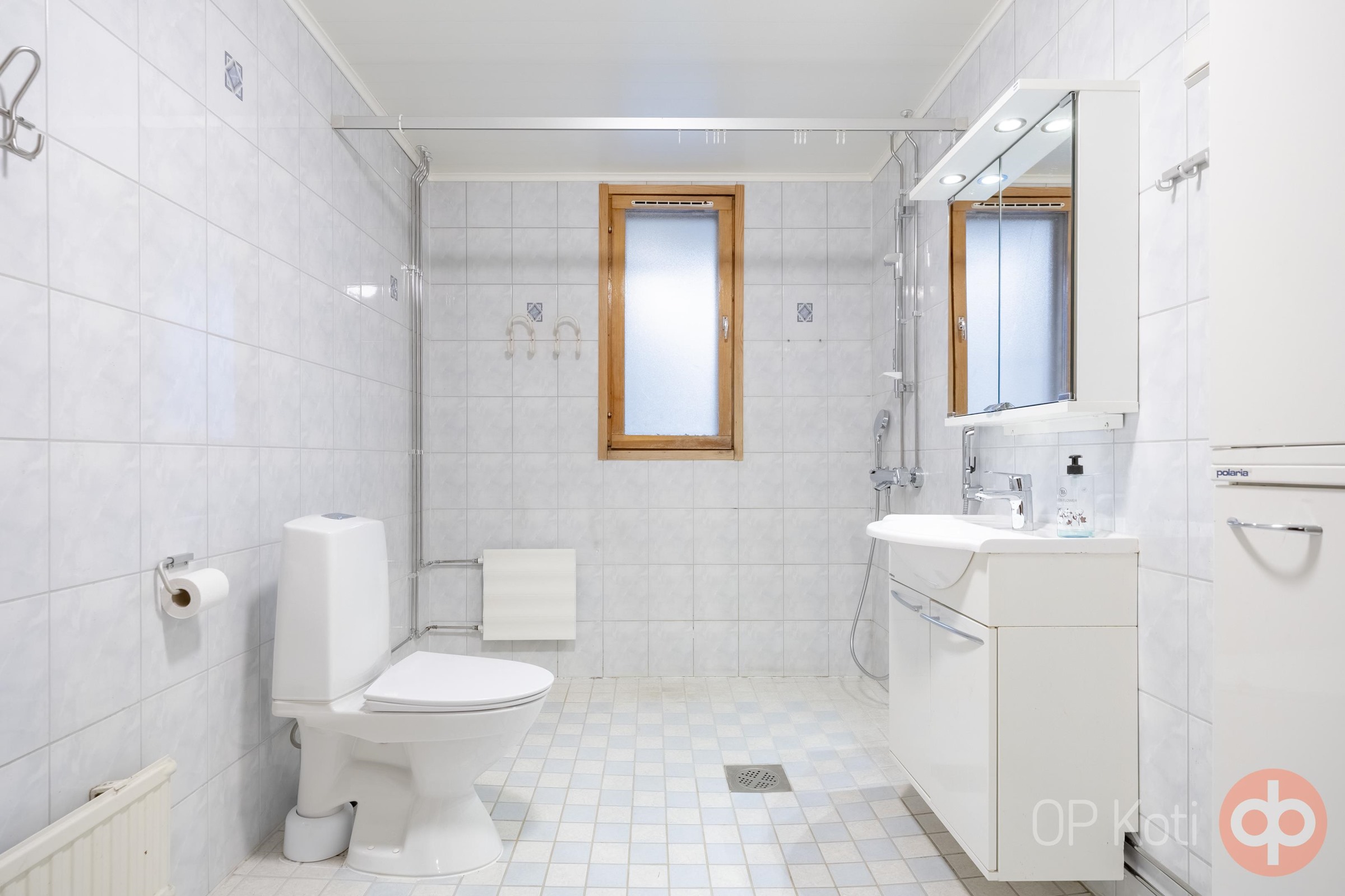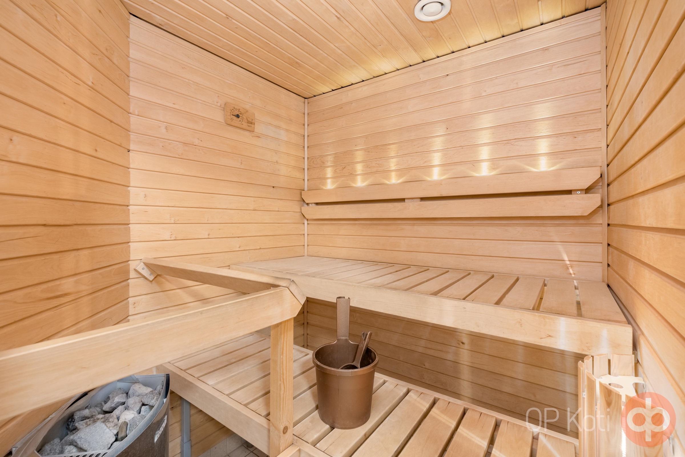 - Sauna, sähkökiuas, kylpyhuone, erillinen wc, suihku, peilikaappi, kaapit kph erilliset kaapit, allaskaappi, pesukoneliitäntä, kiinteät valaisimet.