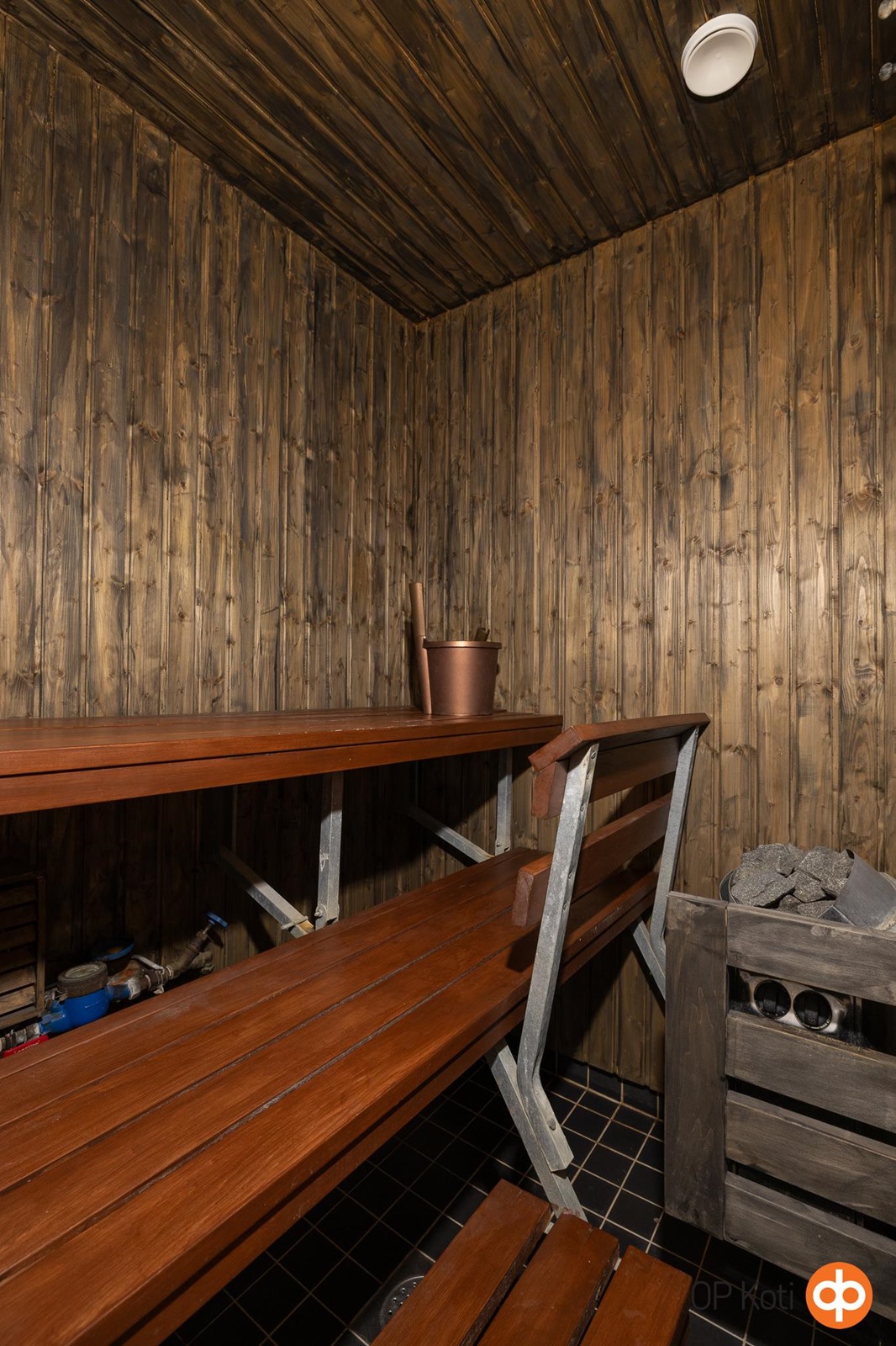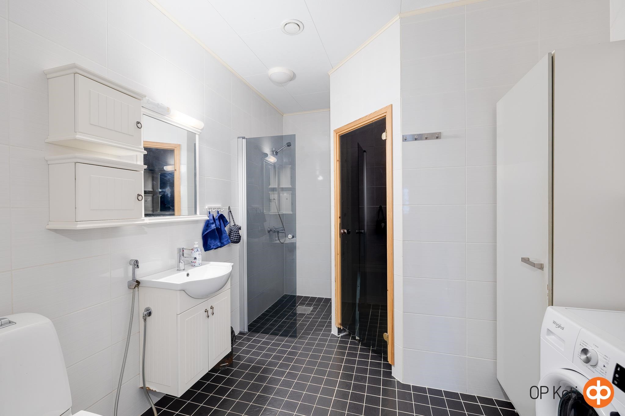 - Sauna, sähkökiuas, kylpyhuone, suihku, suihkuseinä, peilit, kaapit (pyykkikaappi), allaskaappi, pesukoneliitäntä, lattialämmitys (sähköllä), kiinteät valaisimet. Vesivaraaja alkuperäinen 2011.