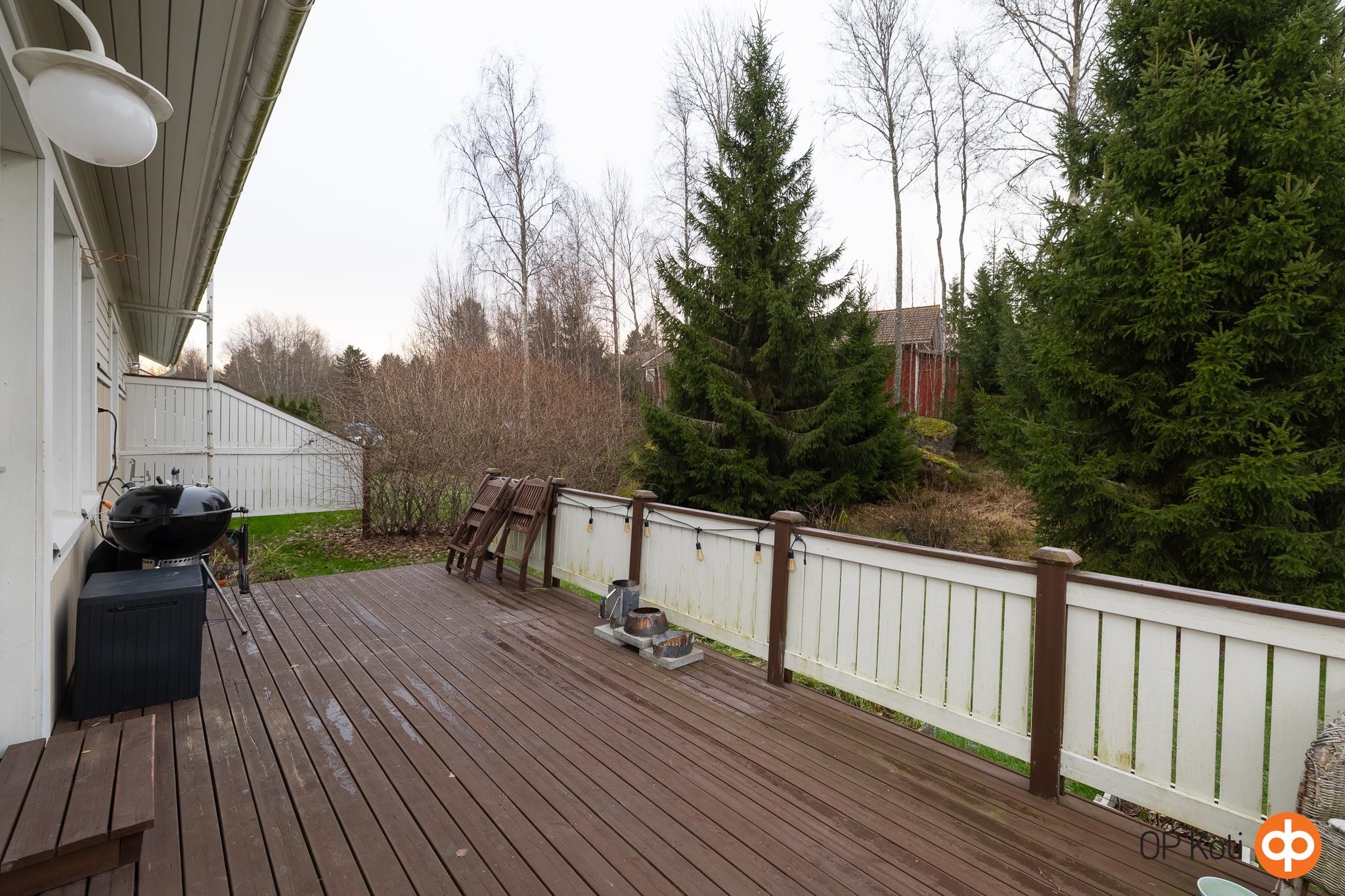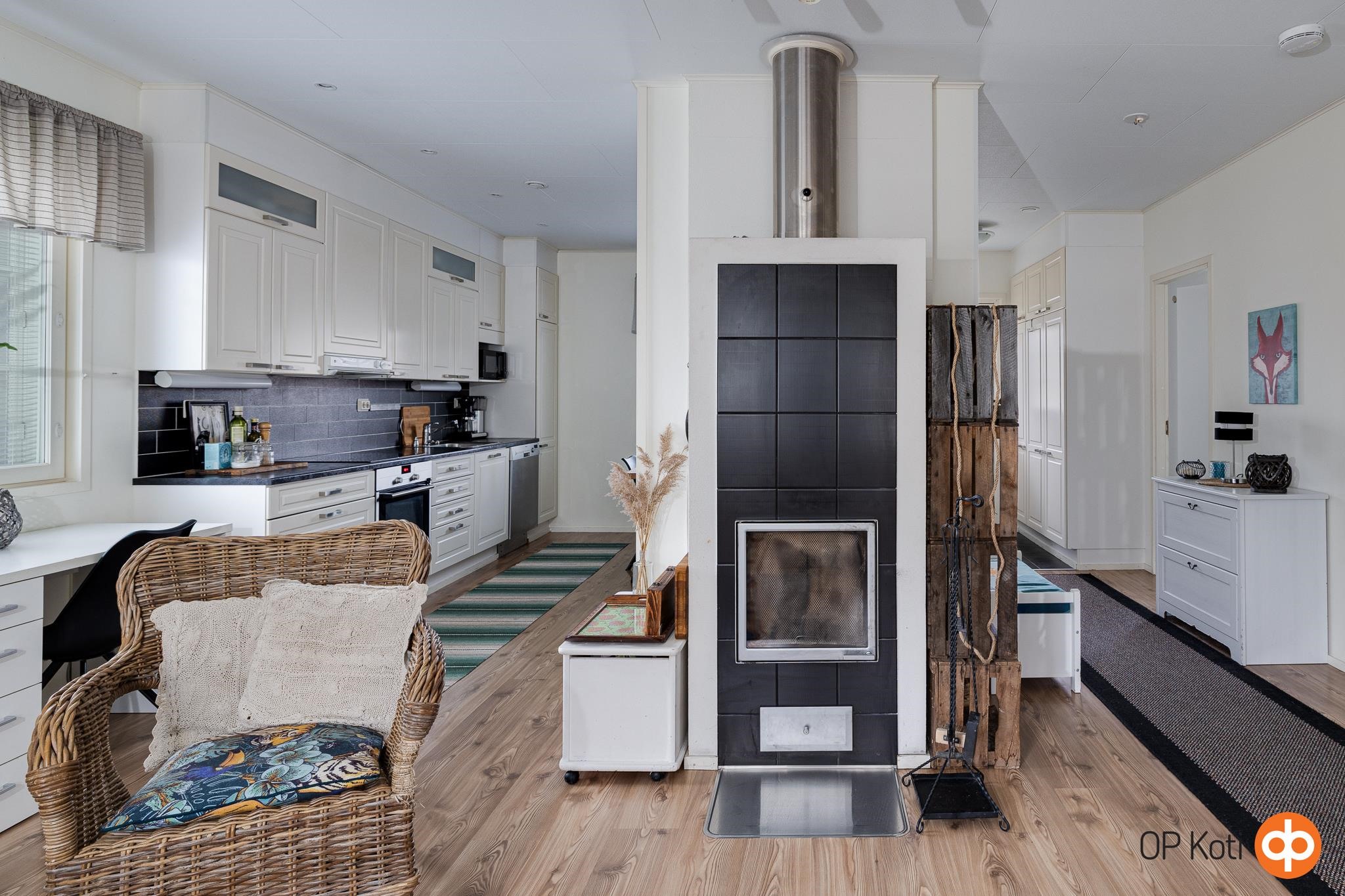 Keittiössä on hyvin työskentelytilaa ja ikkunan äärelle saa helposti sijoitettua isommankin ruokapöydän. Olohuoneessa varaava takka luo lämpöä ja tunnelmaa, ja tilasta avautuu käynti aurinkoiselle terassille. Kaksi tilavaa makuuhuonetta, toimiva kylpyhuone sekä sauna täydentävät kokonaisuuden. Yläkerran käyttöullakko tuo kätevää lisätilaa säilytykseen.