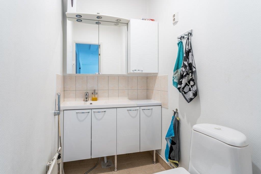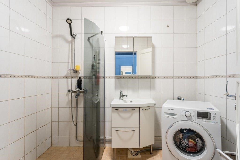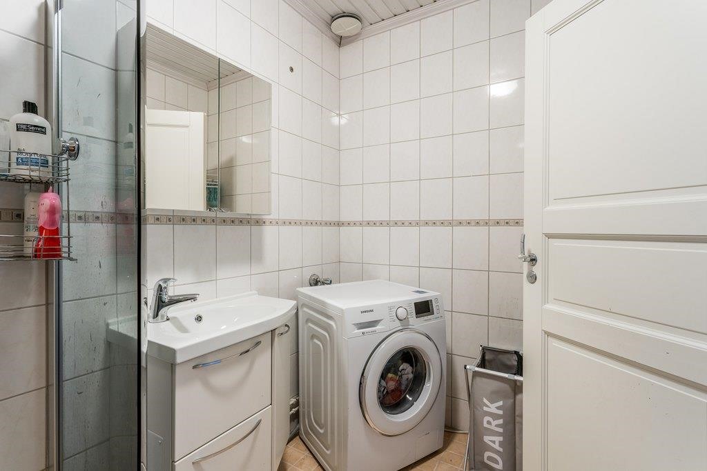 - Sauna, sähkökiuas, kylpyhuone, erillinen wc, suihku, peilikaappi, kaapit, allaskaappi, pesukoneliitäntä kylpyhuoneessa, lattialämmitys, kiinteät valaisimet.