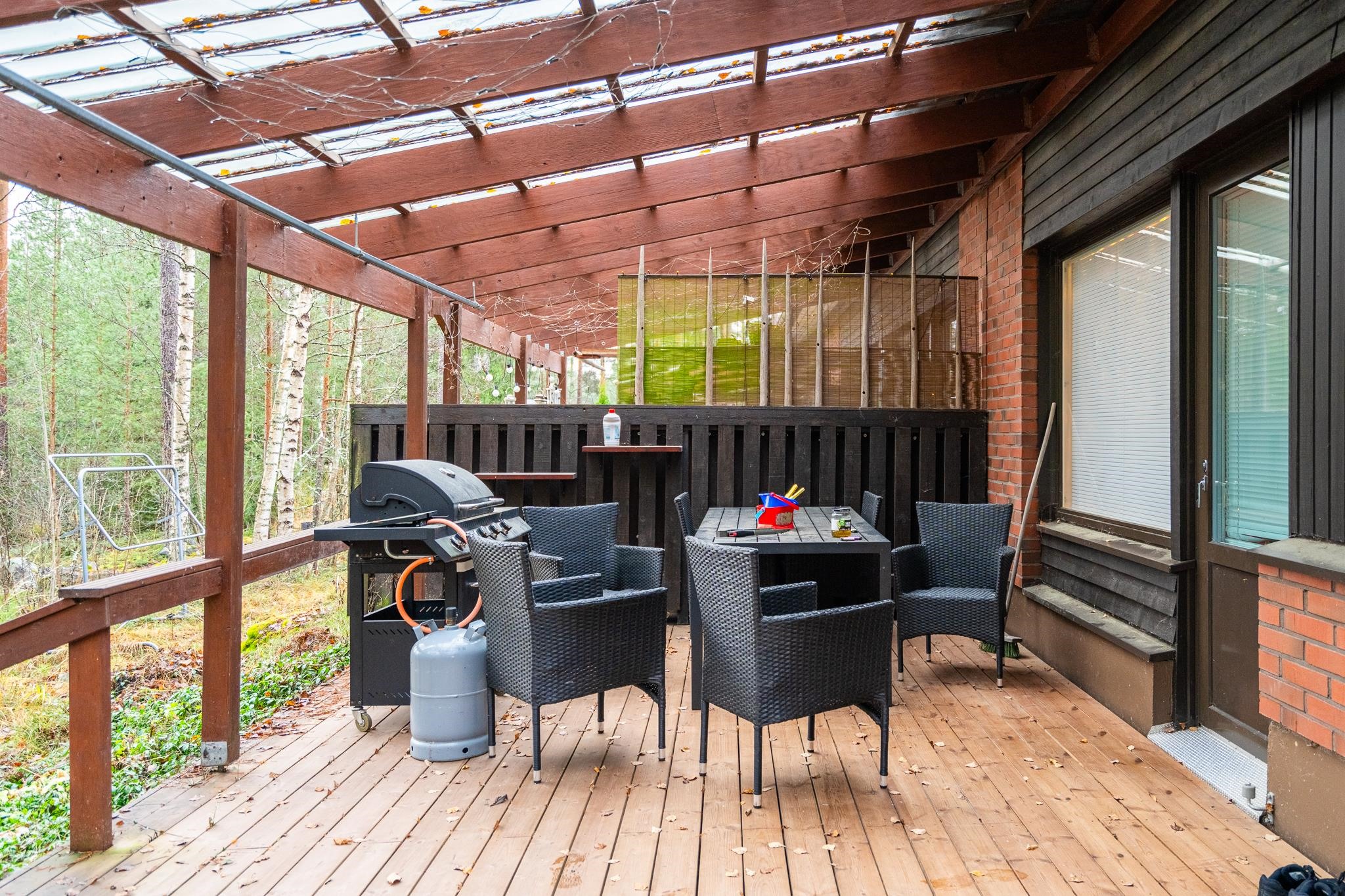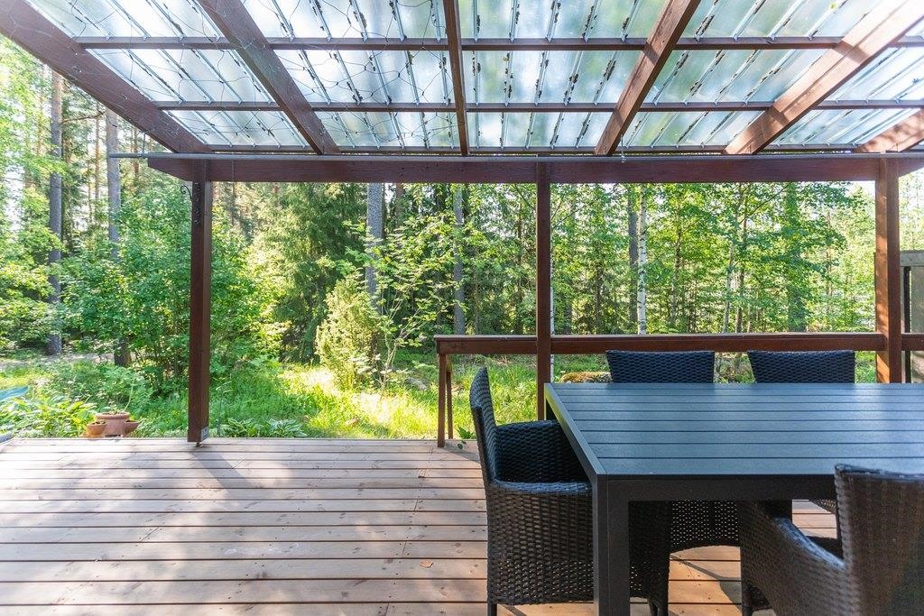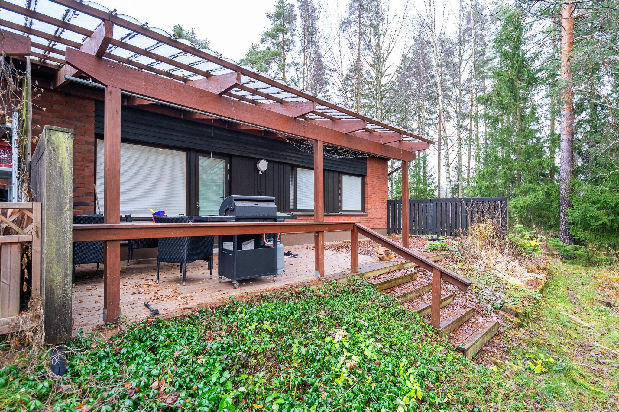 Olohuoneesta avautuu käynti ihastuttavalle katetulle terassille, joka tarjoaa täydellisen paikan rentoutumiselle ja yhteisille hetkille perheen kesken. Pururadan läheisyys takaa loistavat ulkoilumahdollisuudet ja tarjoaa paikan aktiiviseen elämäntapaan.