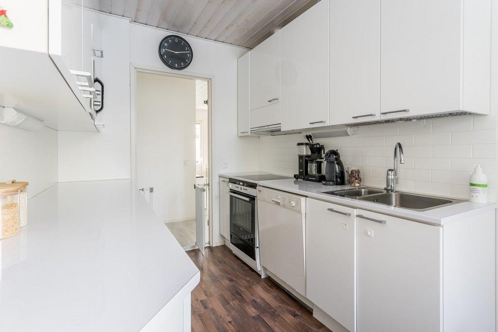 - Jääkaappi, pakastekaappi, keraaminen liesi, liesituuletin, astianpesukone, kaapistot, kiinteät valaisimet. Tiskikone vuotanut ( poistoletku vuotanut ) vedet allaskaapin alle.