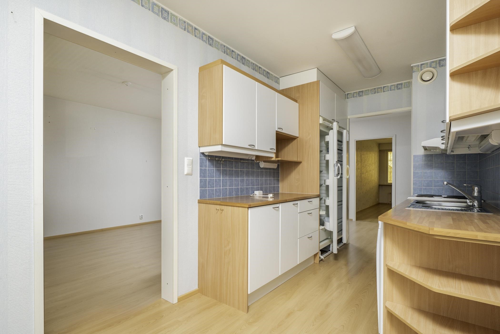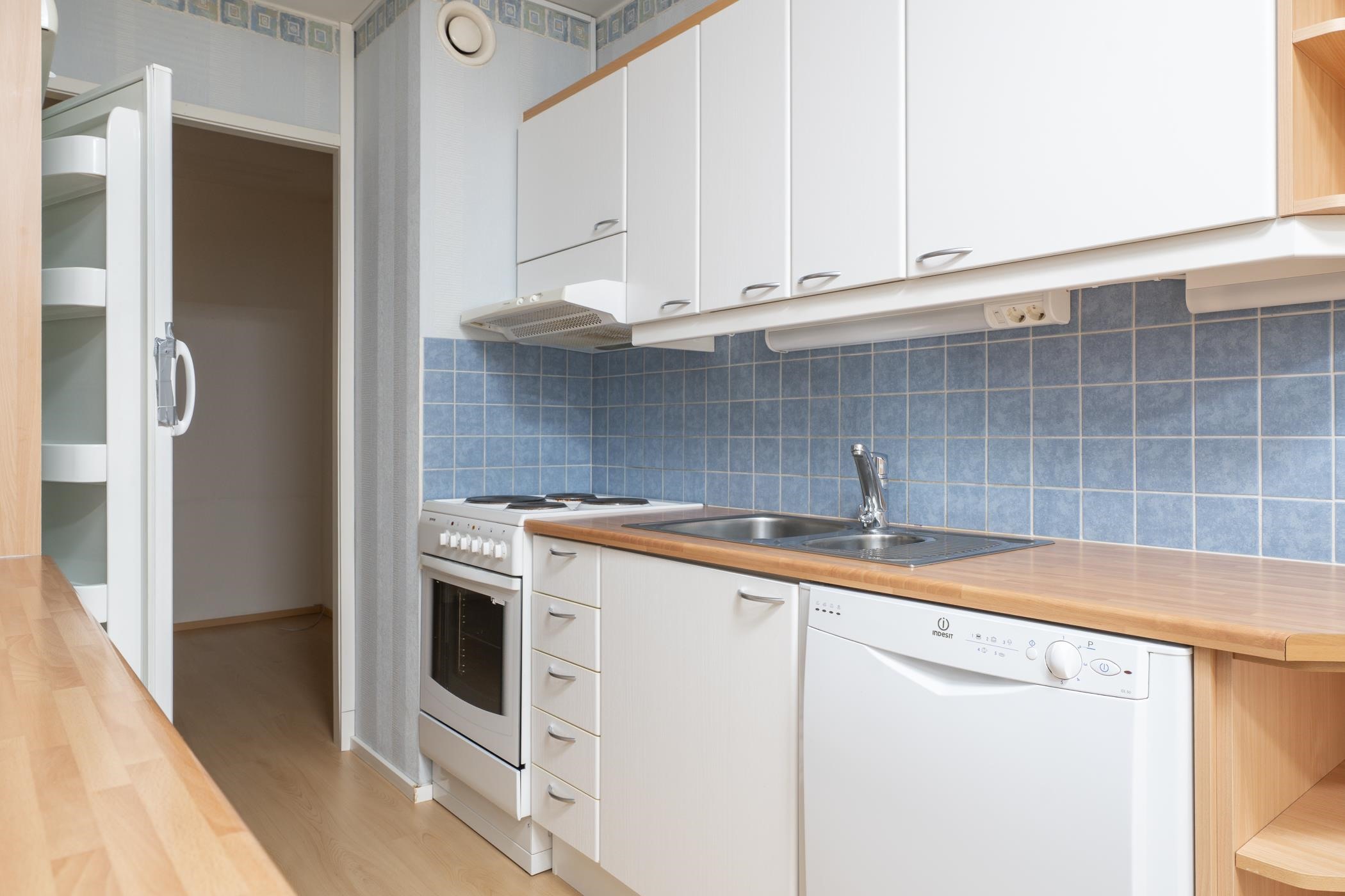 - Keittiössä jääkaappi, pakastekaappi, lattialiesi, liesituuletin, kaapistot, kiinteät valaisimet sekä tila uudelle astianpesukoneelle.