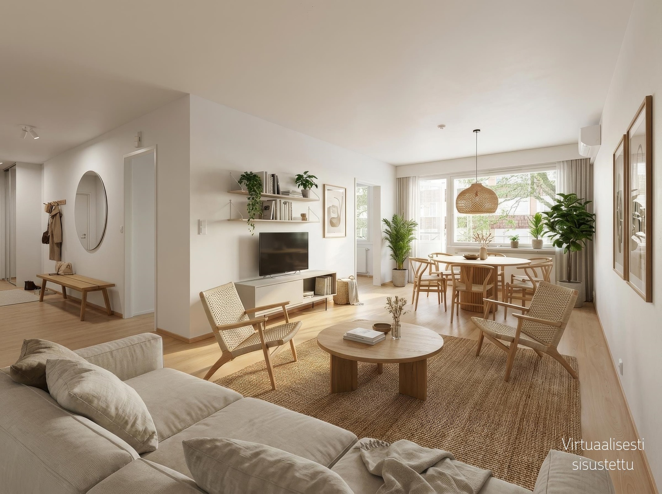 Kaunis ja avara kolmio Kaakinmaalla! Tervetuloa tutustumaan tähän upeaan läpitalon kolmiokotiin neljännessä kerroksessa! Iso olohuone tarjoaa monipuoliset sisustusmahdollisuudet ja jatkuu avaraan eteiseen, joka tuo ylellisyyttä arkeen. Olohuoneesta on käynti sisäpihan parvekkeelle, jossa nautit päiväkahvit kauniiden puiden katveessa. Kesähelteillä asumismukavuutta lisää ilmalämpöpumppu.