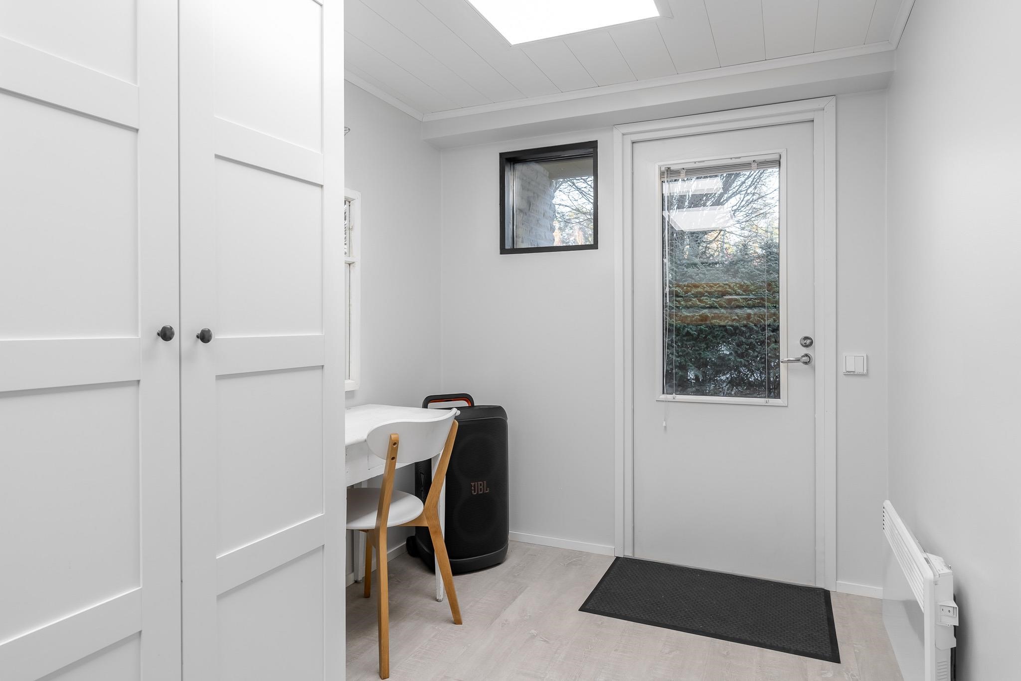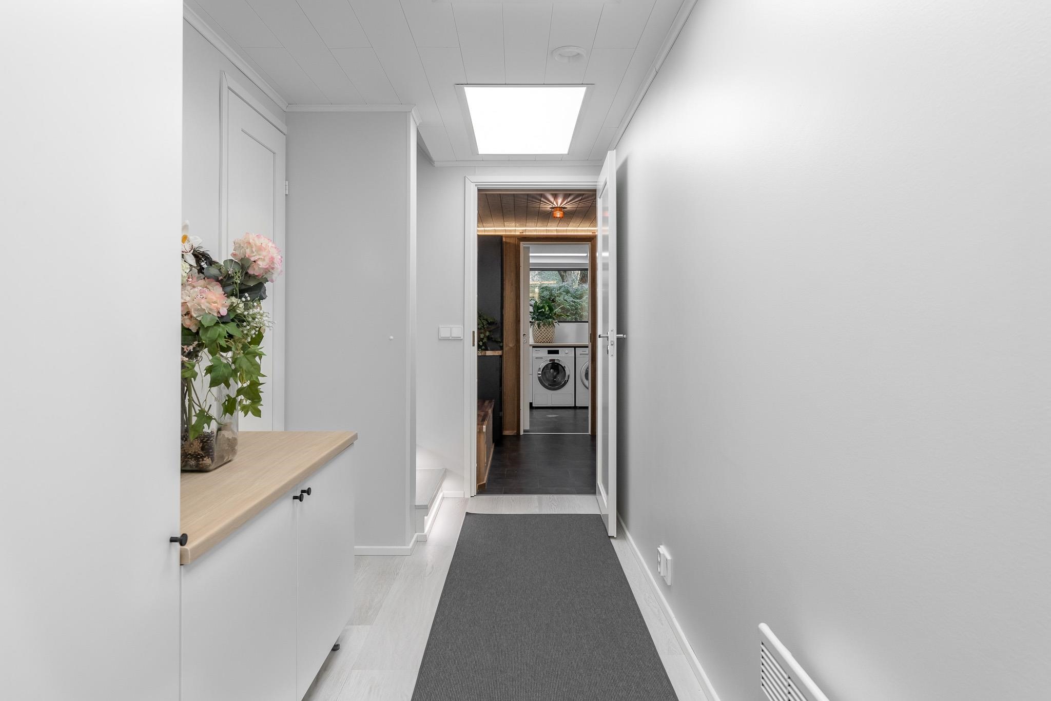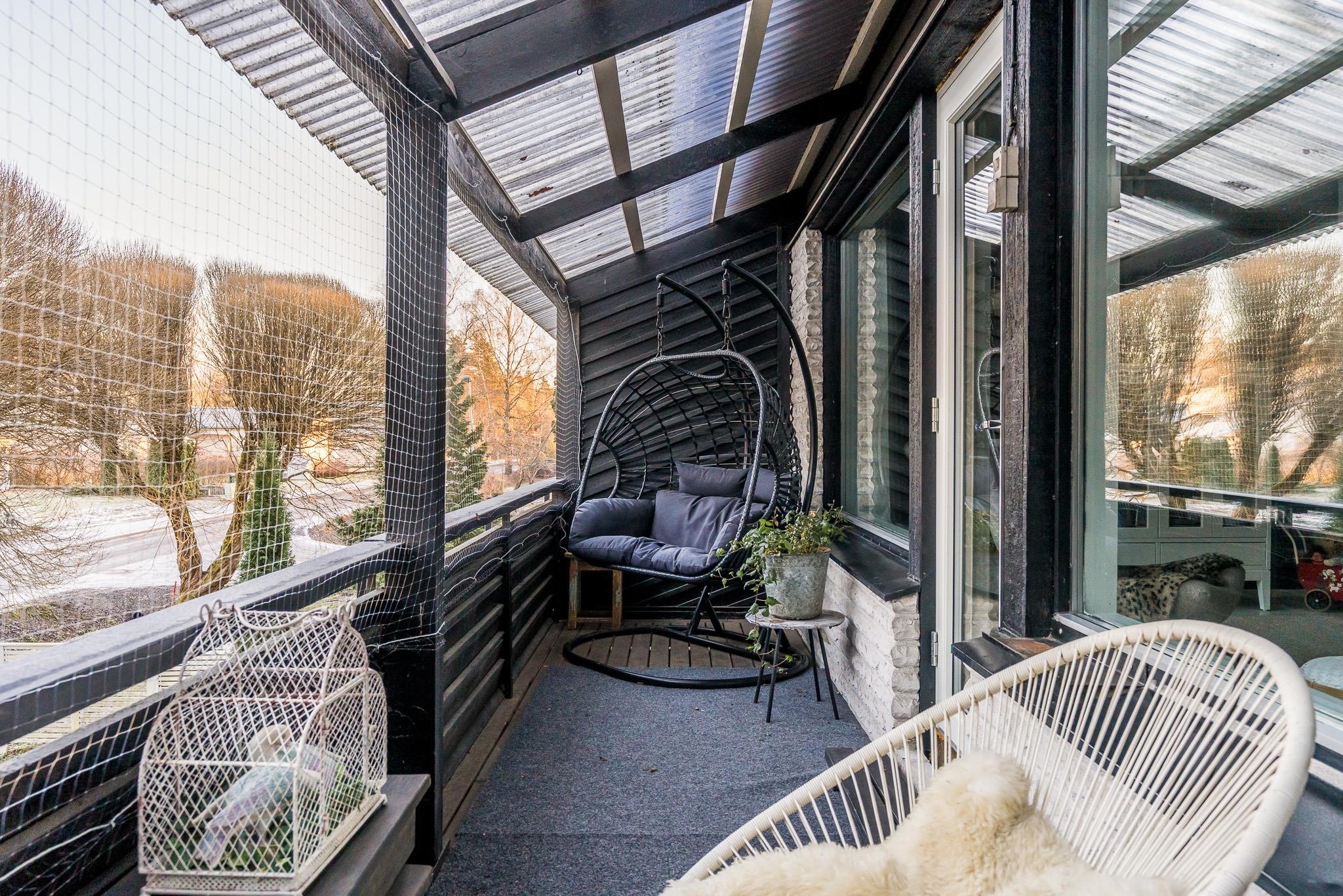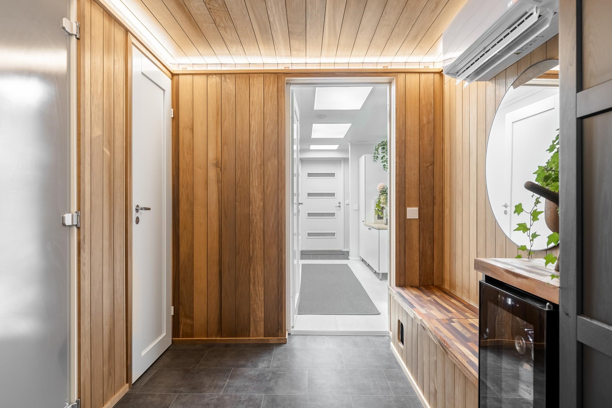 Kodin tehokas pohjaratkaisu jakautuu kahteen asuinkerrokseen. Yläkerrassa sijaitsee avara olohuone, keittiö, työtila, makuuhuone, vaatehuone ja wc. Alakerrasta löytyy kodin pesu- ja saunatilat, kodinhoitohuone, toinen wc, työtila ja nämä tilat ovat alle 220cm korkea tilaa yhteensä 32,5m2 sekä runsaasti varastotilaa. Keittiö tarjoaa nykyaikaiset varusteet ruoanlaittoon, ja olohuoneessa on tunnelmaa luova varaava takka. Parvekkeelta avautuvat näkymät alapihan isolle terassille, ja aidatun takapihan nurmialueelle.
