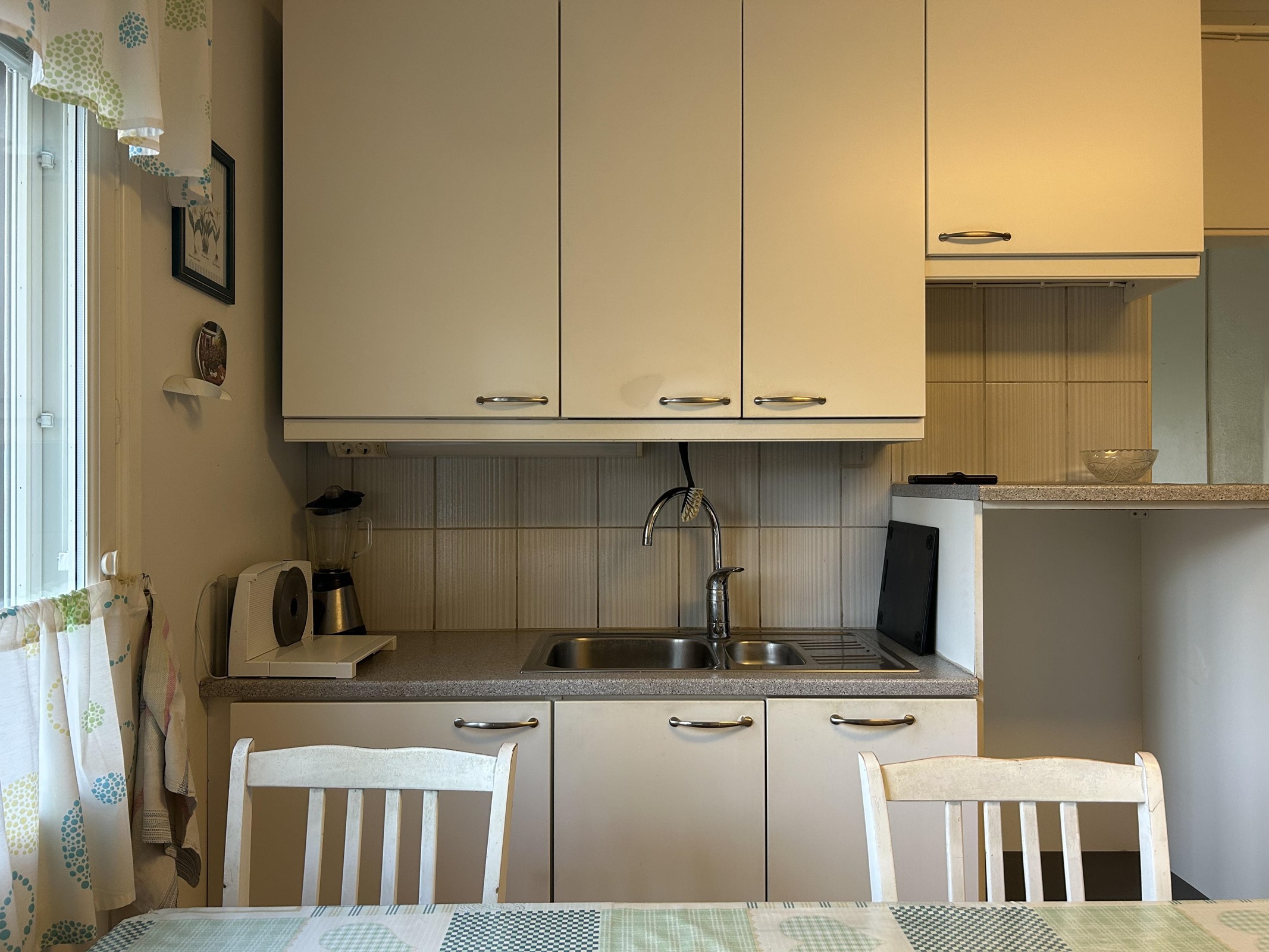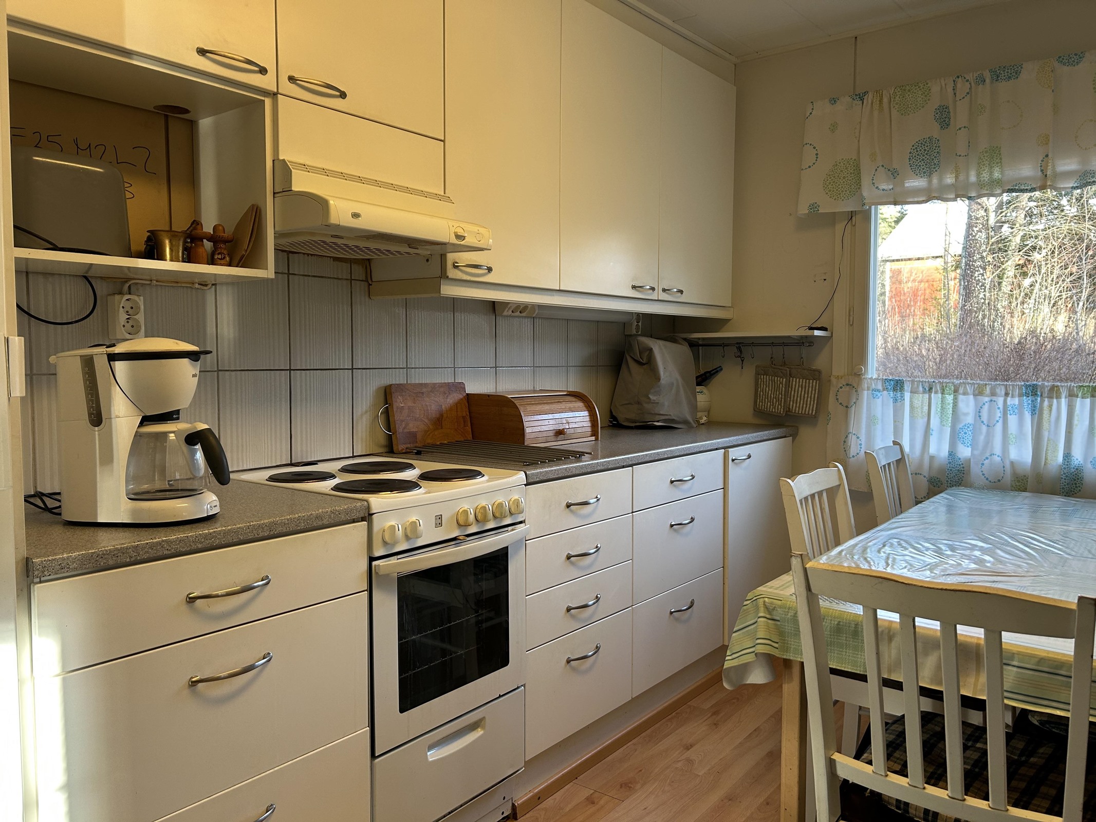 - Jääviileäkaappi, pakastekaappi Arkkupakastin, alakerroksessa, lattialiesi, sähköliesi, liesituuletin, leivinuuni, kaapistot, kiinteät valaisimet.