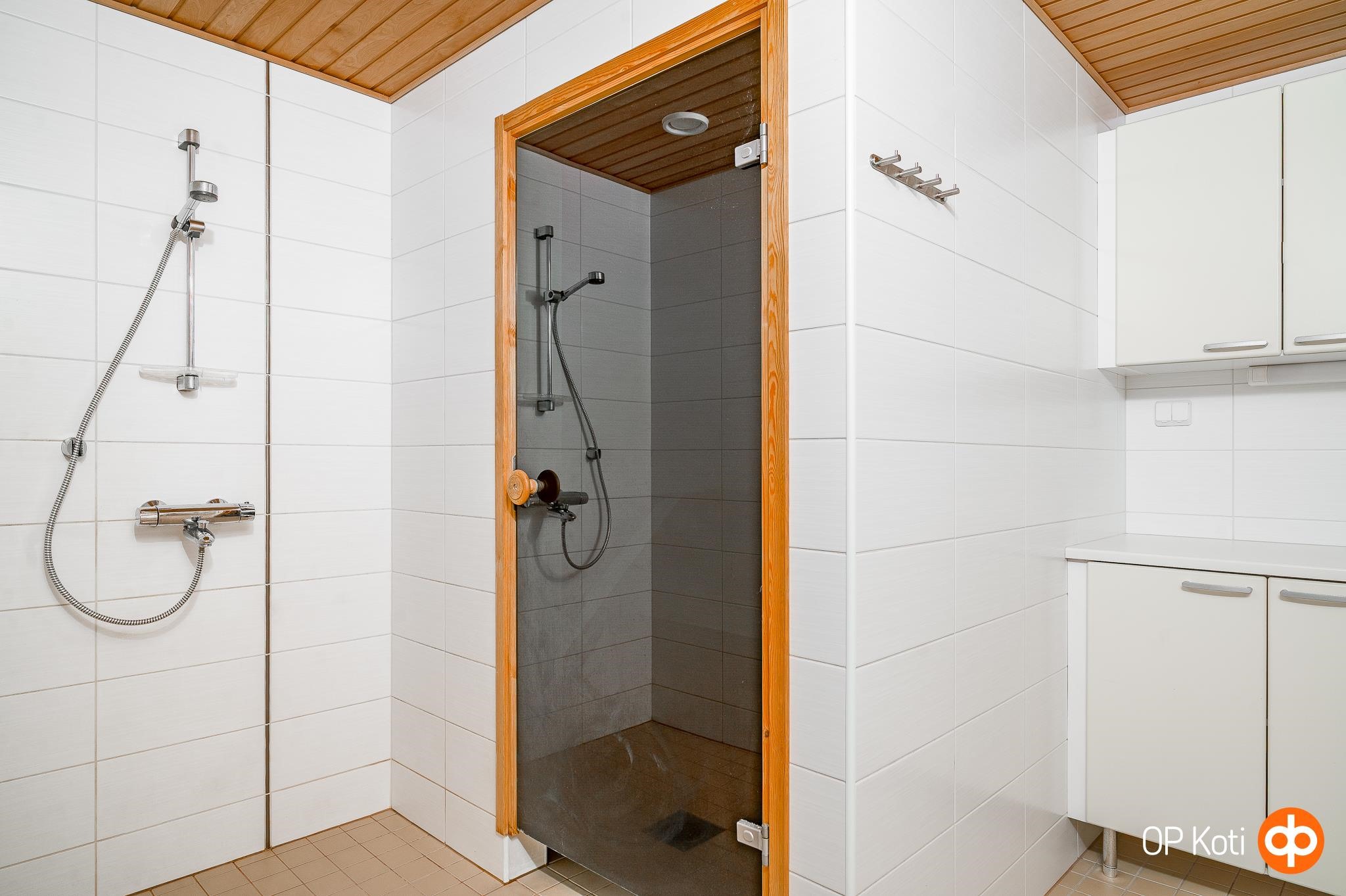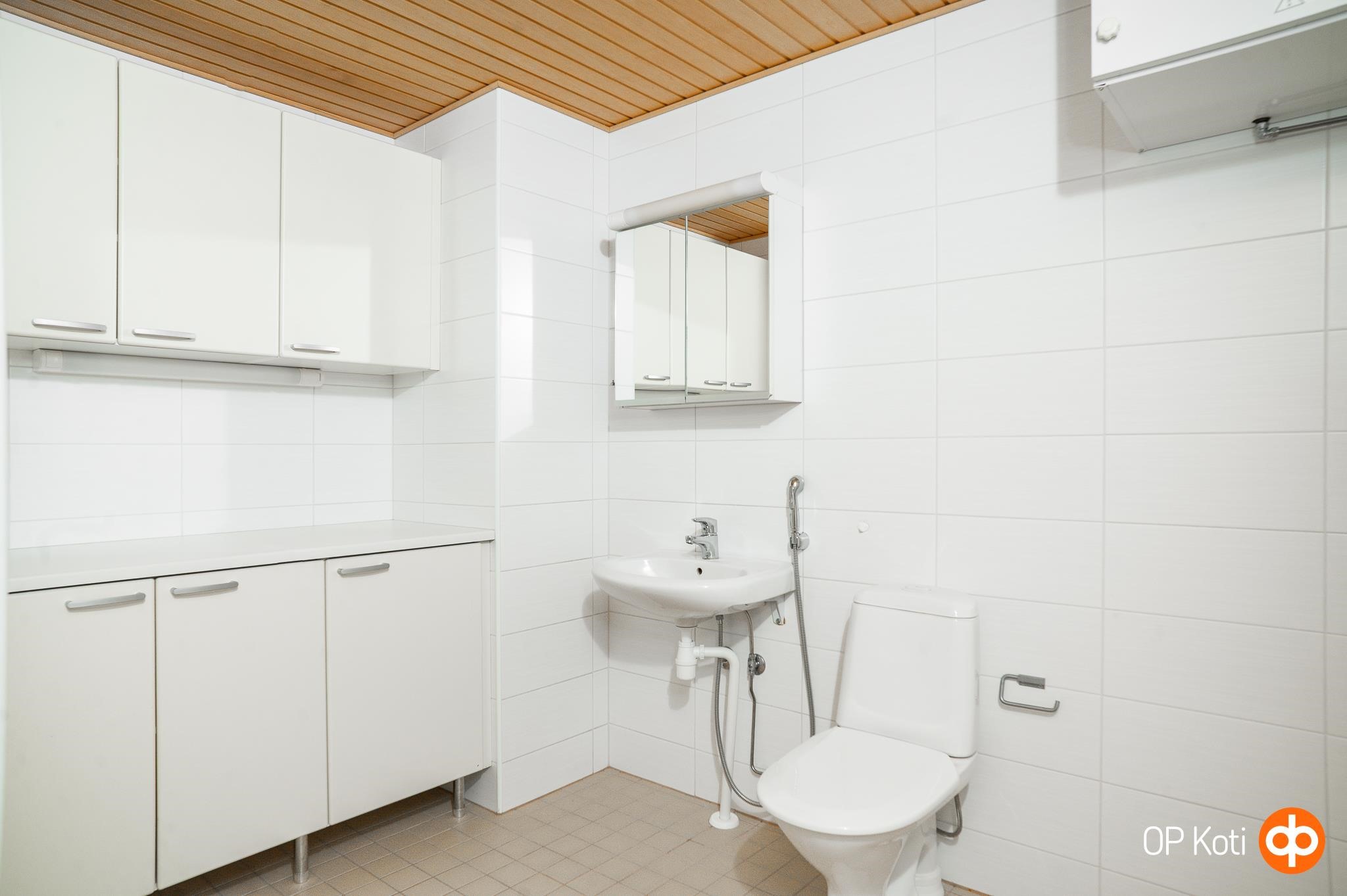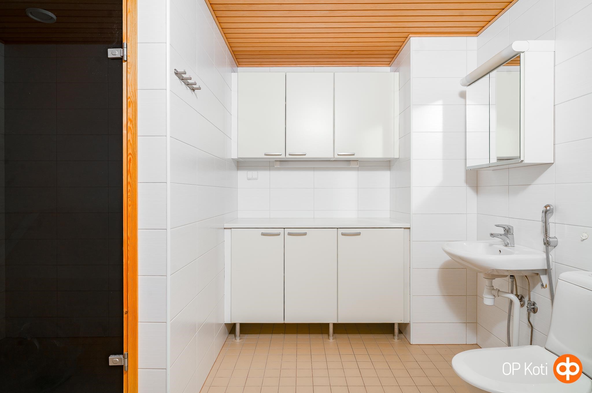 - Sauna, sähkökiuas, kylpyhuone, suihku, peilikaappi, kaapit, pesukoneliitäntä, lattialämmitys, kiinteät valaisimet.