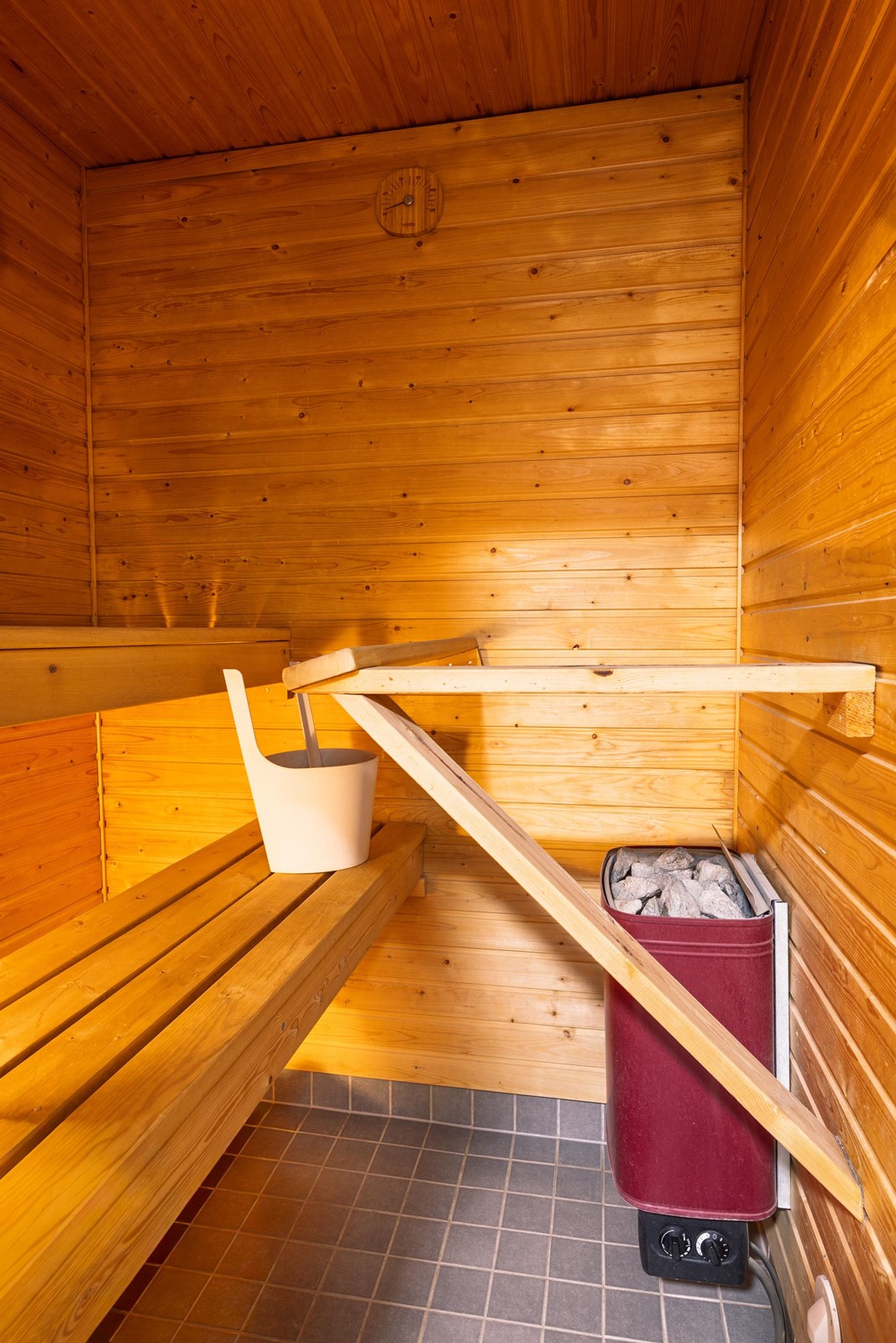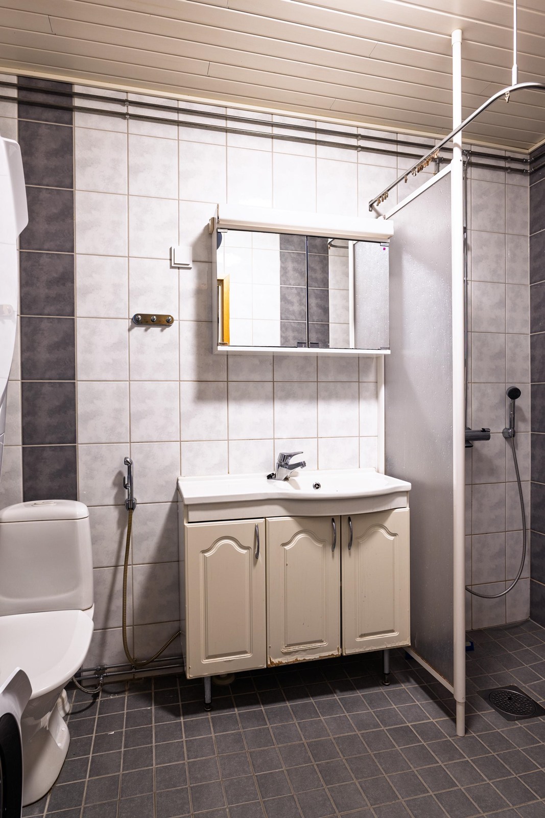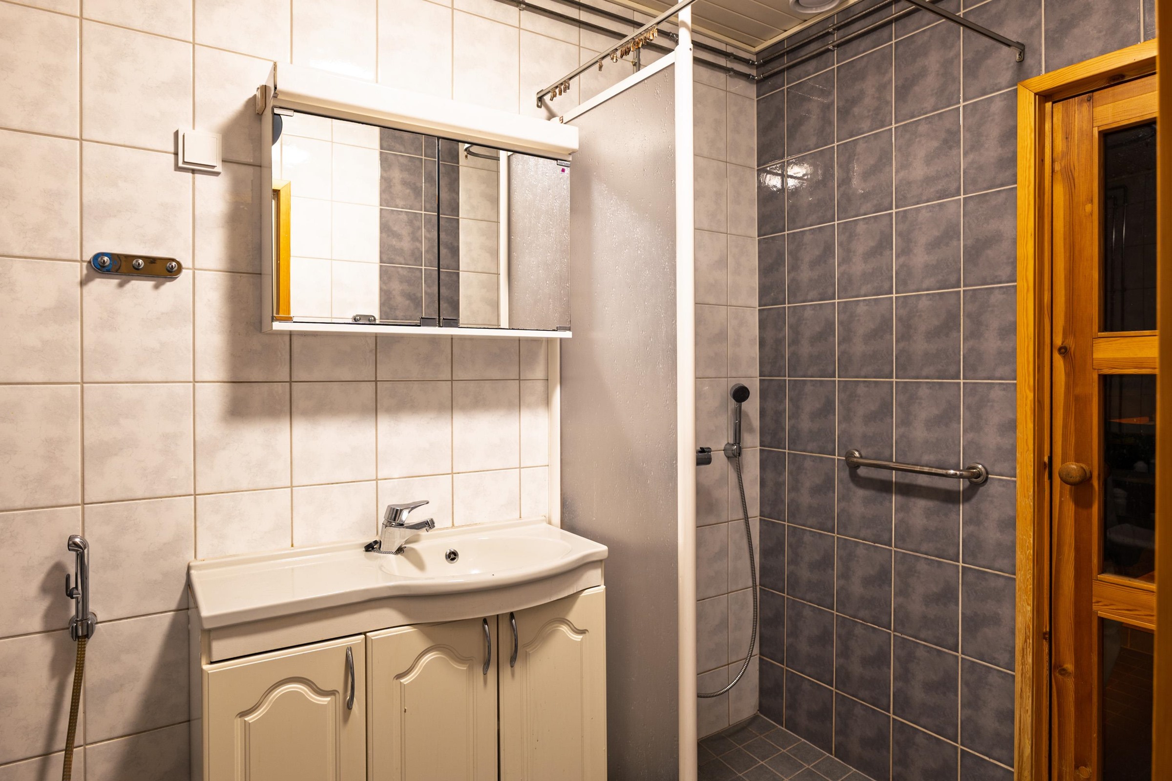 - Sauna, sähkökiuas, kylpyhuone, suihku, peilit.