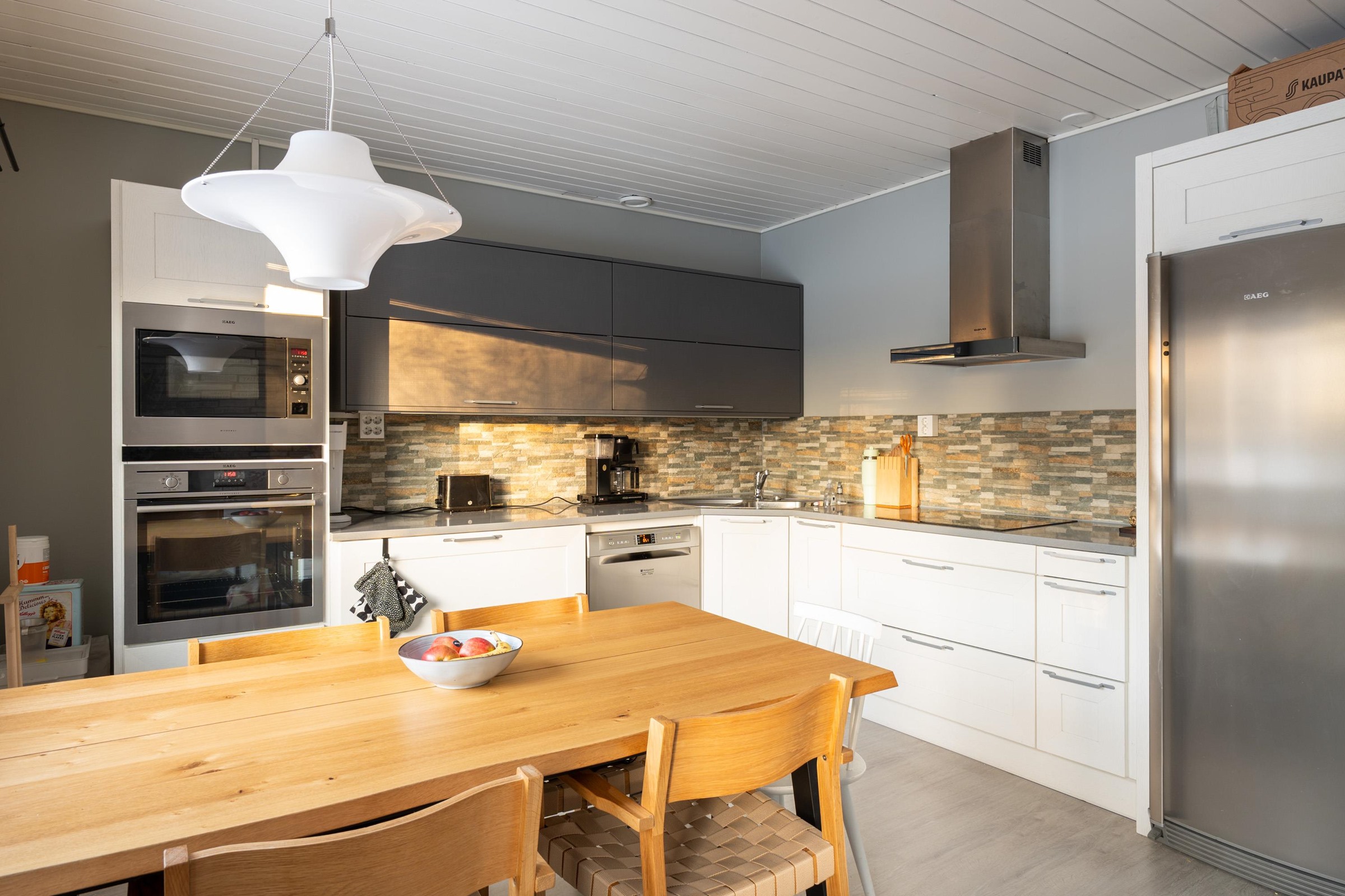 - Jääkaappi, erillisuuni, liesi, liesituuletin, astianpesukone, kaapistot, kiinteät valaisimet.