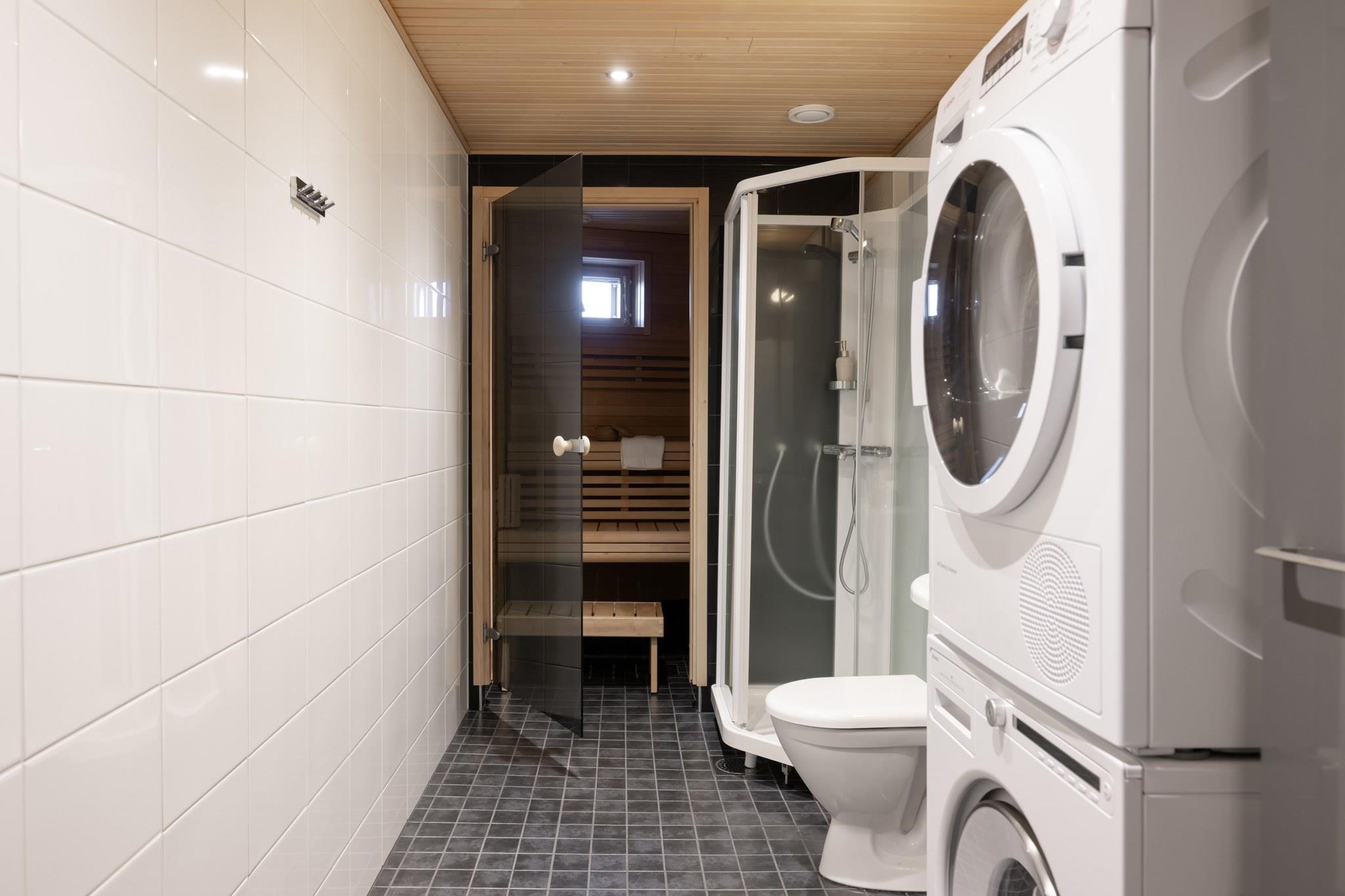 - Sauna, sähkökiuas, kylpyhuone, suihku, suihkukaappi, peilikaappi, kaapit, allaskaappi, pesukoneliitäntä, lattialämmitys, kiinteät valaisimet.