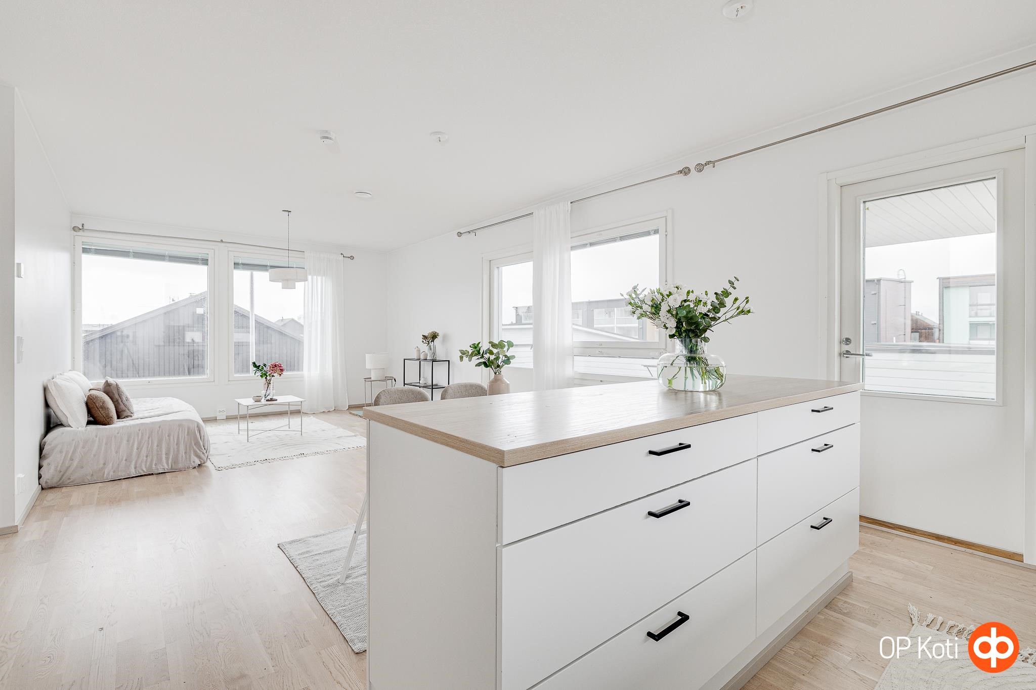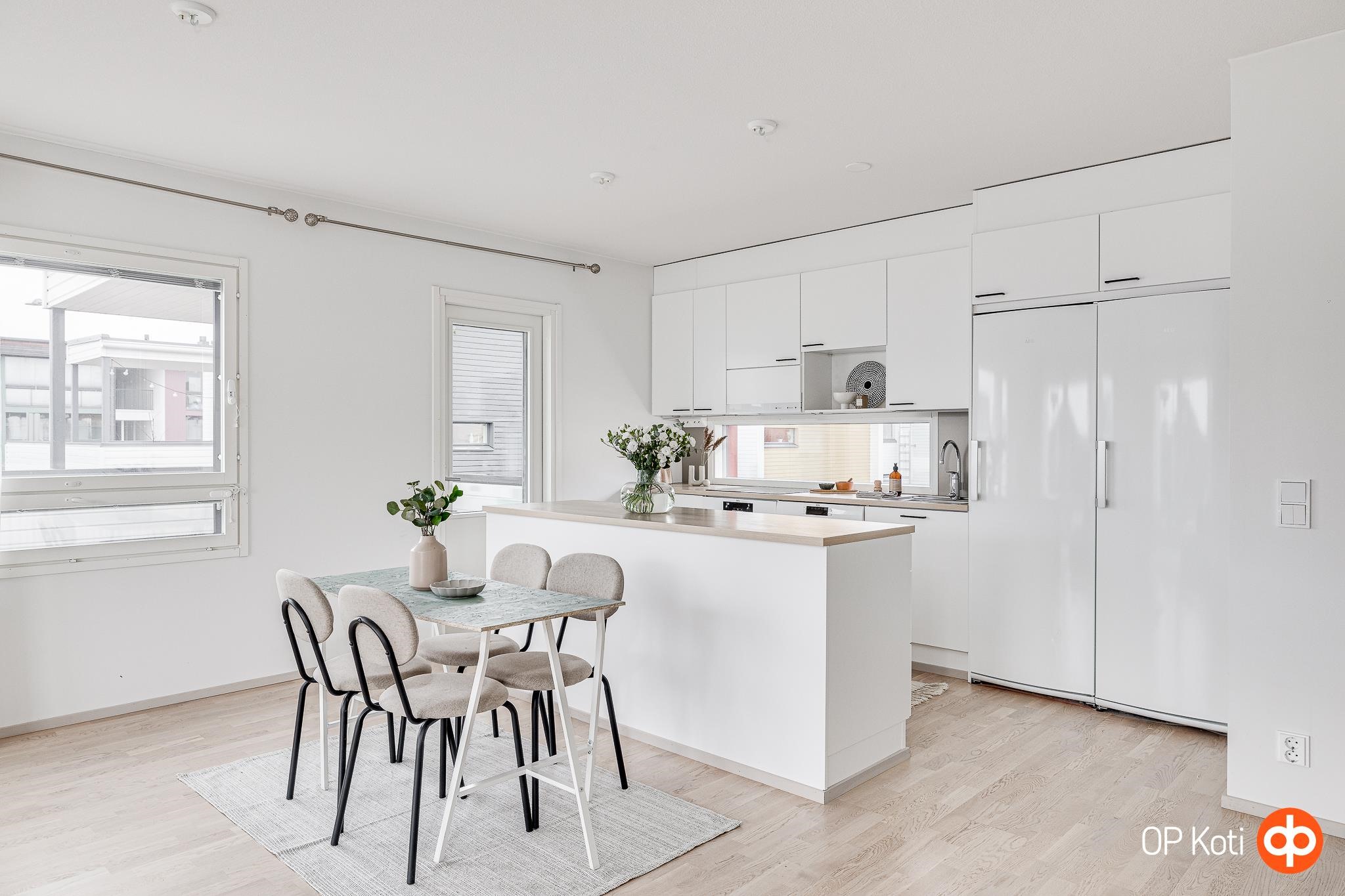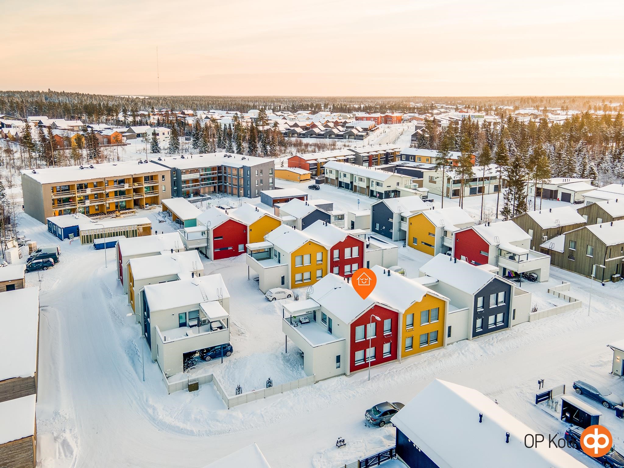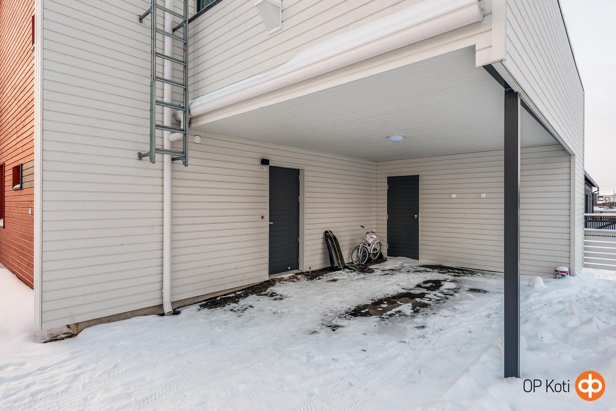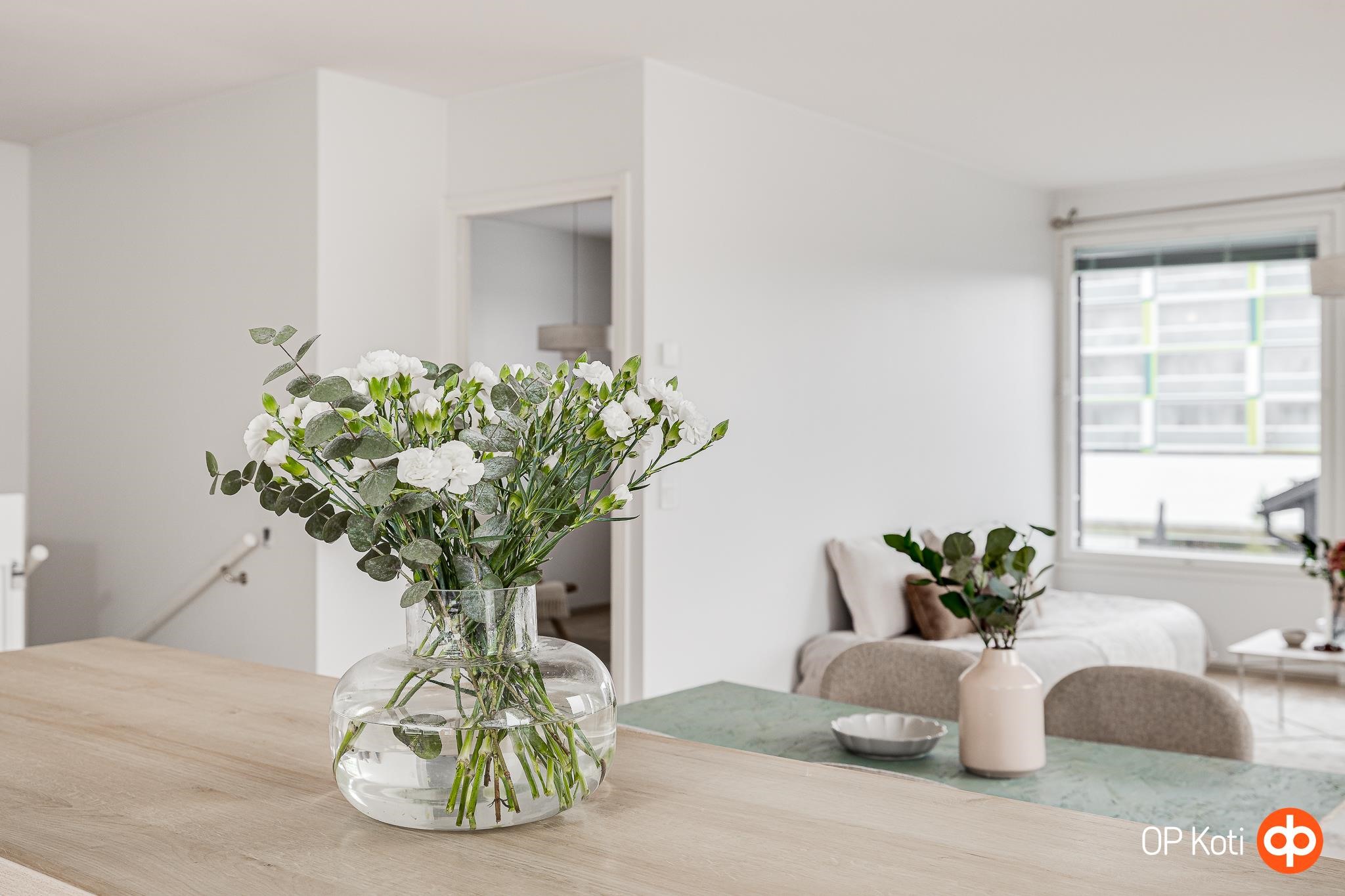 Koti kätkee sisäänsä 112 neliömetriä asuintilaa. Alakerrassa sijaitsee kodin kolme makuuhuonetta ja pesutilat, sauna sekä kodinhoitohuone. Yläkerrassa sijaitseva moderni keittiö saarekkeineen on varustettu laadukkailla kodinkoneilla. Keittiön yhteydessä on tilava olohuone, josta pääsee suoraan tilavalle parvekkeelle. Yläkerrassa on myös yksi kodin makuuhuoneista ja wc. Asunnossa on myös vaatehuone ja ulkovarasto, jotka takaavat riittävät säilytystilat. Lisäksi autopaikka jo on kaksi.