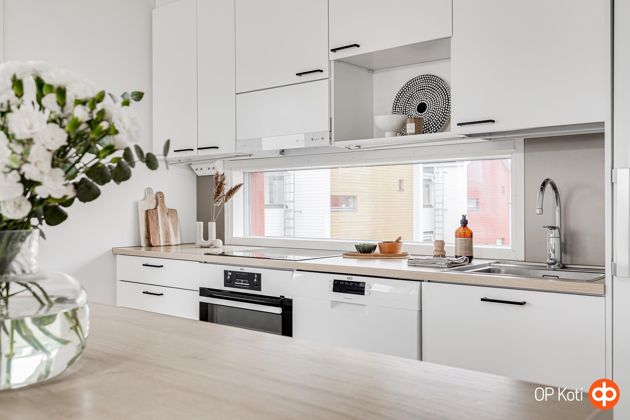 - Jääkaappi, pakastekaappi, erillisuuni, liesitaso, liesituuletin, mikroaaltouuni, astianpesukone, kaapistot, kiinteät valaisimet.