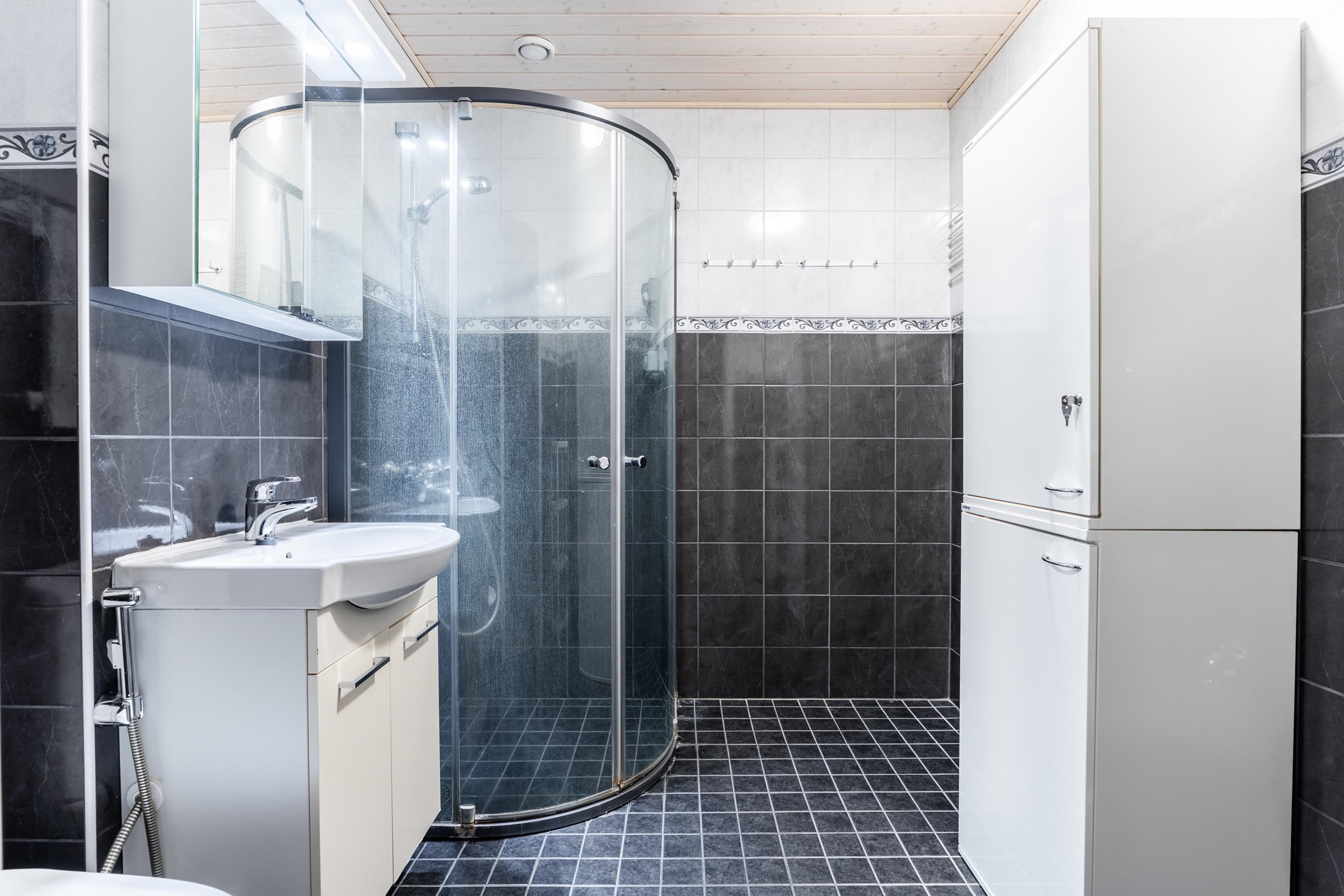 - Kylpyhuone, erillinen wc, suihku, suihkuseinä, peilikaappi, allaskaappi, pesukoneliitäntä, kiinteät valaisimet. wc remontoitu 2025