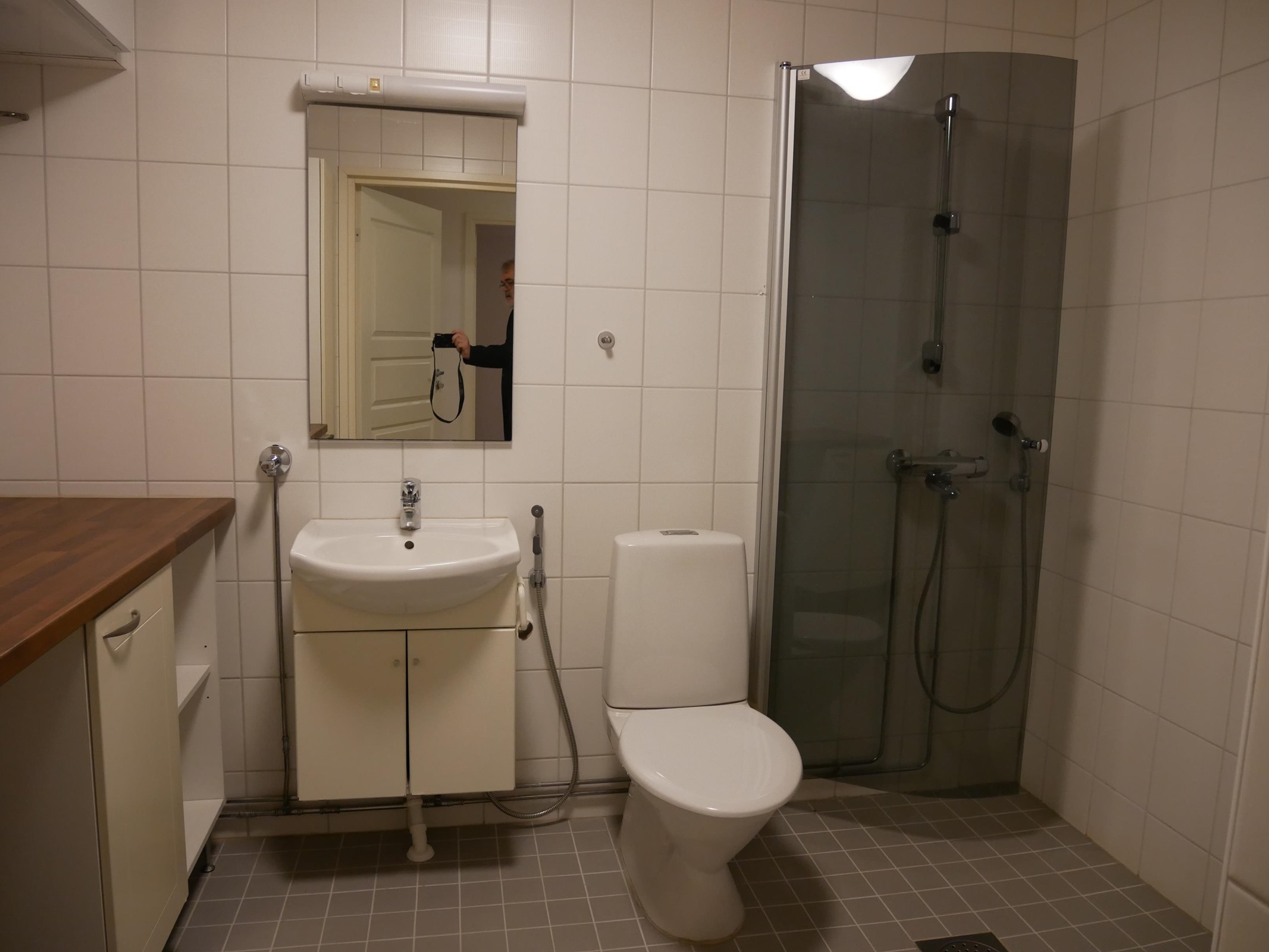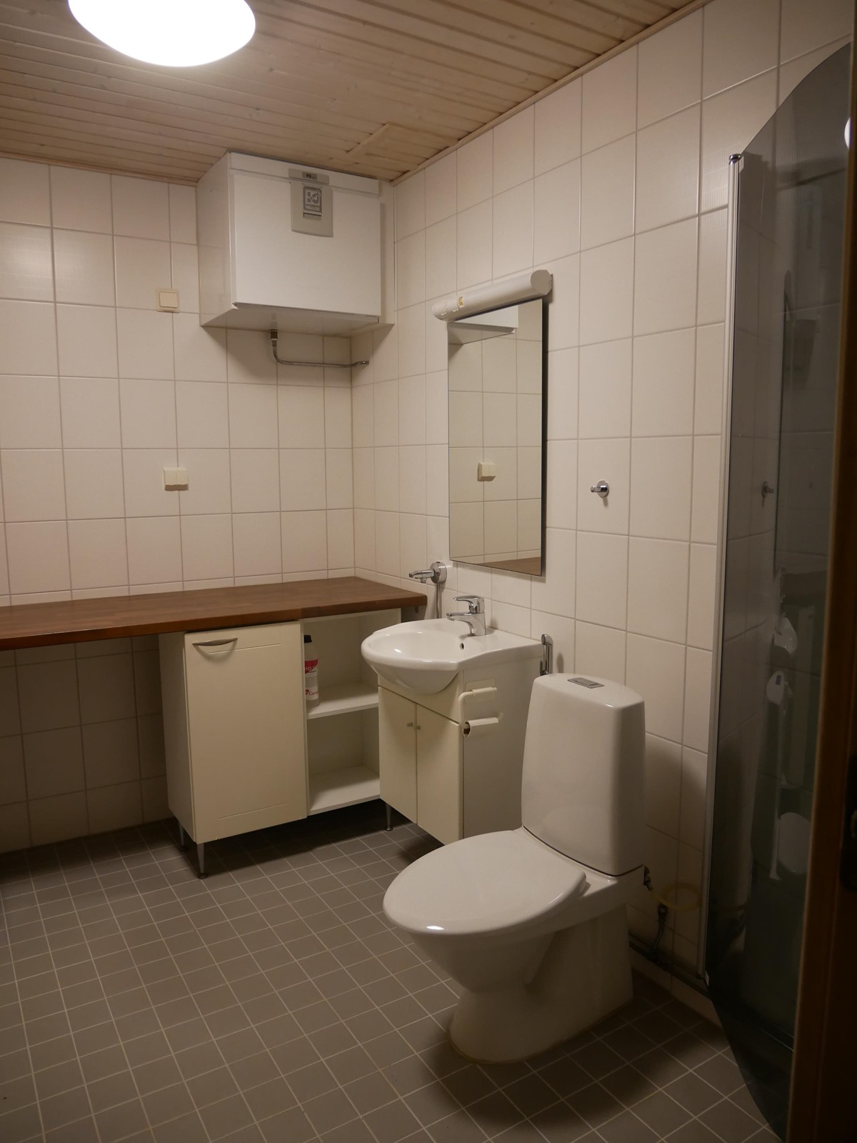 - Sauna, sähkökiuas, kylpyhuone, suihku, suihkuseinä, peilit, kaapit, allaskaappi, pesukoneliitäntä, lattialämmitys, kiinteät valaisimet.