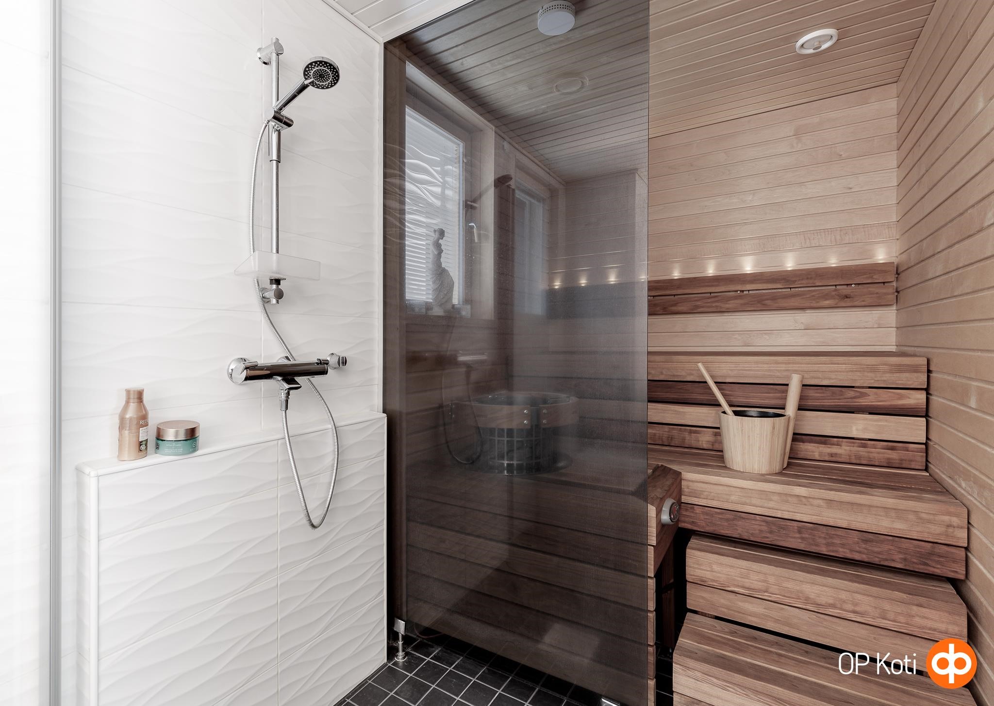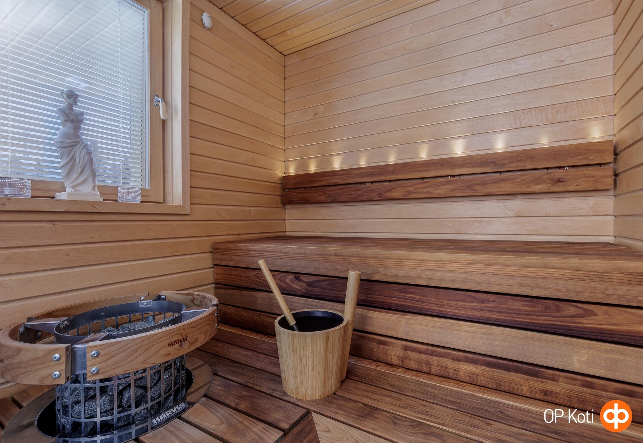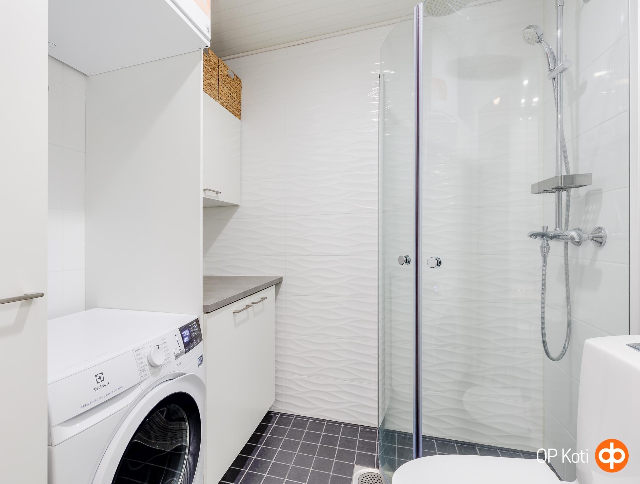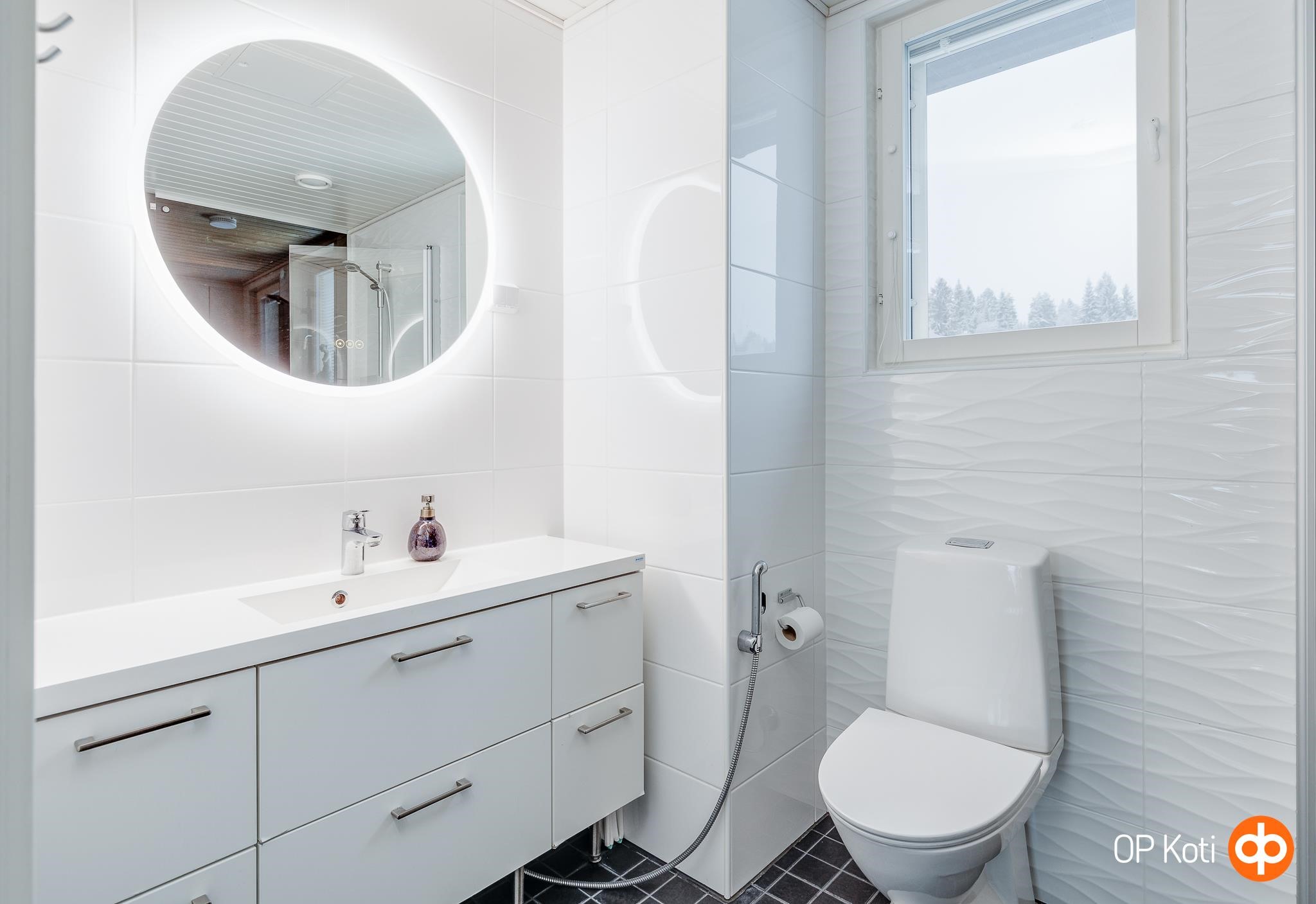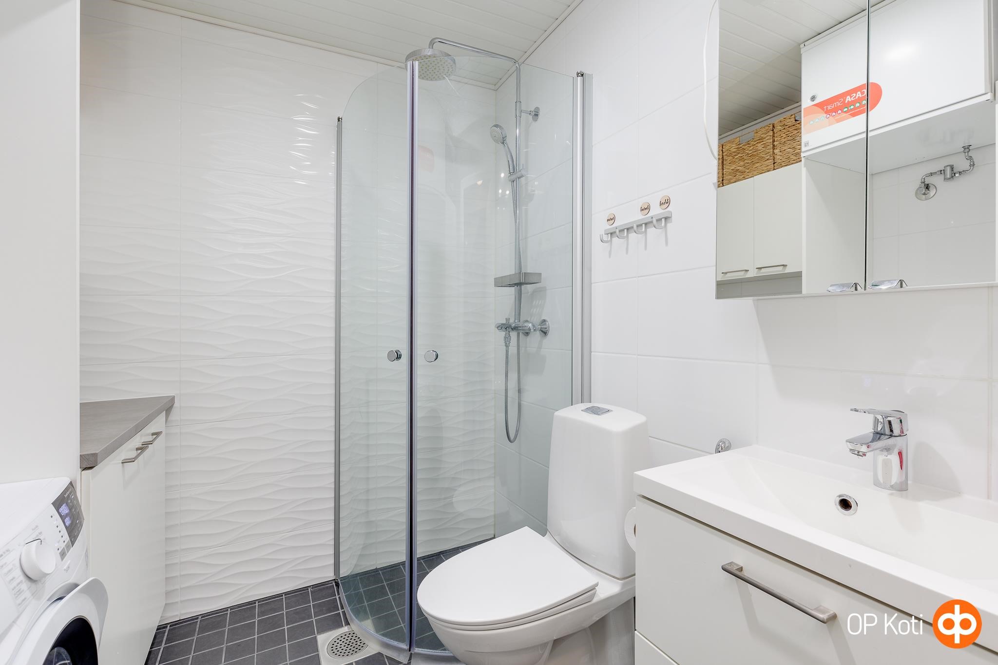- Sauna, sähkökiuas, kylpyhuone, erillinen wc, suihku kaksi erillistä suihkua ala- ja yläkerrassa, suihkuseinä, peilit, peilikaappi, kaapit, pesukoneliitäntä, lattialämmitys, kiinteät valaisimet.