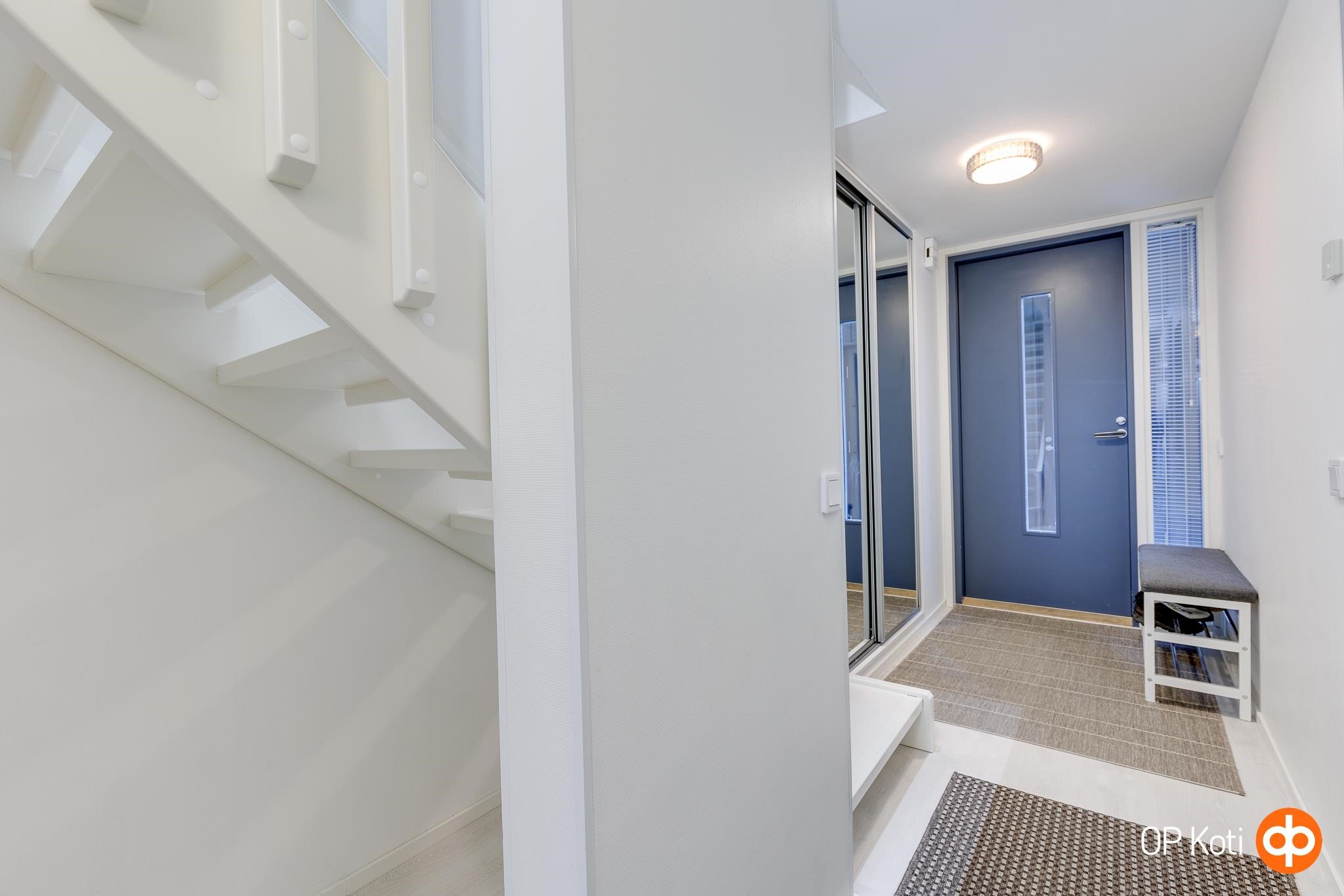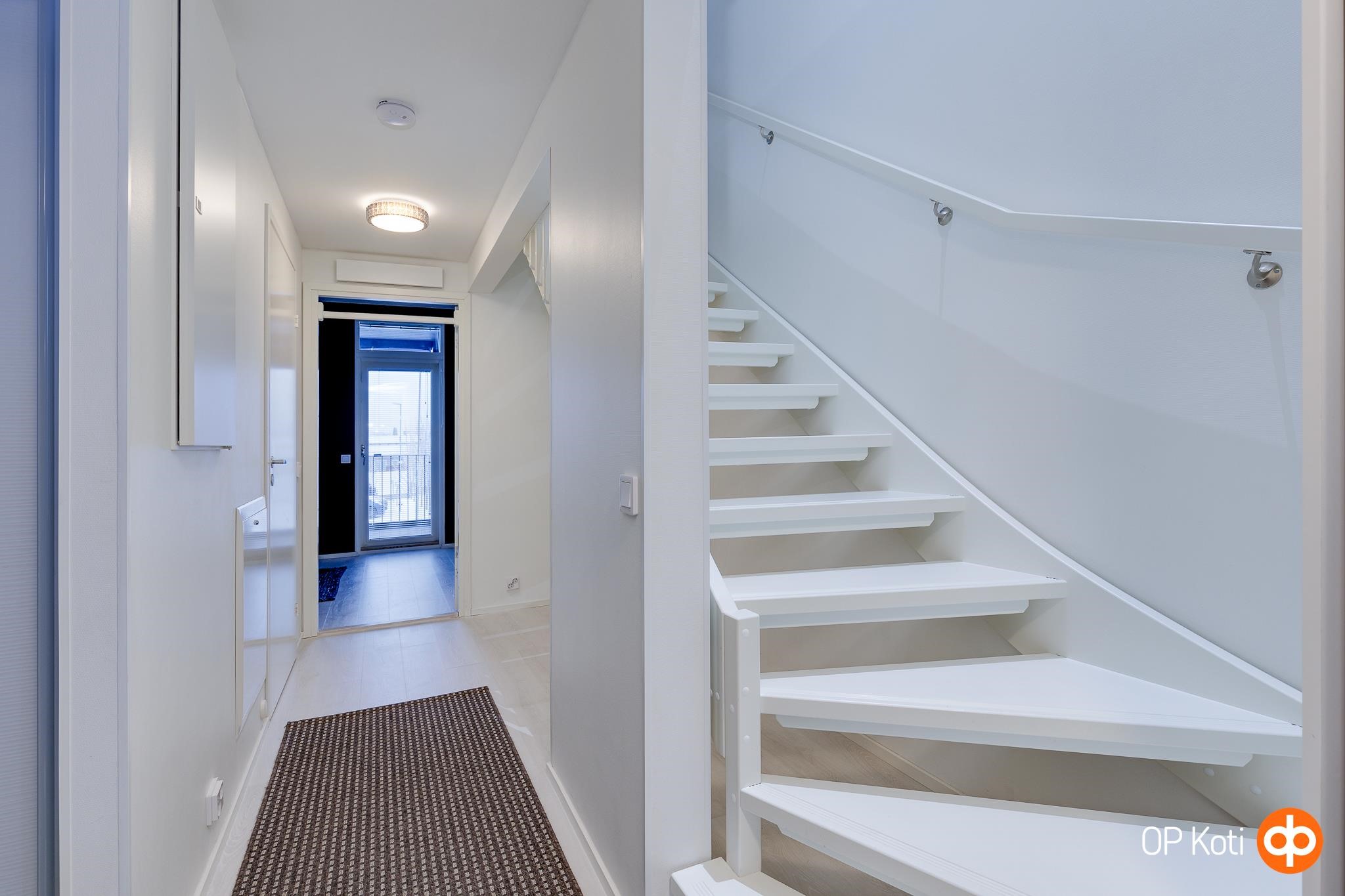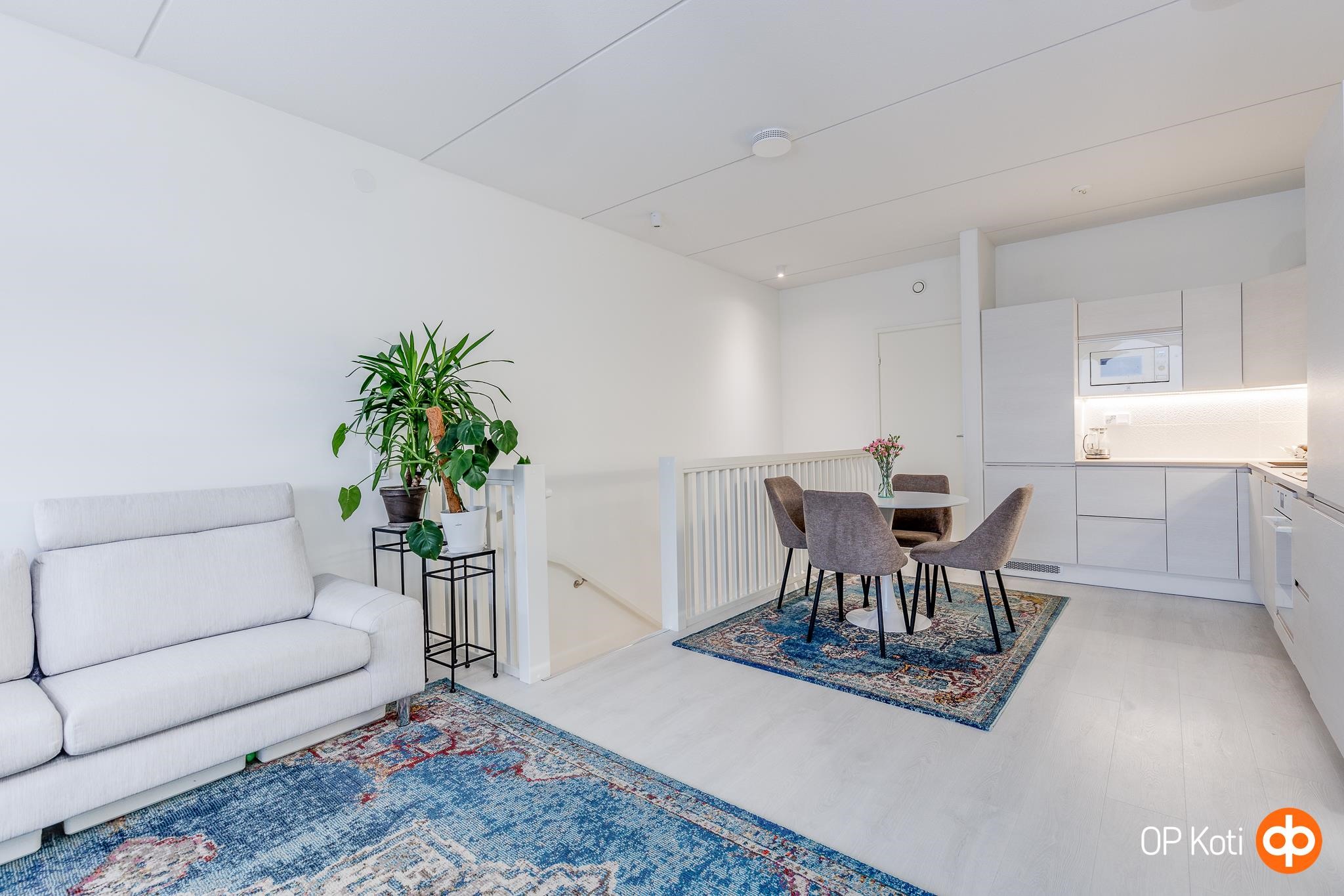 Huoneisto käsittää kaksi makuuhuonetta, tupakeittiön, saunan ja kaksi erillistä wc:tä, mikä tekee siitä ihanteellisen niin perheelle kuin pariskunnallekin. Keittiö on varustettu laadukkailla kodinkoneilla, kuten jääkaapilla, pakastekaapilla, induktioliedellä ja astianpesukoneella. Huoneistossa on kaksi suihkua (ala- ja yläkerrassa), suihkuseinä ja lattialämmitys, joka lisää mukavuutta arkeen. Asunnon laminaattilattiat ja maalatut seinät tuovat modernia ilmettä, ja säilytystilaa löytyy ulkovarastosta.