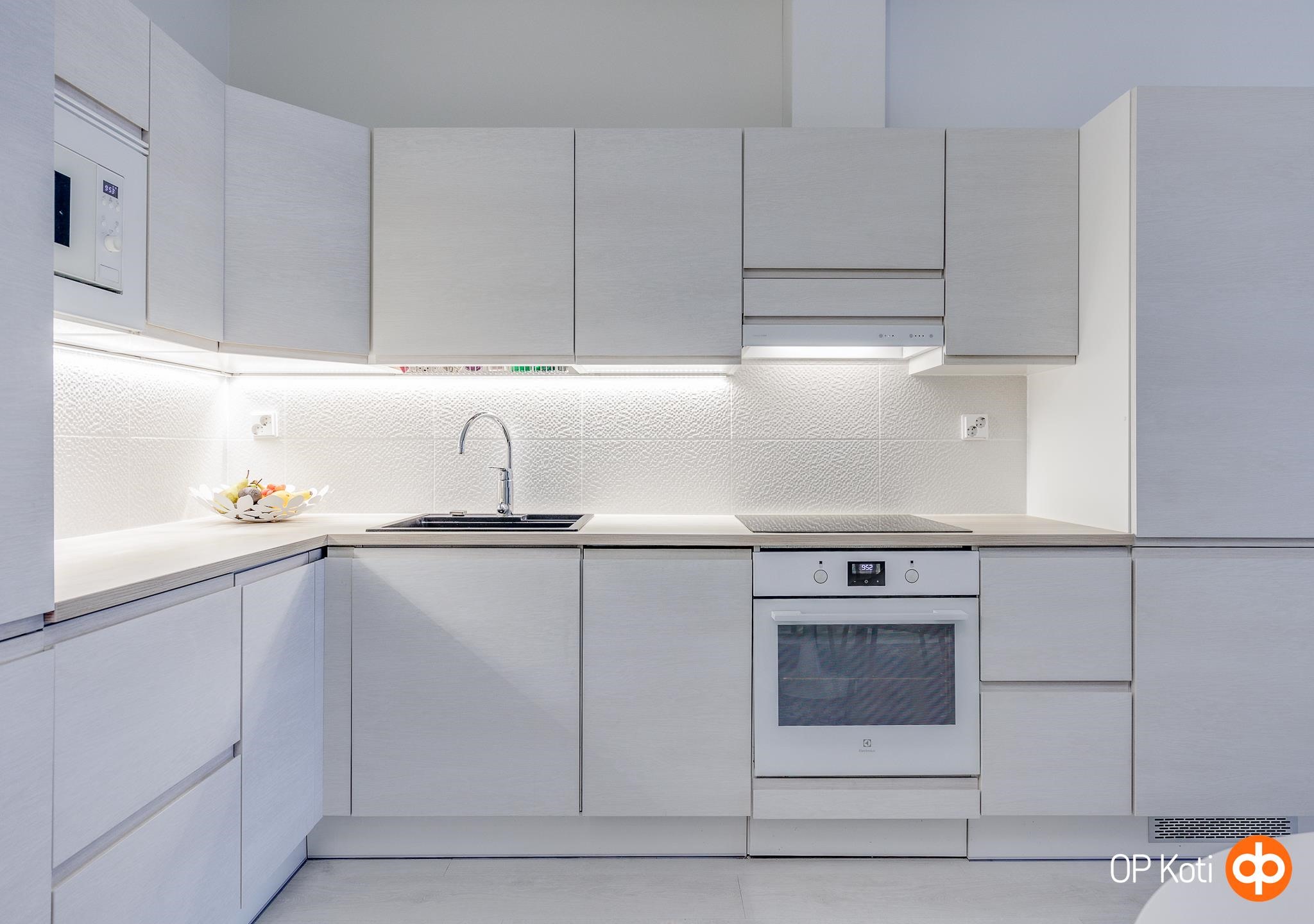 - Jääkaappi, pakastekaappi, lattialiesi, induktioliesi, liesituuletin, mikroaaltouuni integroitu, astianpesukone, kaapistot, kiinteät valaisimet.