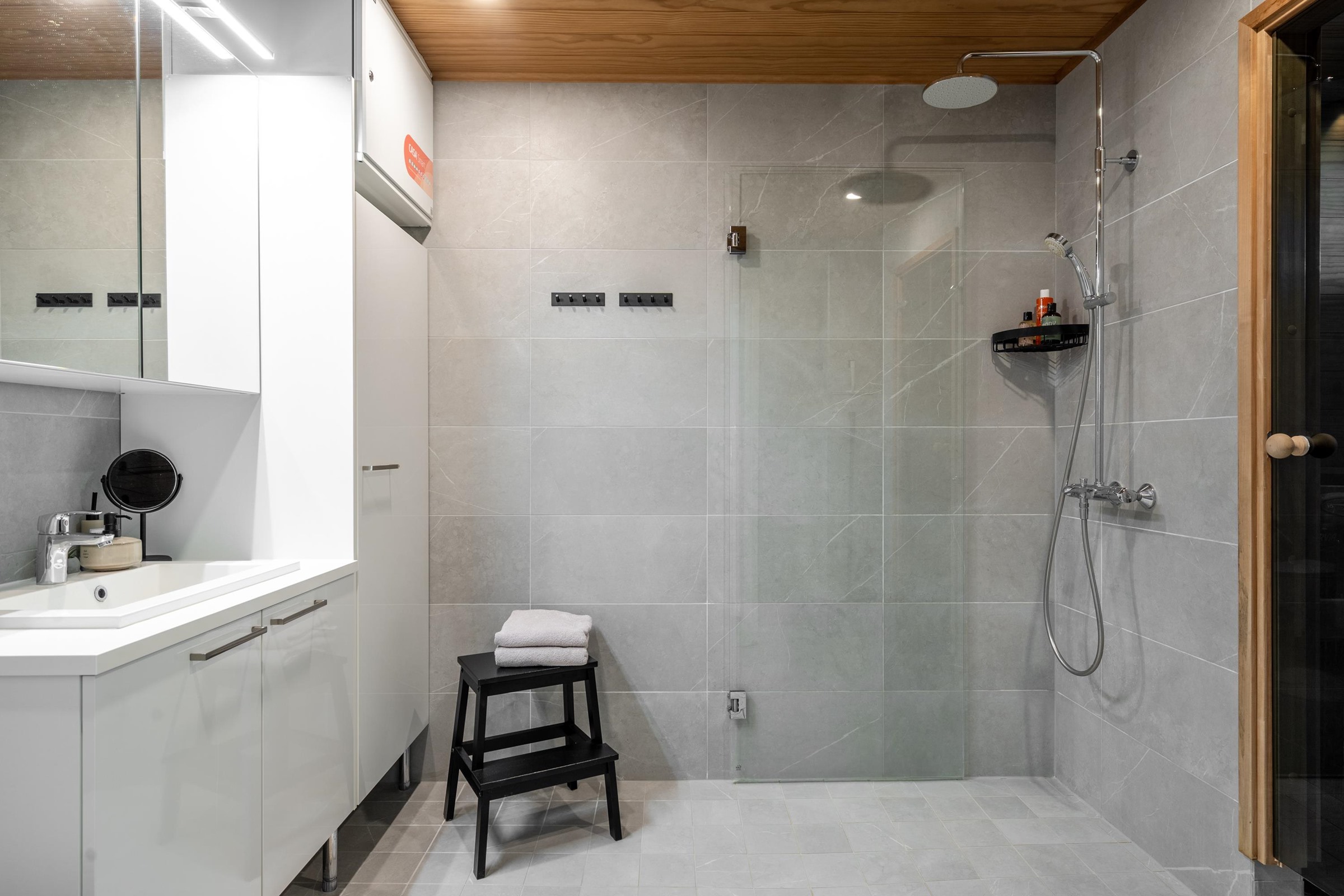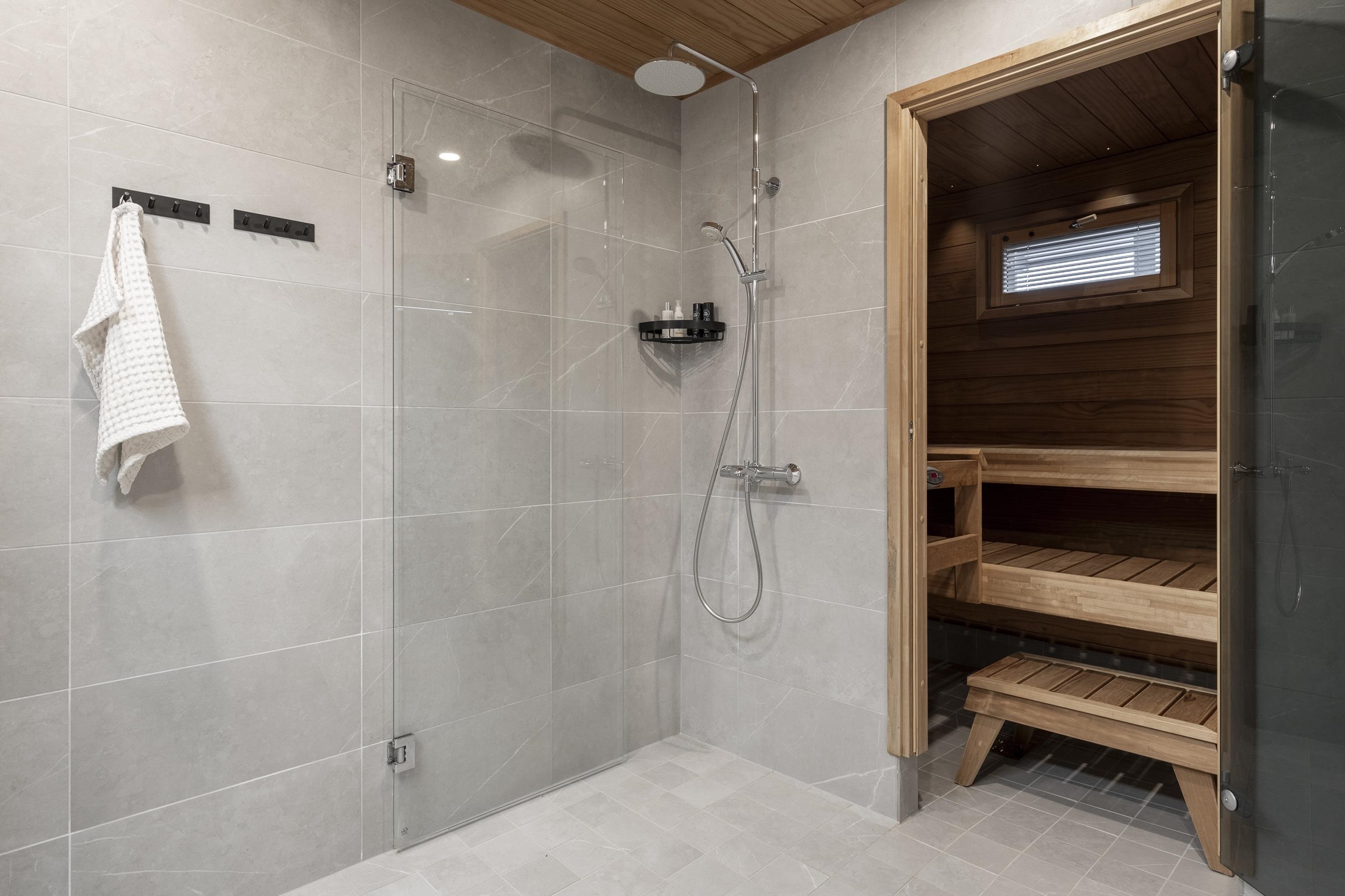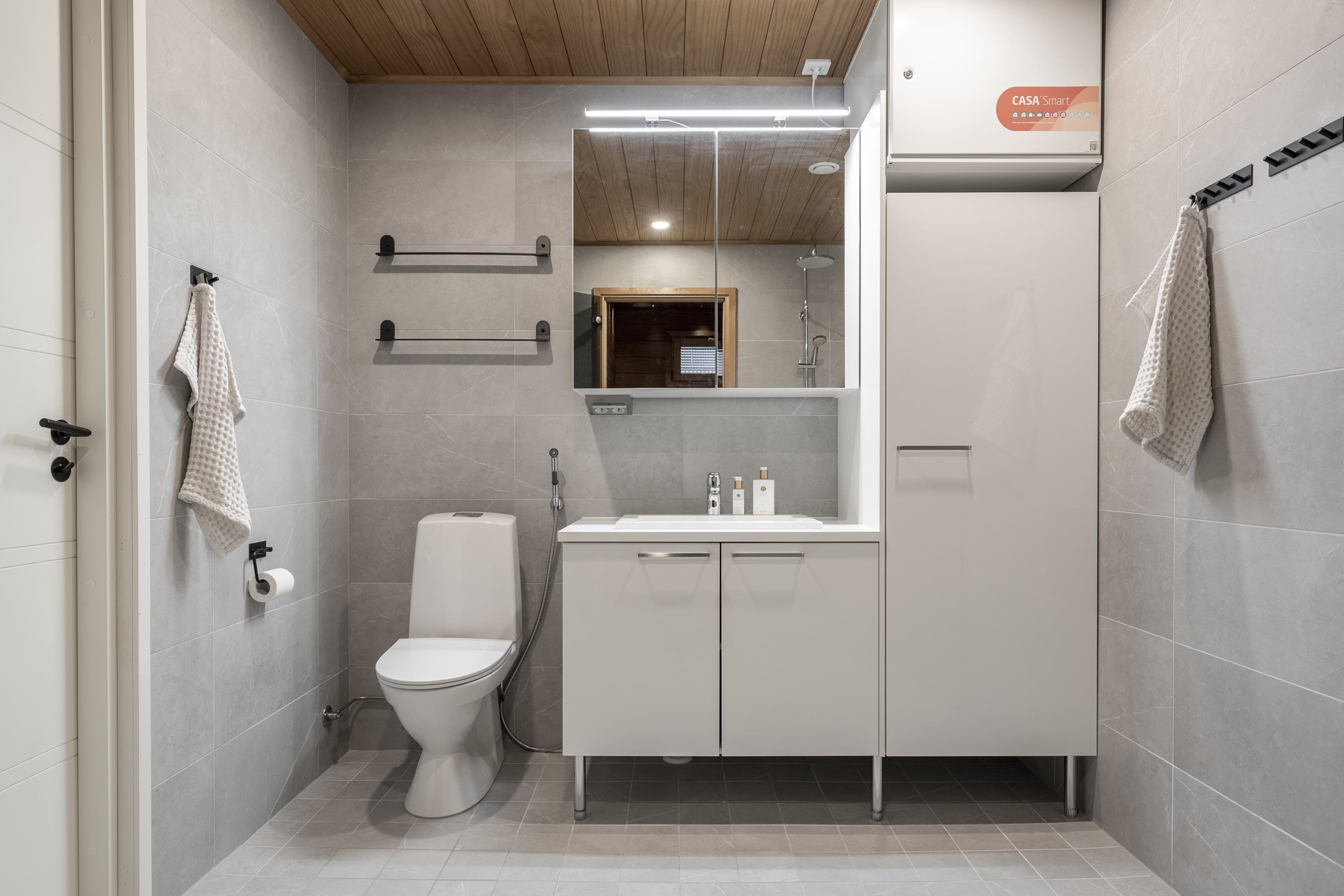 - Sauna, sähkökiuas, kylpyhuone, erillinen wc, suihku, suihkuseinä, peilikaappi, allaskaappi, pesukoneliitäntä Kodinhoitohuoneessa, lattialämmitys Sähkö yläkerran wc, vesikiertoinen lattialämmitys muut kosteat tilat, kiinteät valaisimet.