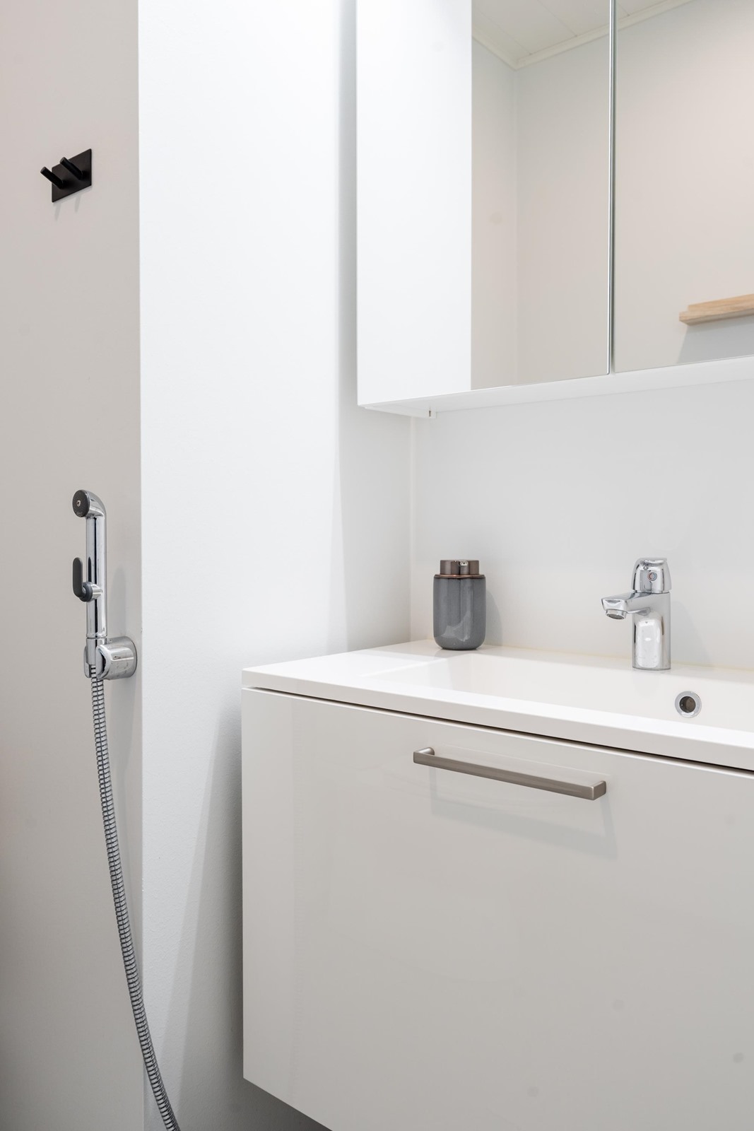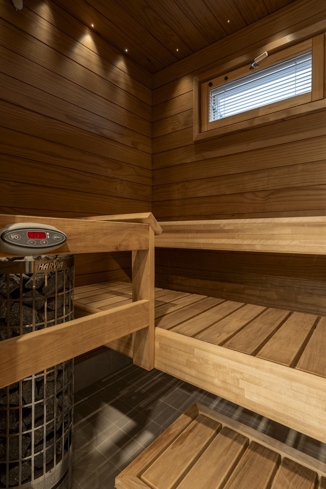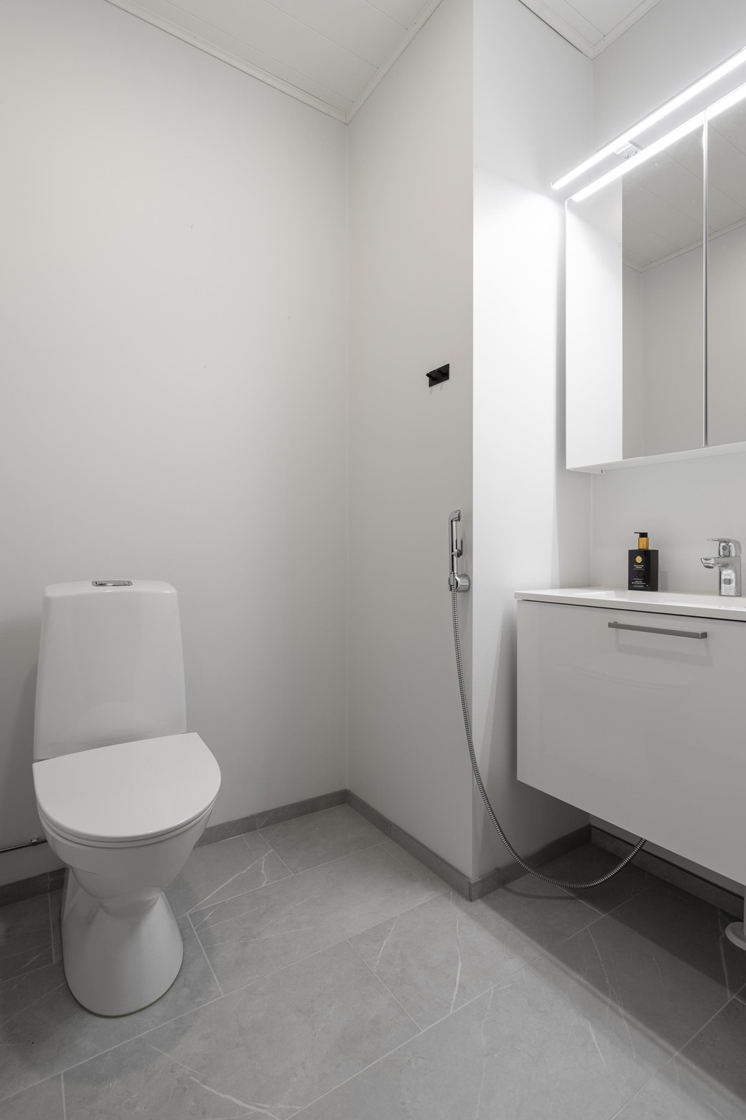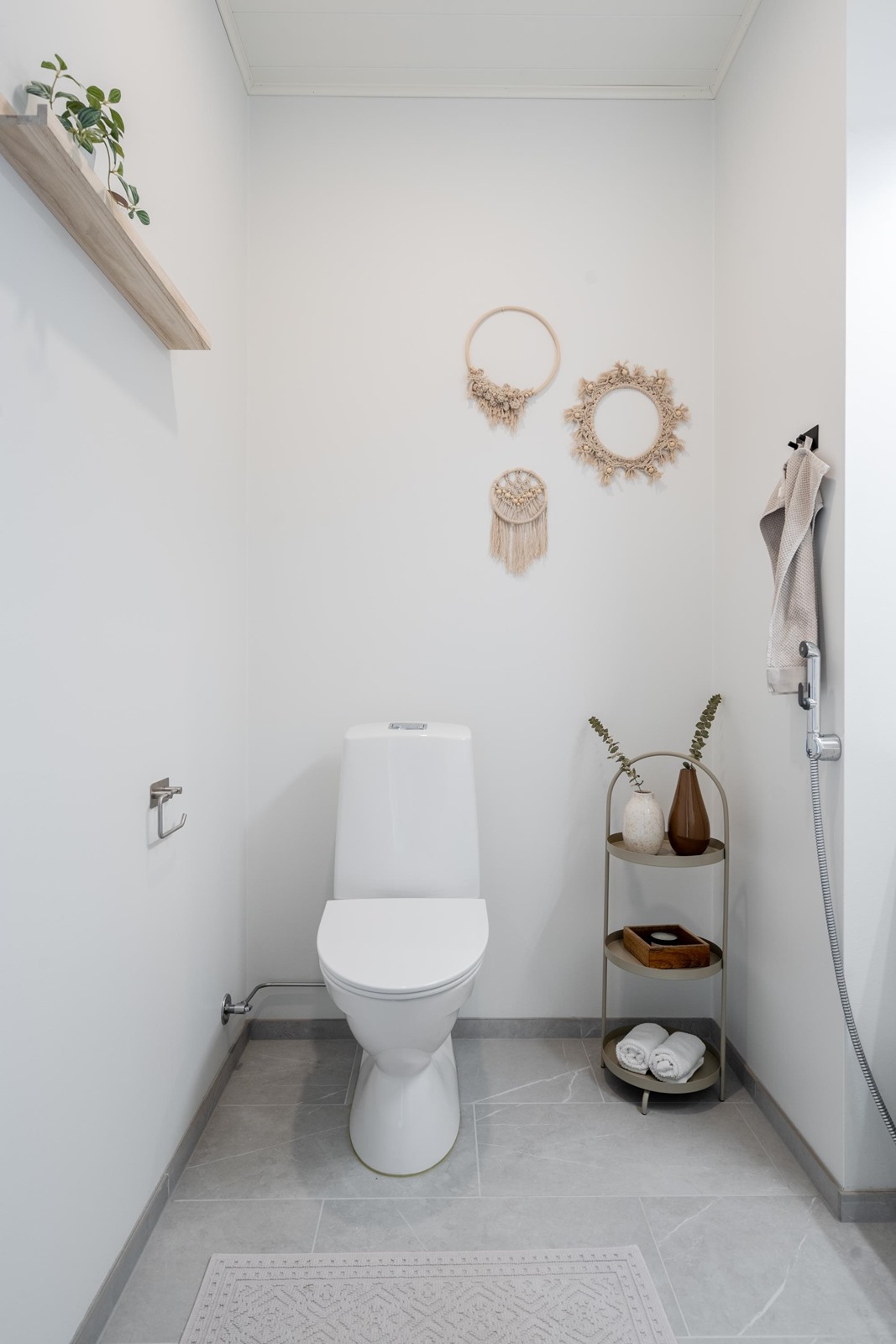 - Sauna, sähkökiuas, kylpyhuone, erillinen wc, suihku, suihkuseinä, peilikaappi, allaskaappi, pesukoneliitäntä Kodinhoitohuoneessa, lattialämmitys Sähkö yläkerran wc, vesikiertoinen lattialämmitys muut kosteat tilat, kiinteät valaisimet.
