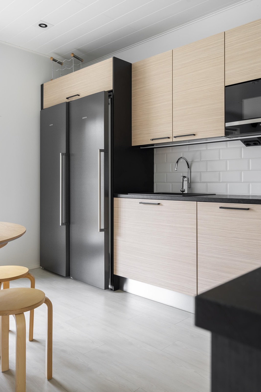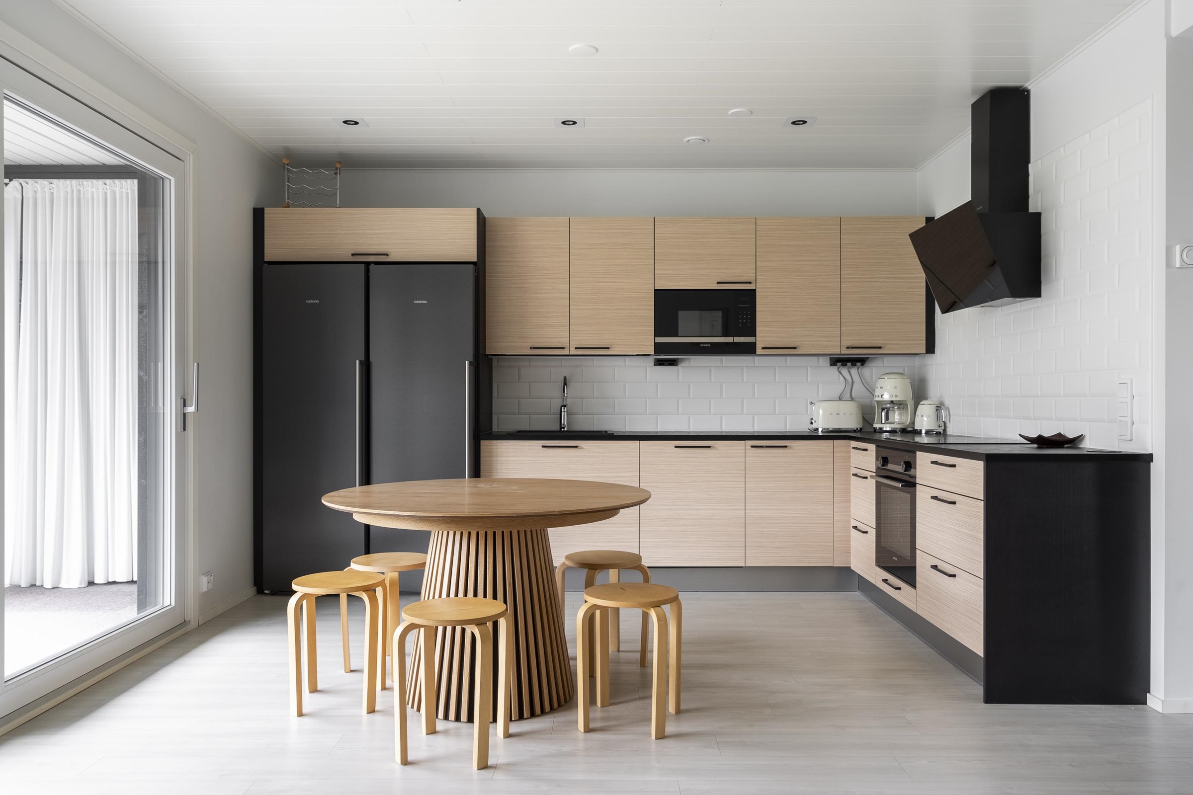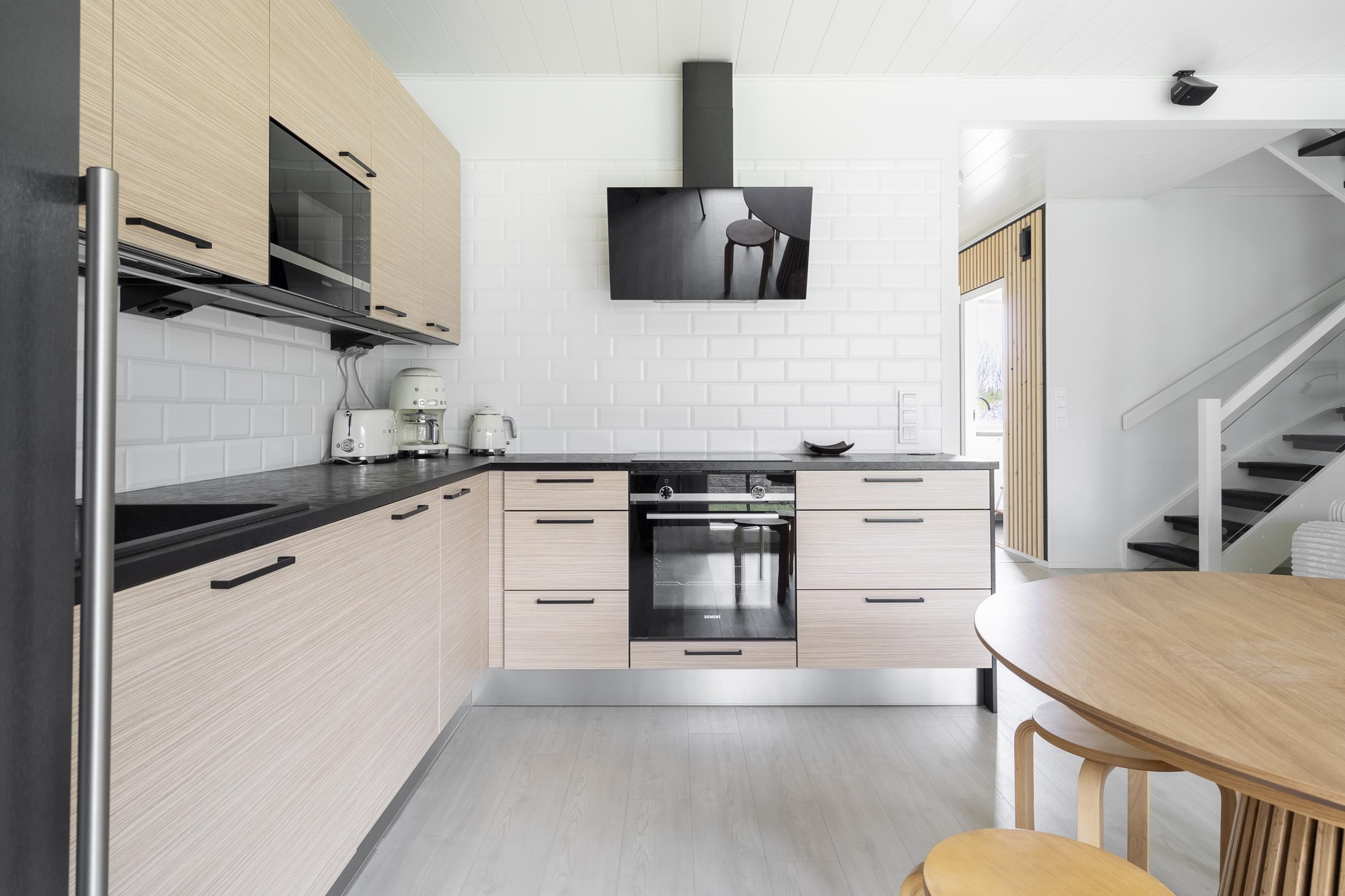 - Jääkaappi, pakastekaappi, erillisuuni, induktioliesi, liesituuletin Suodatinmalli, mikroaaltouuni Integroitu, astianpesukone, kiinteät valaisimet Himmennettävät led valot katossa.