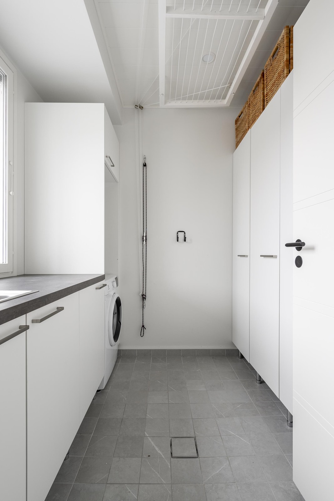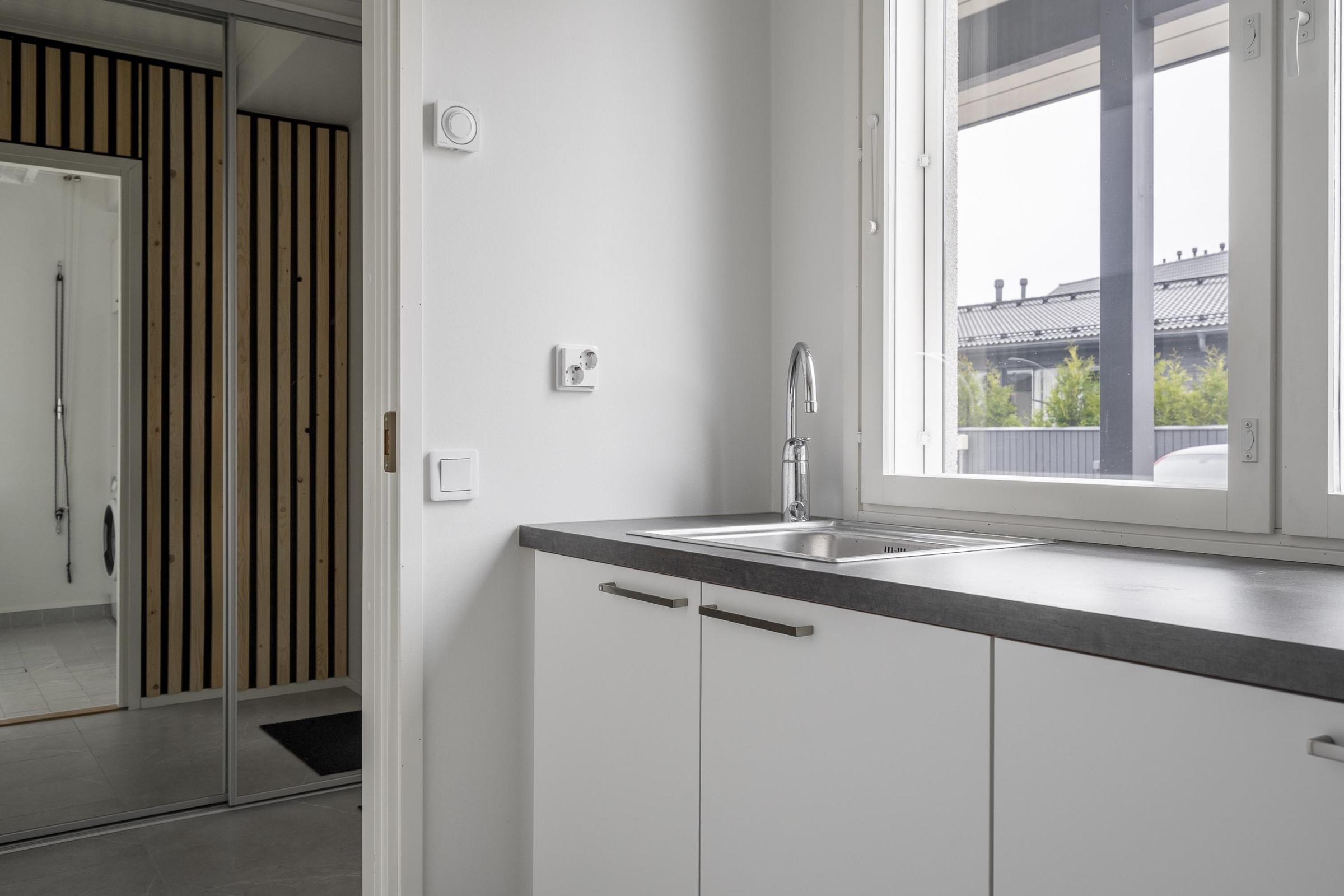 Tilavan eteisaulan yhteydessä on perheiden ykköstarve, tilava ja hyvin suunniteltu kodinhoitohuone mainioin ratkaisuin. Kodin sydämenä toimiva avara olohuoneen ja keittiön yhdistelmä joka huokuu lämpöä ja modernia kodikkuutta. Valoa tulvii sisään suurista ikkunoista, suuren liukuoven kautta pääset lasitetulle terassille jonka jälkeen suojaiselle pihalle. Puustellin upea, tehokas ja toimiva moderni keittiö jättää tilaa isollekin ruokailuryhmälle. Olohuoneen puolella on hyvin tilaa oleskeluun, musiikin ja elokuvien ystäville on valmiiksi vedetty katon sisäiset takakaiutinjohdot. Koko alakerrassa on miellyttävä vesikiertoinen lattialämmitys, jonka lämmönlähteenä toimii taloyhtiön taloudellinen vesi-ilmalämpöpumppu. Alakerrassa on myös tilava kylpyhuone ja sauna joissa integroitu Bluetooth- äänentoisto.